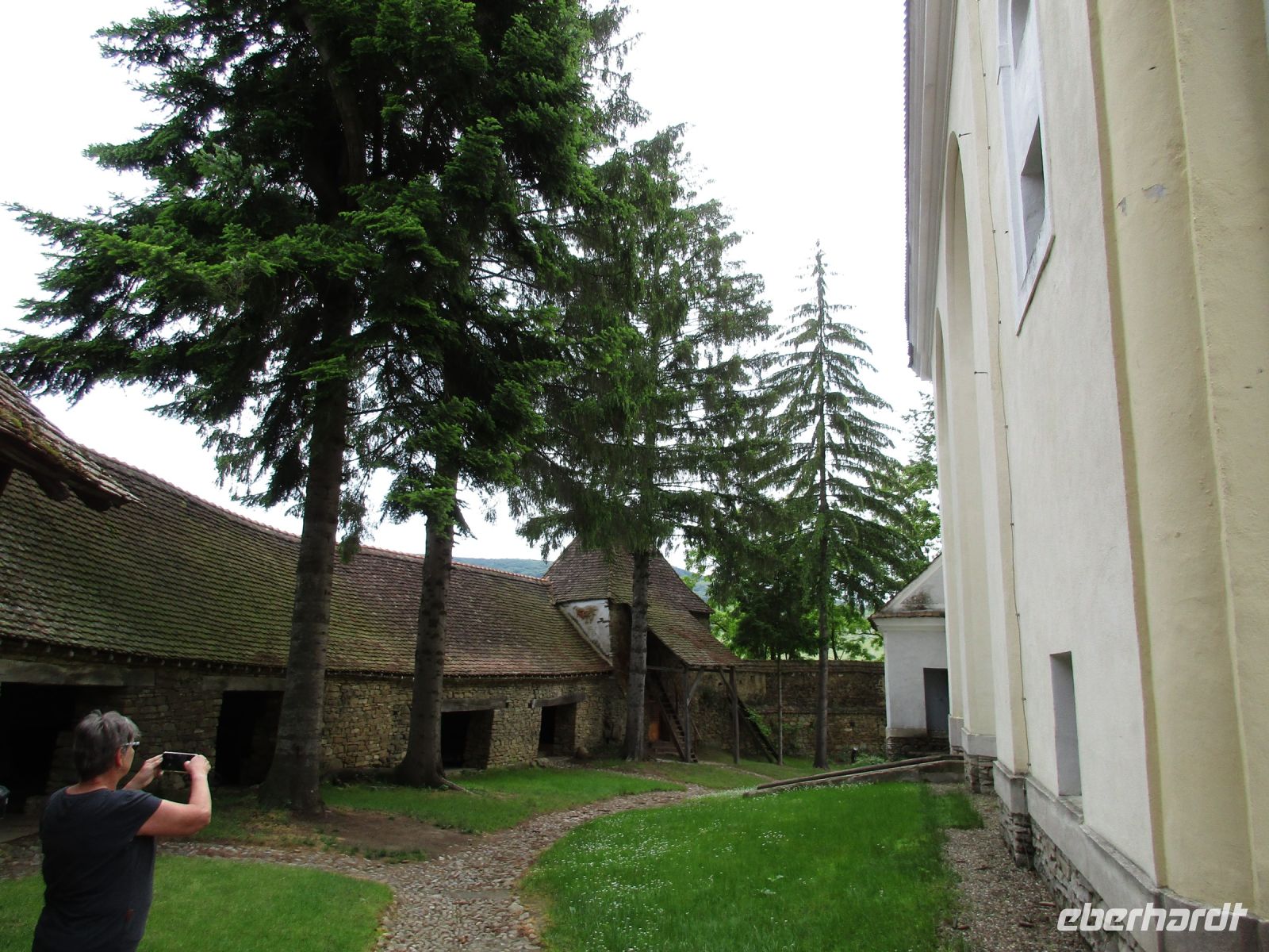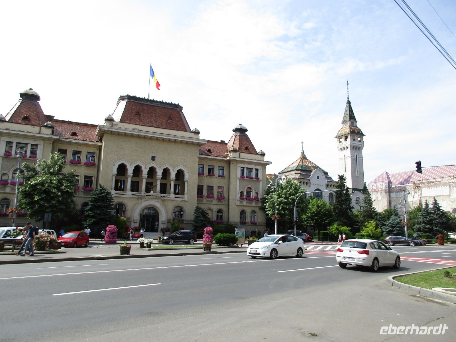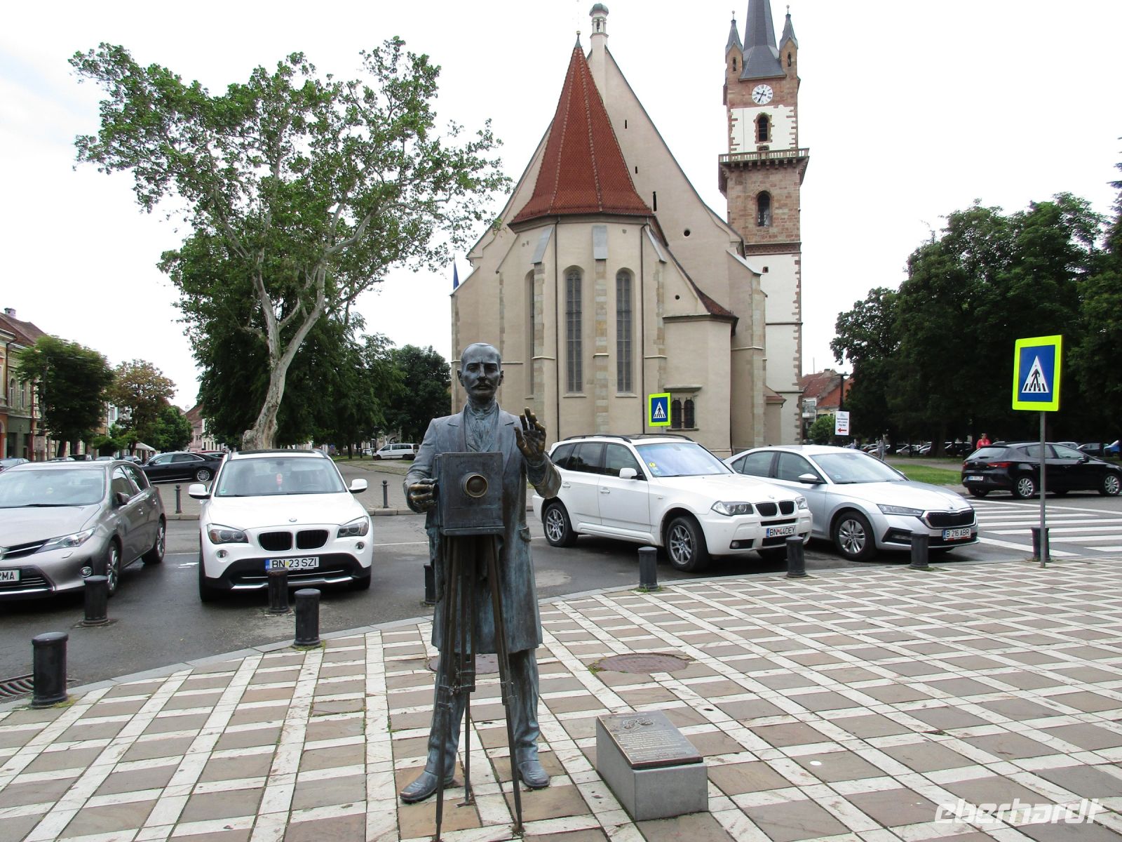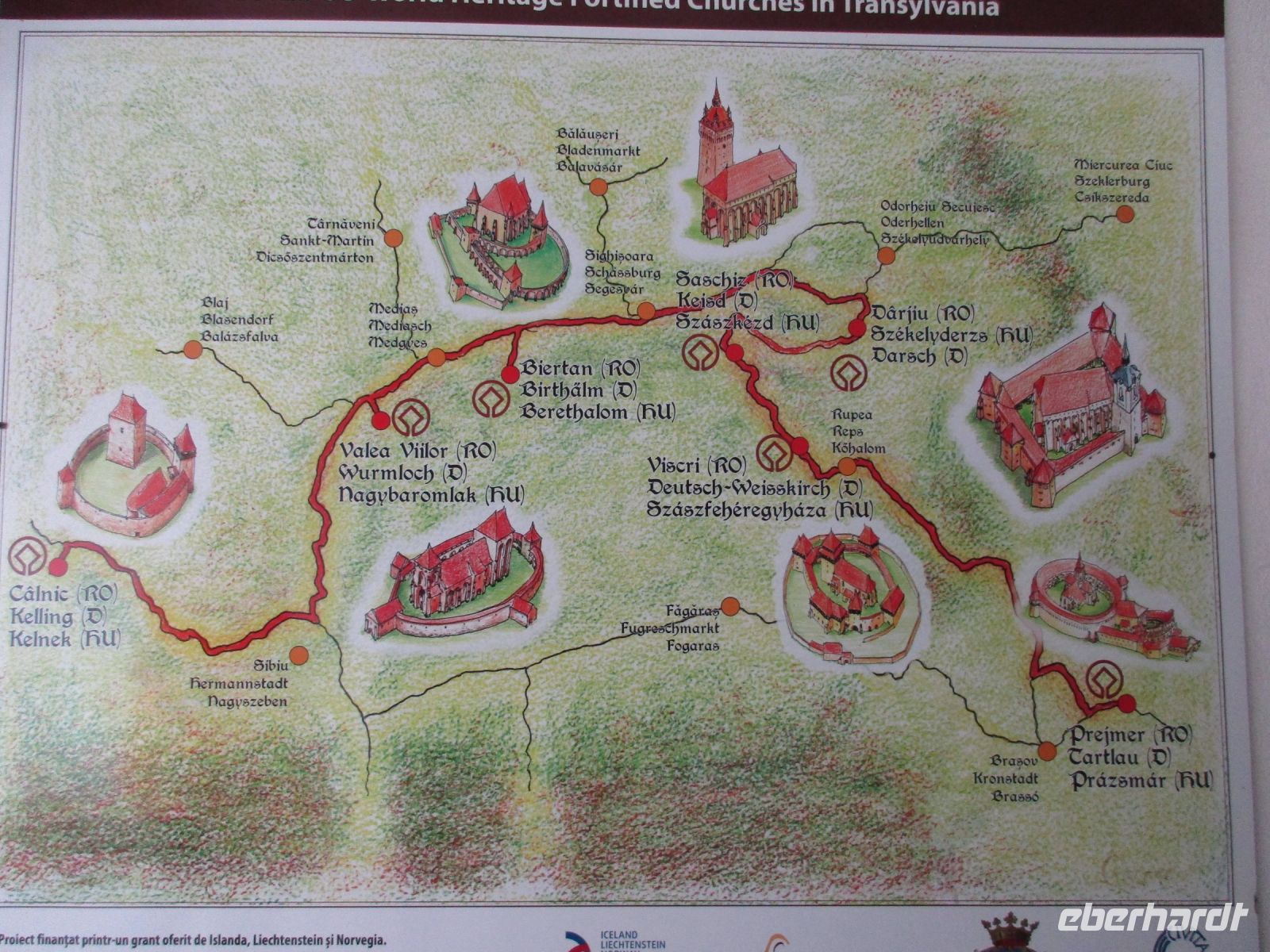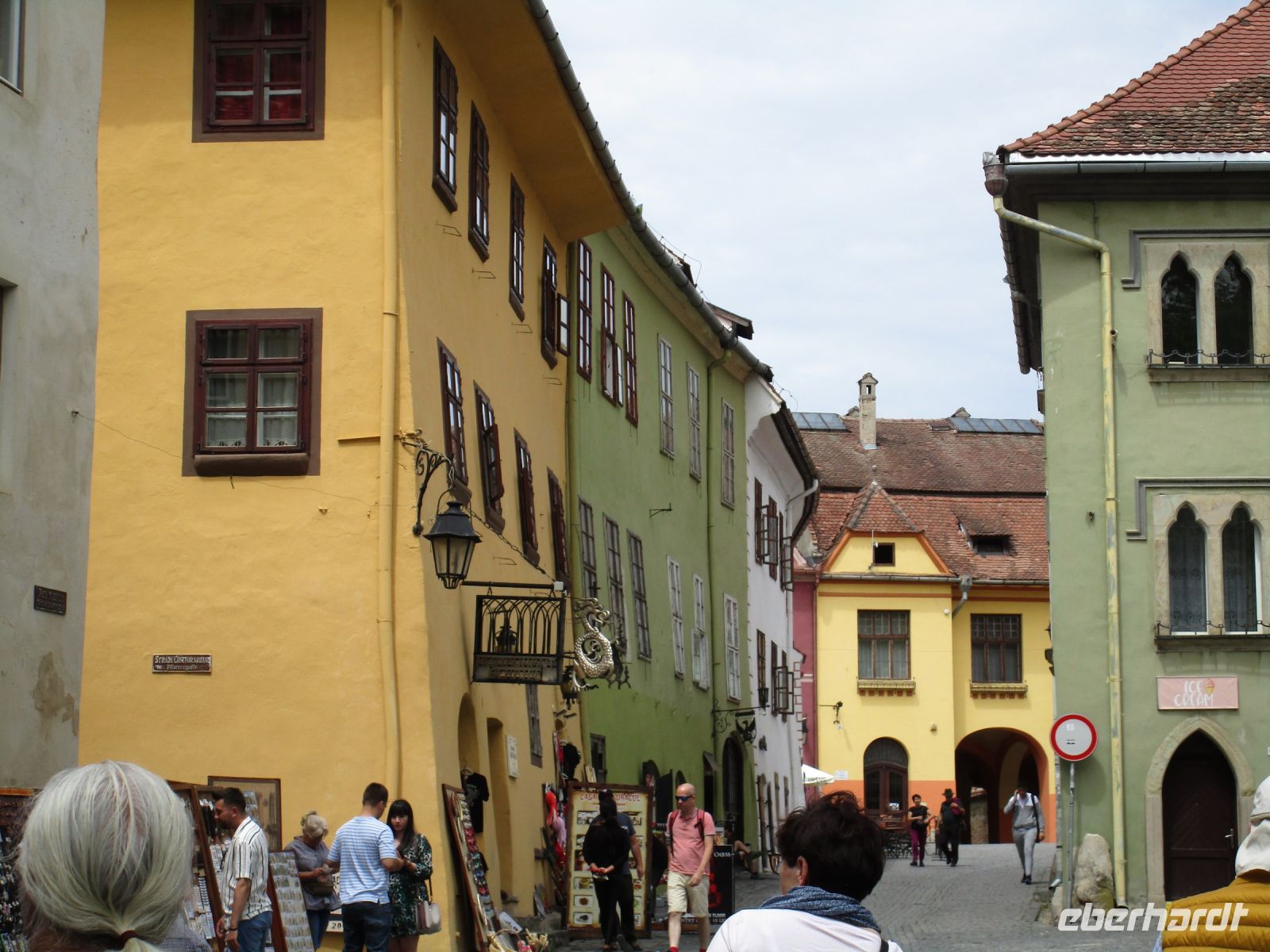 Nach einem kräftigen Frühstück geht es heute wieder mit unseren Koffern weiter Richtung Bistrita. Auf unserem Weg dorthin sehen wir nur noch Ausläufer der Karpaten, dafür wunderschöne Bergwiesen und verschlafene Dörfer wie im Märchen. In einem legen wir einen Stopp ein. Wir sind in Crit, auf Deutsch auch Deutsch-Kreuz genannt. Die Bauernhäuser liegen langgestreckt auseinander und breite Wege führen uns zur Kirche und zum Gasthaus Kraus, das auf einem Hügel mit wunderbarer Aussicht liegt. Einige Gäste versuchen sich an der Tischtennisplatte, andere fotografieren den lauschigen Ort. Auch hier gibt es natürlich eine Wehrkirche mit Ringmauern. Die Kirche ist sehr schlicht, aber liebevoll dekoriert. Eine Liste an der Wand erinnert an die Vertriebenen und Gestorbenen. Nach der Wende ist die Mehrheit der deutschsprachigen Einwohner nach Deutschland ausgewandert. Geblieben sind Roma-Familien, die hier bestgeeignete Bedingungen vorfinden. Uns gefällt der Ort mit seiner prägenden sanften Landschaft. Uns fällt auf, dass es den Störchen in dieser Gegend auch sehr gut gefällt. Jedes Dorf verfügt über mehrere Storchennester. Weiter geht es nach Sighisoara, auch Schäßburg genannt, das seit 1999 zum UNESCO-Weltkulturerbe gehört. Lateinisch hieß die Stadt um 1280 „Castrum Sex“, was auf die Einteilung in sieben Burgen hinweist. Auf der Stadtmauer der Oberstadt befanden sich einst 14 Türme. Angeblich soll jede Zunft für den Bau und den Betrieb eines Turmes verantwortlich gewesen sein. So gibt es den Zinngießerturm, den Schneiderturm, den Eisenschmiedeturm oder den Fleischerturm. Von hier aus bewachte man die Stadt und schützte sie vor den Türken. Sighisoara liegt an der Großen Kokel und besteht aus Oberstadt und Unterstadt. Sie liegt im Kreis Mures, aber immer noch in Siebenbürgen. Hier leben etwa 28 Tsd. Menschen. Der Ort wird nach dem Roman von Bram Stoker eng mit Dracula in Verbindung gebracht, der hier etwa 5 Jahre lang gelebt haben soll. Davon zeugen sein Geburtshaus :)) und eine Statue. Vlad Tepes (Vlad III. Draculea, der Pfähler) war Sohn des Vlad II. Dracul, der Drache. Gegen den Bau eines Dracula-Freizeitparkes hat sich die Bevölkerung vehement gewehrt. Wir meinen, der Dracula-Kult reicht auch so schon. Ich habe mich im Dracula-Haus, wo der Vlad im Sarg liegt und Besucher erschreckt, nett mit ihm unterhalten und zum Abschied „Ruhe sanft“ hat er mir zugewunken. Ein schönes Wahrzeichen der Stadt ist der Stundturm mit Wetterhahn, Uhr und seinem Eingangstor. Er trennt die Oberstadt von der Unterstadt und ist wegen seiner Höhe von 64 m kaum zu übersehen. Wir wollen ja hoch hinaus und erklimmen die gegen Regen und Eis überdachte Schülertreppe aus dem 17. Jhd,, die über 172 Stufen zur berühmten Bergschule, dem Josef-Haltrich-Lyzeum, führt. Die Evangelische Kirche neben der Schule ist geschlossen und so spazieren wir über den malerisch gelegenen Friedhof am Berghang wieder zurück. Nachdem wir alles Wichtige besucht haben und uns gestärkt haben, bringt uns Laurentiu Richtung Targu Mures. Hier leben ungefähr 116 Tsd. Einwohner. Wir erreichen Neumarkt am Mieresch, die Heimatstadt von Zoltan, bei strahlendem Sonnenschein und blauem Himmel, was die schönen Blumenanlagen noch eindrucksvoller präsentiert. Vorbei am Rathaus im Brancoveanu-Stil und der katholischen Kirche gelangen wir zum Kulturpalast. Durch unscheinbare Baugerüste erreichen wir den Kulturpalast der Stadt, der zu Beginn des 20. Jhd. im ungarischen Jugendstil erbaut wurde. Prachtvolle Fenster, viele Mosaike und farbenprächtige Wandgestaltungen im Inneren lassen uns den Atem stocken. Es ist einfach nur schön. Der Kulturpalst beherbergt die Bibliothek und das Museum des Kreises Mures sowie die Staatsphilharmonie. Gerade gibt es eine temporäre Ausstellung privater Gemälde, die wir uns ansehen. Danach spazieren wir zur imposanten orthodoxen Kirche, die zwischen 1925 und 1934 erbaut wurde, und Zoltan führt uns bei der Innenbesichtigung. Der Baustil ist etwas eigen, was auch daran liegt, dass sie erst nach dem Anschluss an Rumänien gebaut wurde und nur über eine kurze eigene Geschichte verfügt. Dennoch ist sie unbedingt sehenswert. Nun verlassen wir die hübsche Stadt und fahren nach Bistrita, wo wir am frühen Abend ankommen. Unser 4-Sterne-Hotel liegt in der Nähe eines Gewerbegebietes, was gar nicht so ungelegen ist für kleine Einkäufe. Nach dem Abendessen erholen wir uns gut und genießen eine gute Nacht.