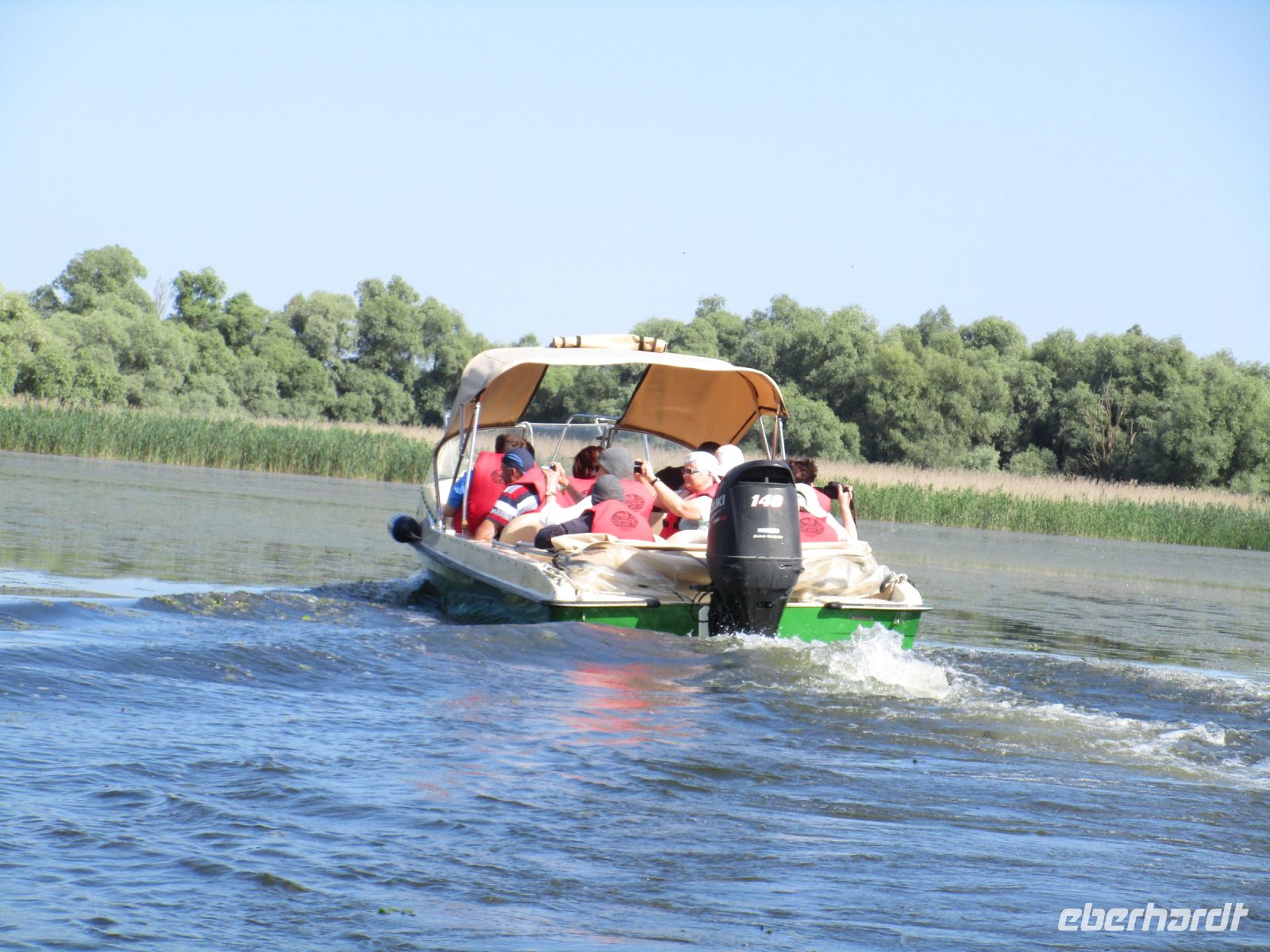 Heute haben wir eine besonders lange Tour vor uns, deshalb wird ordentlich vom Frühstücksbüffet gefrühstückt. Dieses Hotel war wirklich Extraklasse und wir sind nun gespannt, was uns in Tulcea erwartet. Heute haben wir ein Geburtstagskind an Bord und wir lassen es erst einmal hochleben. Happy birthday! Die Landschaft wird immer flacher. Zoltan organisiert für uns wieder ein köstliches Mittagessen in einem hübschen Lokal an der Strecke und erzählt uns kurzweilig viel über das soziale Leben in Rumänien. Die Fähre in Tulcea setzt uns am Nachmittag problemlos über und so erreichen wir unser 4-Sterne-Hotel „Esplanada“ planmäßig. Kurze Pause und gleich geht es weiter zum Schnellboot. Wir hoffen, am späten Nachmittag besonders viele Vögel zu sehen. Nach dem Wolgadelta ist das Donaudelta das zweitgrößte Delta Europas. Rumänien und Ukraine teilen sich rein. 4.178 von 5.800 km² stehen unter Naturschutz, allerdings gehören 82, 5 % dieser Fläche zu Rumänien. Seit 1990 ist das Donaudelta ein Bioreservat. Wir fahren nach Mila 23, am Nebunu-See vorbei durch einige Kanäle, sehen außer Pelikanen, Graureihern, Kormoranen, Enten und Schwänen auch Frösche, Wasserschlangen und Unmengen von Insekten. Es gibt über 320 Vogelarten und 44 verschiedene Säugetiere. Hier scheint die Welt noch in Ordnung. Wir fahren zu den Fischern, bei denen es heute beim Abendessen natürlich frischen Fisch mit Mujdej gibt, dazu Mamaliga und zum Abschluss lassen wir unser Geburtstagskind noch einmal mit einem Glas Wein hochleben. Dazu gibt es auf der Rücktour einen unbeschreiblichen Sonnenuntergang. Wir erreichen unser schickes Hotel am frühen Abend und lassen diesen Tag gemütlich ausklingen.