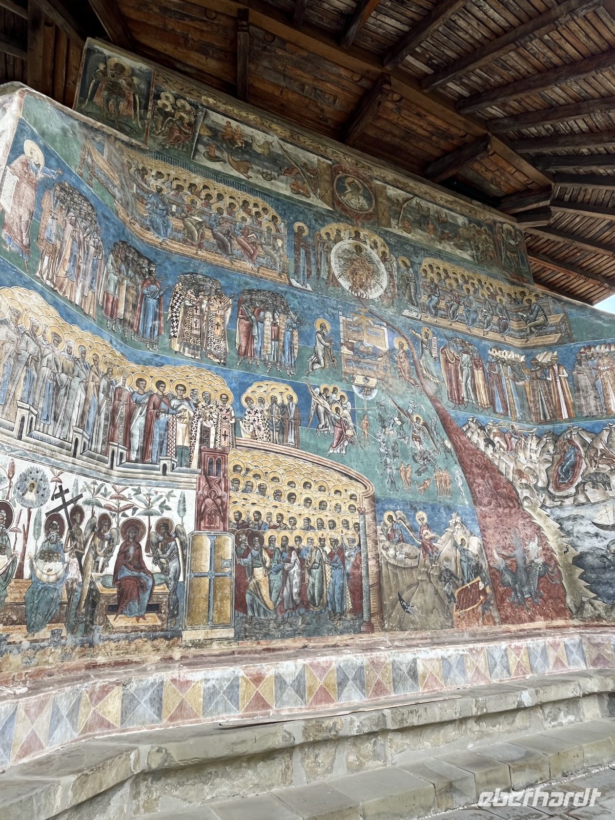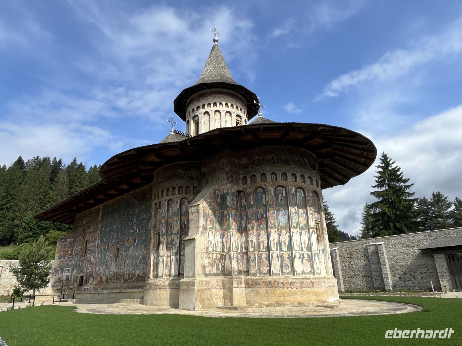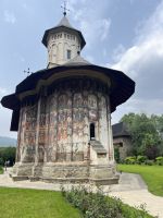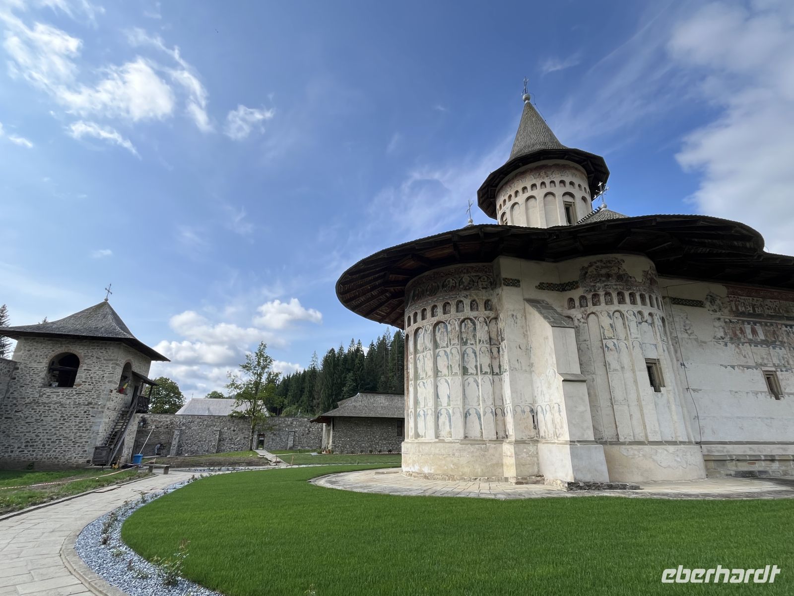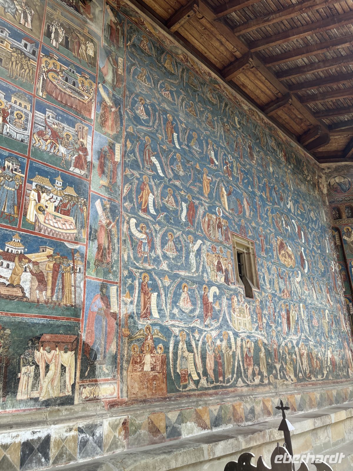 Der Tag begann ruhig und sonnig – perfekt für eine Entdeckungstour durch die Klosterwelt. Unser erster Stopp war das berühmte Kloster Voronet, oft als das „Sixtinische Kapelle des Ostens“ bezeichnet. Die tiefblaue Farbe der Wandmalereien – das sogenannte „Voronet-Blau“ – beeindruckte genauso wie die fein gearbeiteten Fresken mit ihren vielen Details. Wer genauer hinschaute, konnte ganze Geschichten aus der Bibel entdecken, kunstvoll auf die Fassade gemalt.