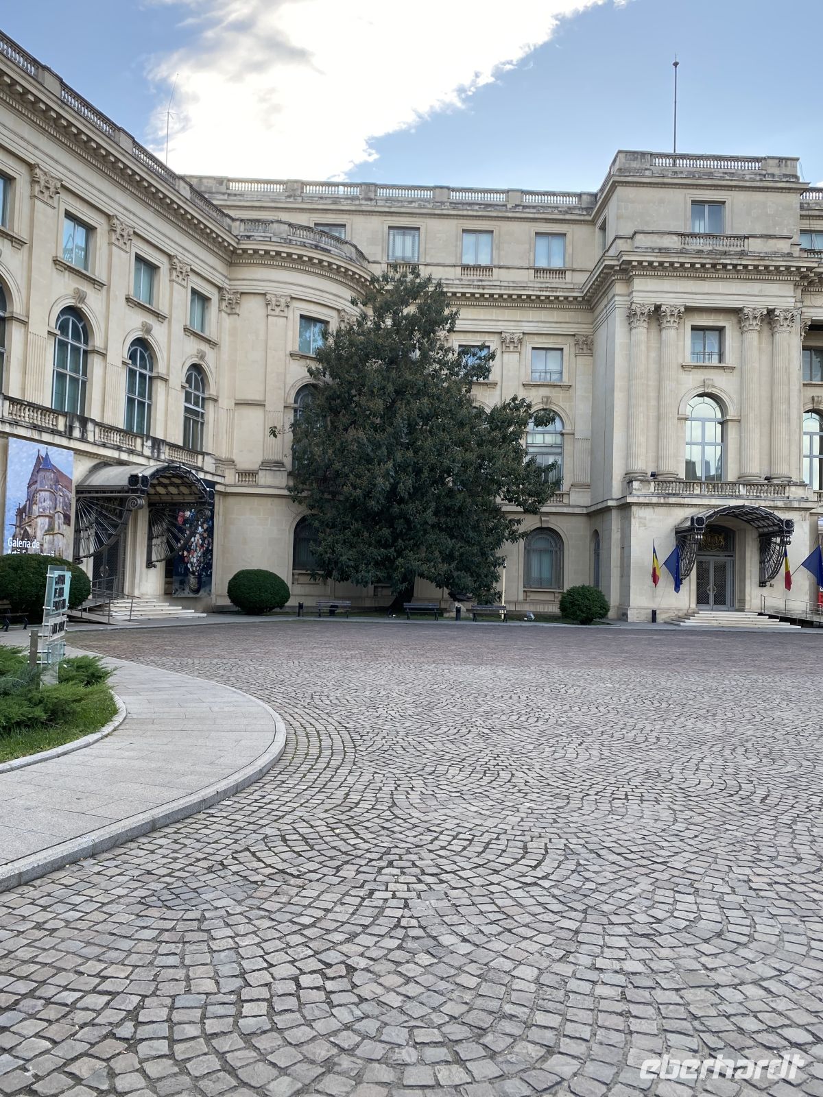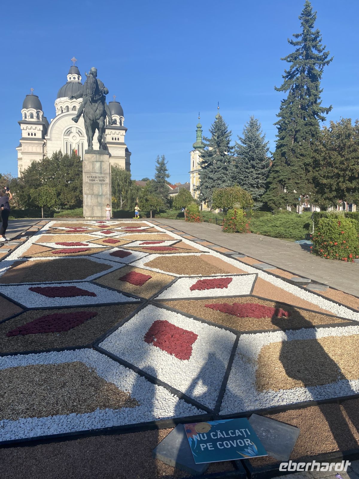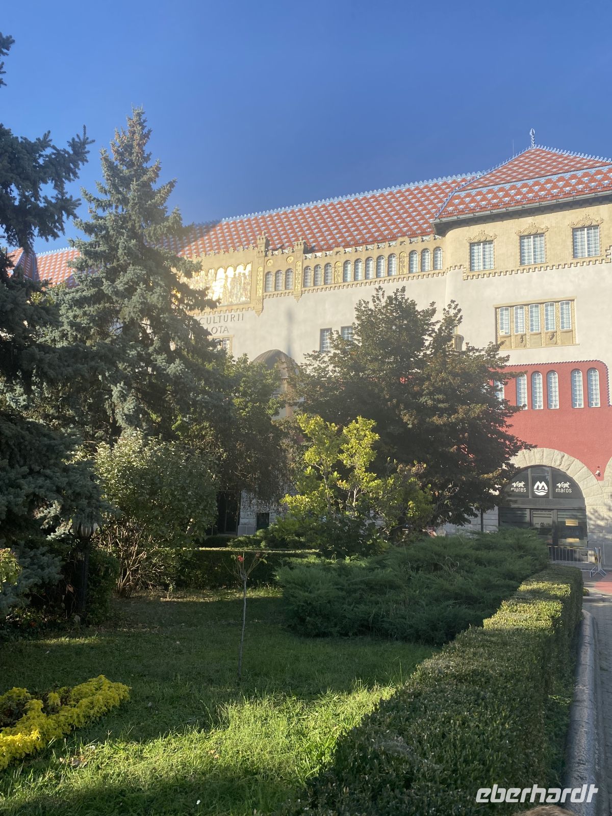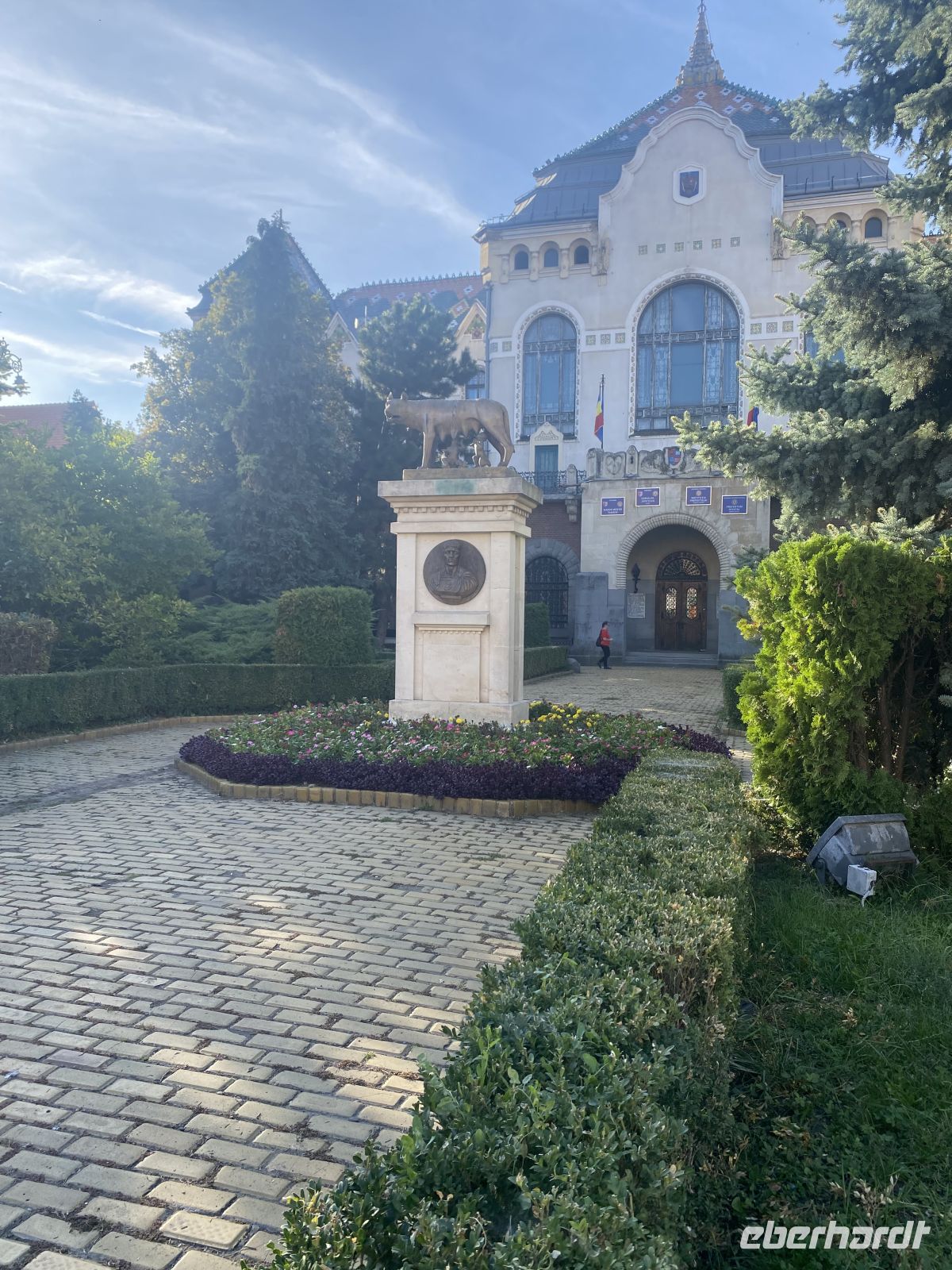 Auch von außen ist der Kulturpalast, erbaut zwischen 1911 und 1913 im rumänischen Jugendstil, sehr imposant mit seinem Dach aus Majolikaziegeln. Neben dem Kulturpalast steht das Rathaus und vor ihm gibt es eine Skulptur mit der römischen Wölfin, die ihre Zwillinge säugt,dies soll auf den römischen Ursprung der Rumänen hinweisen.