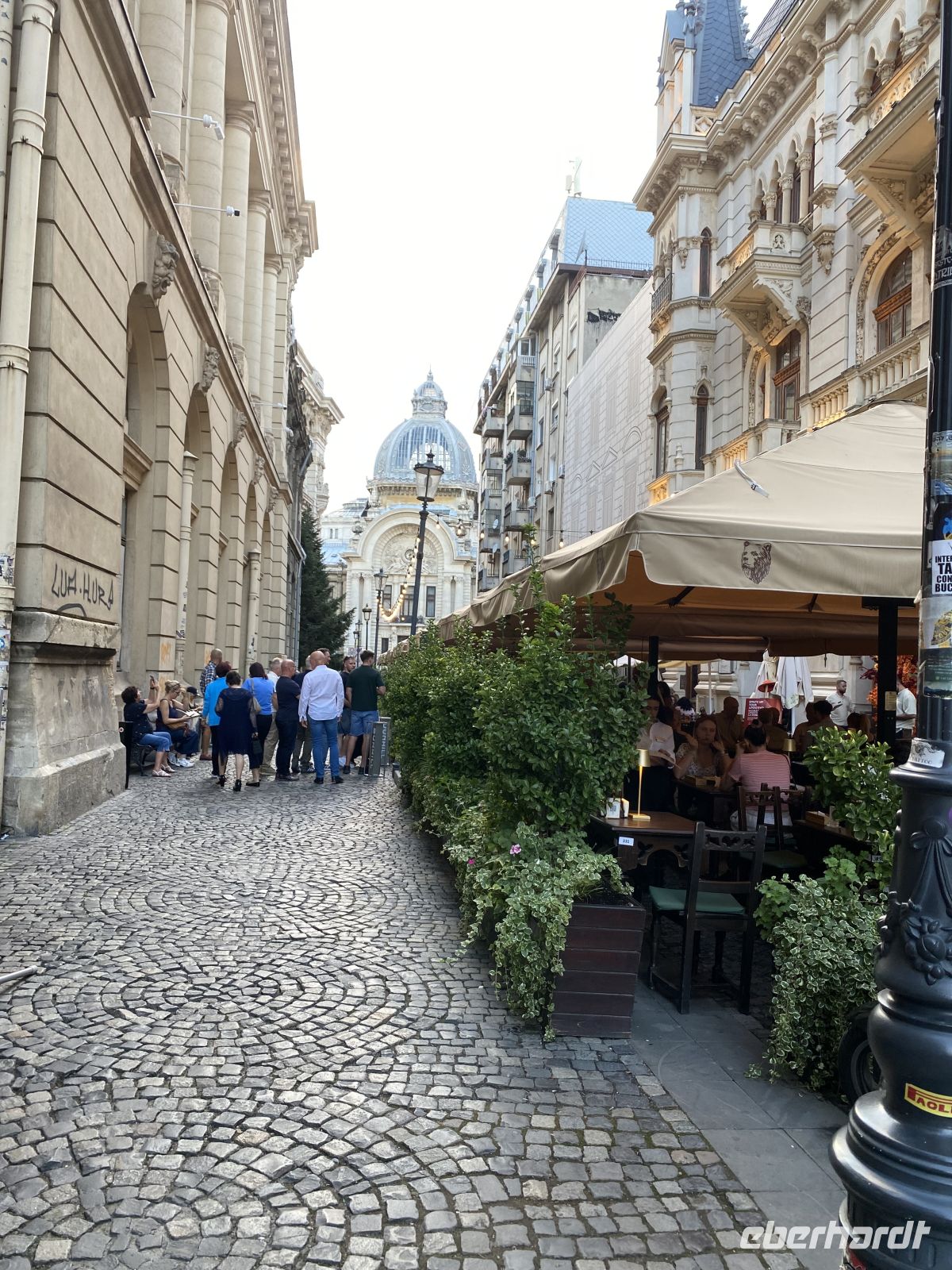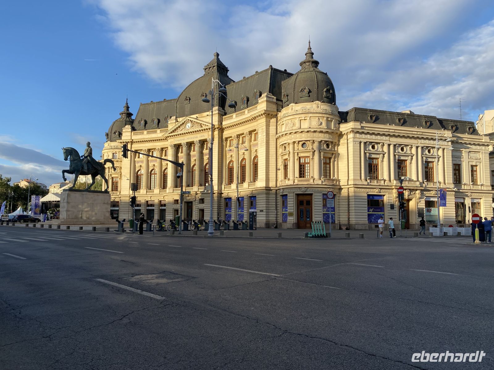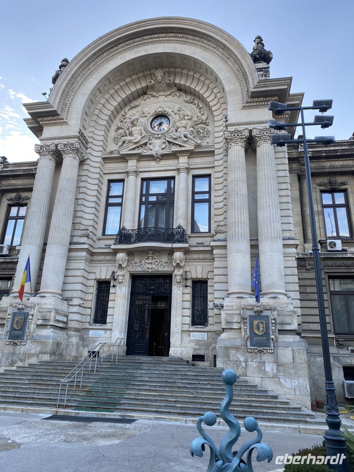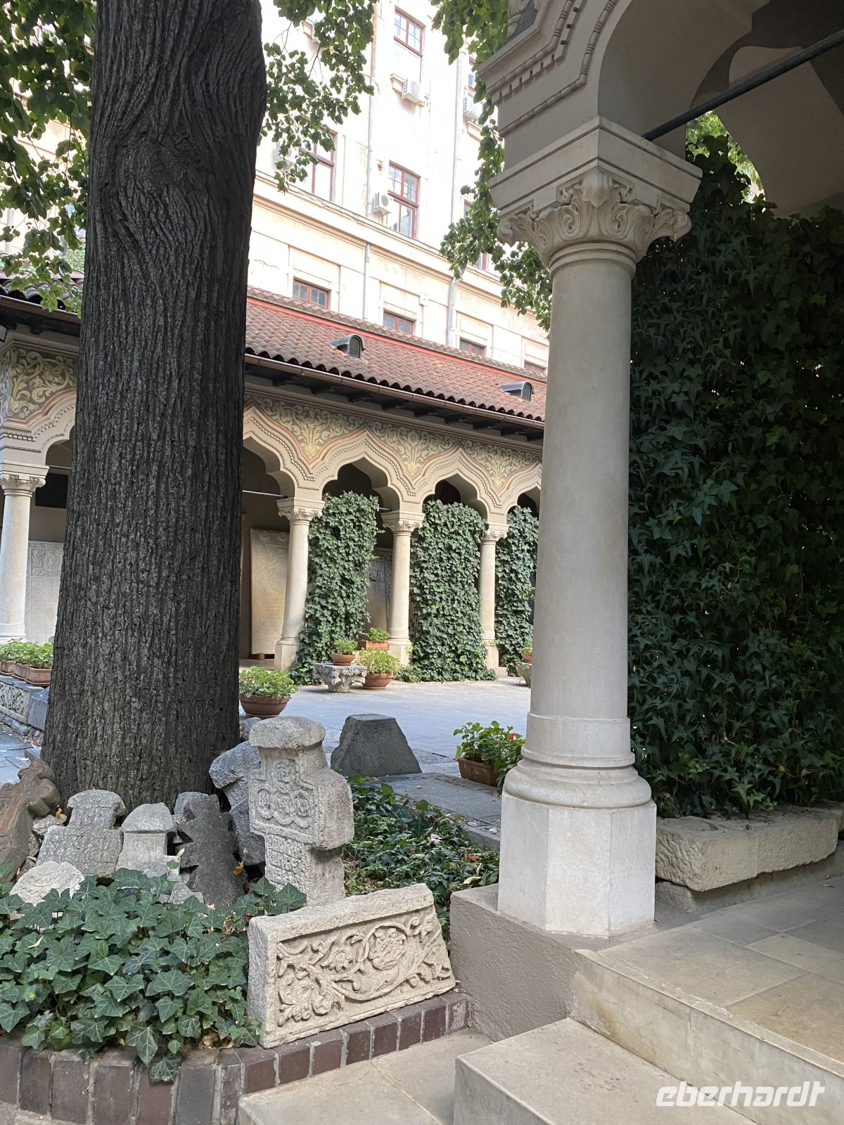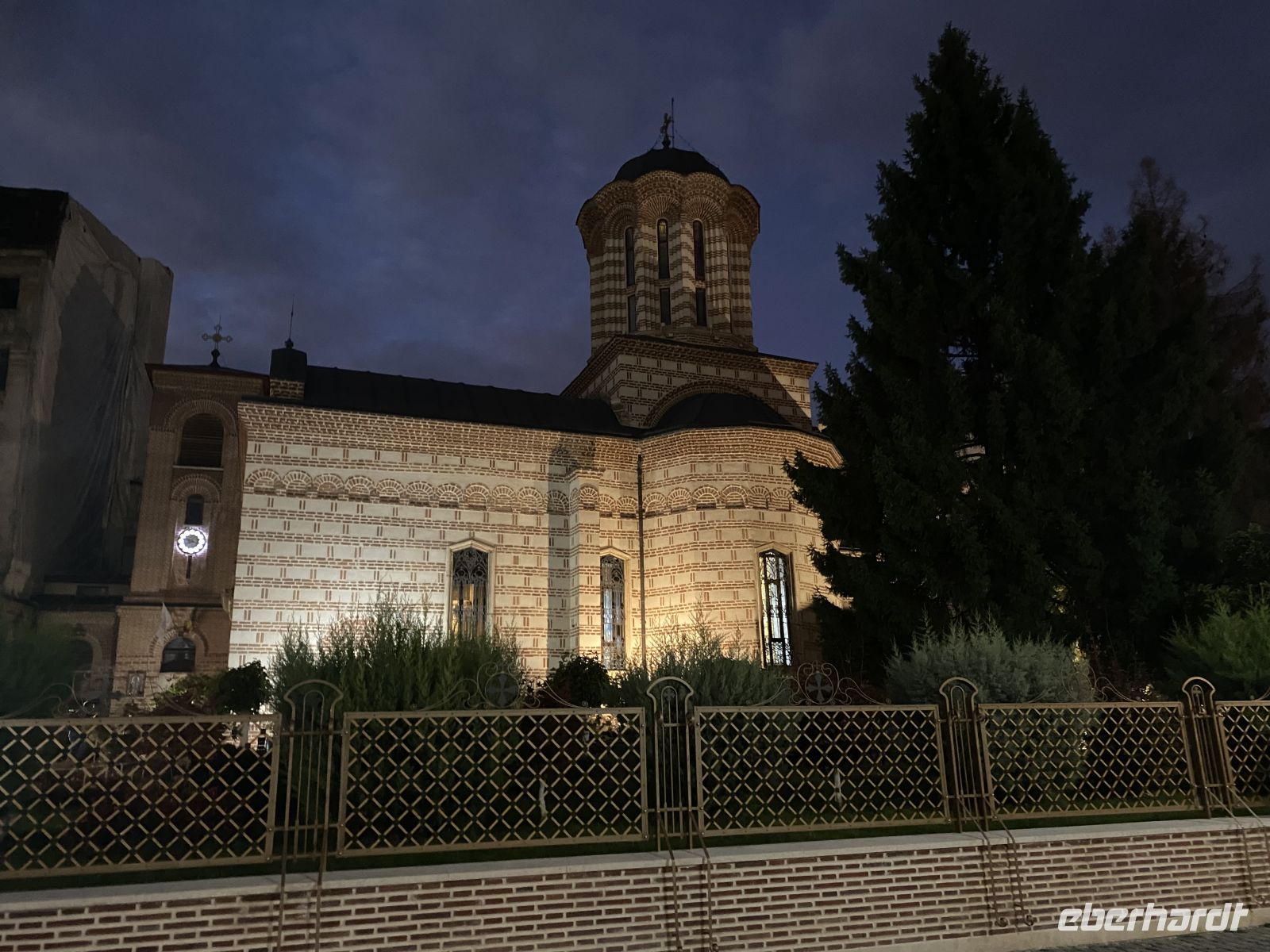 Für die meisten von uns begann der Tag recht früh, in München traf sich die Gruppe zu gemeinsamen Weiterreise nach Bukarest. Nach einer kleinen Erholungspause erkundeten wir die Hauptstadt zu Fuß. Wir hören von unserem Gästeführer Ewald, das Bukarest der Legende nach von einem Hirten namens Bucur gegründet wurde und dass daher der Name der Stadt kommt. Wahrscheinlicher ist, dass die Kreuzung wichtiger Handelsstraßen den Impuls für die Ansiedlung gab. Vor allem im 17. und 18. Jahrhundert entwickelte sich die Stadt schnell zu einem bedeutenden Handelszentrum und mit der Vereinigung der beiden Fürstentümer Walachei und Moldau im 19. Jahrhundertwurde Bukarest zur Hauptstadt. Dies löste einen regelrechten Bauboom aus, es entstanden prächtige Bürgerhäuser und repräsentative öffentliche Gebäude. Davon können wir uns bei der Stadtbesichtigung überzeugen, wir sehen das großzügige Sparkassengebäude, das Schloss, die Universitätsbibliothek und das Hotel Hilton. In der Leipziger Straße entdecken wir das Gebäude der Rumänischen Nationalbank, danach suchen wir den Kontakt mit den himmlischen Mächten in der rumänisch-orthodoxen Kirche . In der Stavropoleos-Kirche, erbaut im 18. Jahrhundert im Brancoveanu-Stil.