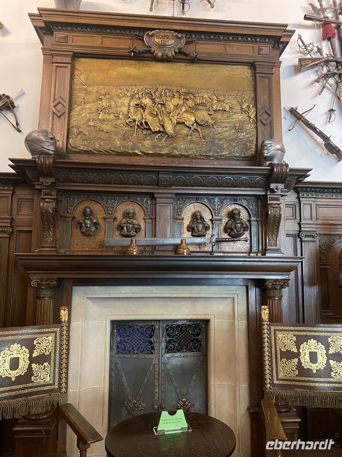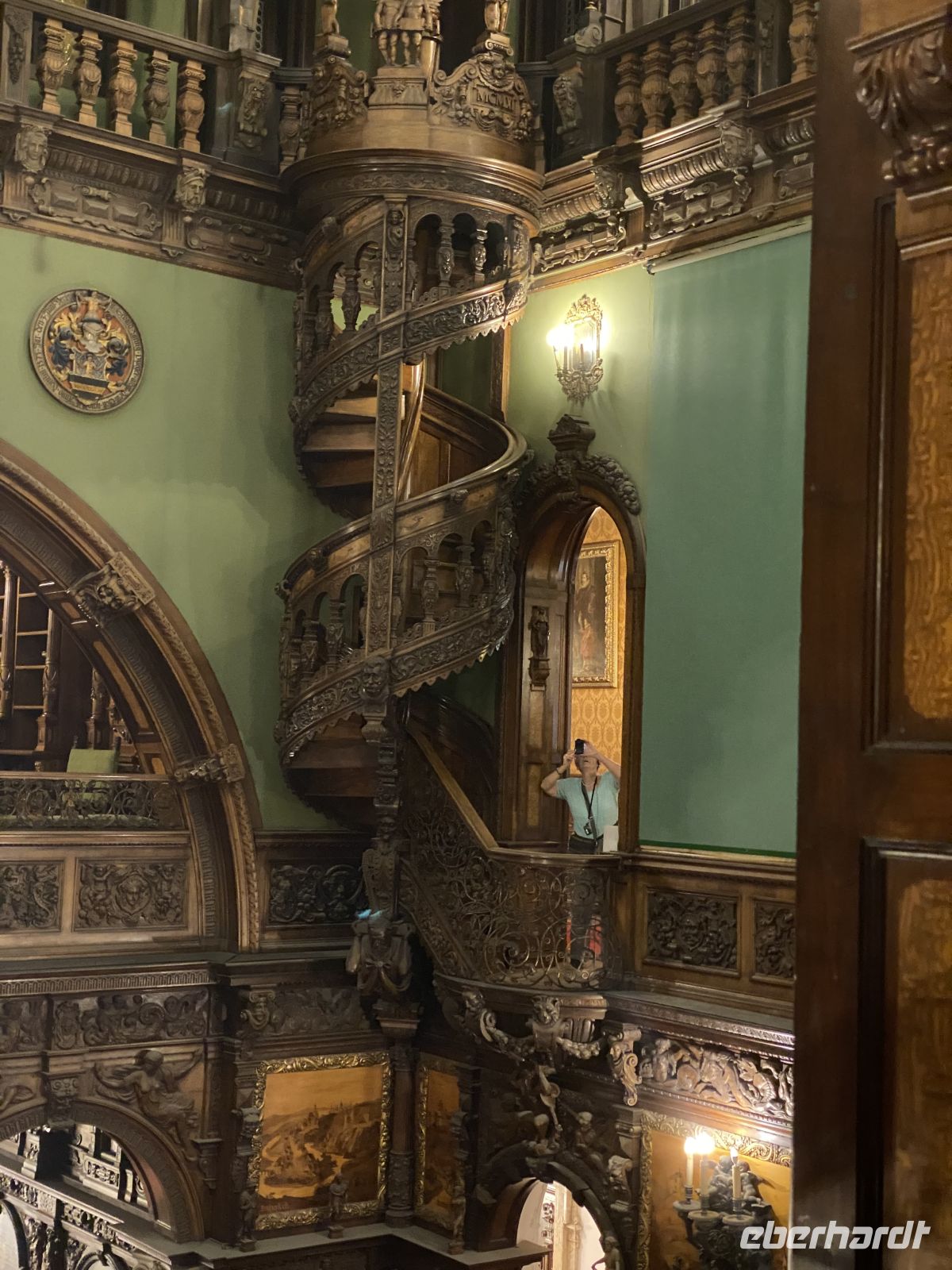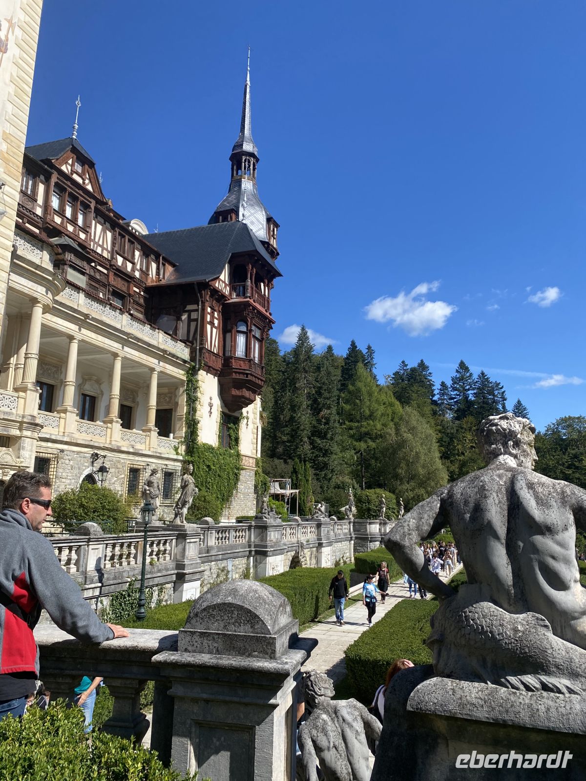 Aber endlich erreichen wir das hübsch gelegene Schloss Peles. Es wurde 1883 eingeweiht und war der beliebteste Sommersitz von Königin Elisabeth von Rumänien. Das Schloss besitzt 160 Räume, alle verschieden im Stil der deutschen romantischen Architektur eingerichtet. Einige Räume besichtigen wir und bewundern die feinen Holzarbeiten, die reichhaltige Bibliothek und die vielen Geheimtüren. Das Schloss war auch recht modern ausgestattet, hatte Stromanschluss, Telefon, fließendes Wasser und einen Staubsauger. Im Schlosstheater ziert ein Fries von Gustav Klimt die Wände, der rumänische König Carol I. war wohl auch mit dem Maler befreundet.