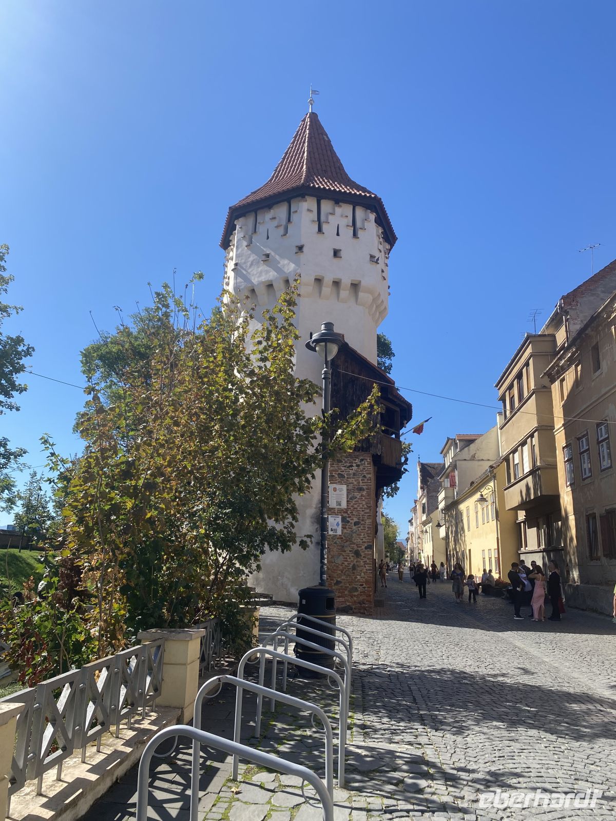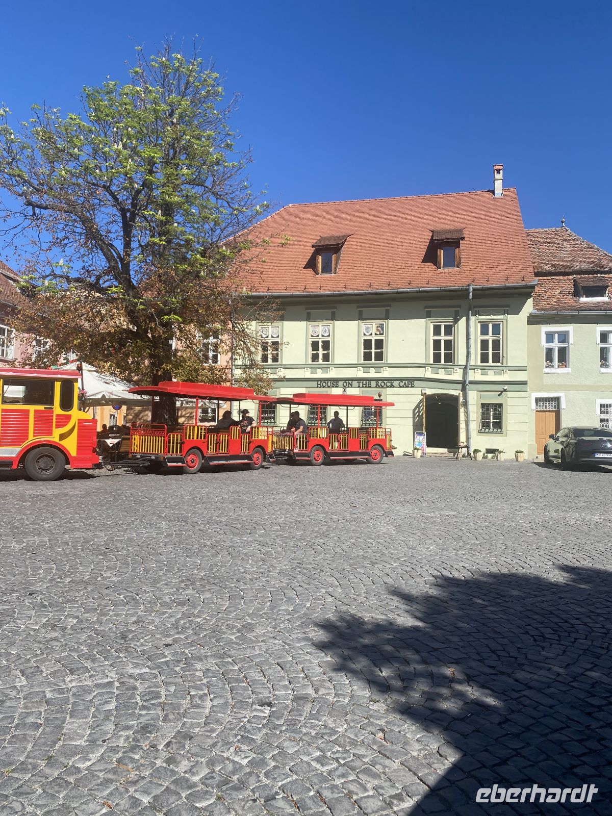 Die Stadt liegt malerisch im Tal der Großen Kokel und und weist eine gut erhaltene befestigte Altstadt auf und wir begeben uns in diese Oberstadt vom Parkplatz aus mit einer kleinen Touristenbahn. So können wir Kräfte sparen für den Stadtrundgang. Als erstes fällt der Stundturm ins Auge, er dominiert sowohl den Burgplatz als auch den Marktplatz und beherbergte früher das Rathaus, heute ist es ein Museum. Unter anderem wird darin an den Raumfahrtpionier Hermann Oberth erinnert, der in Sighisoara in die Schule ging.