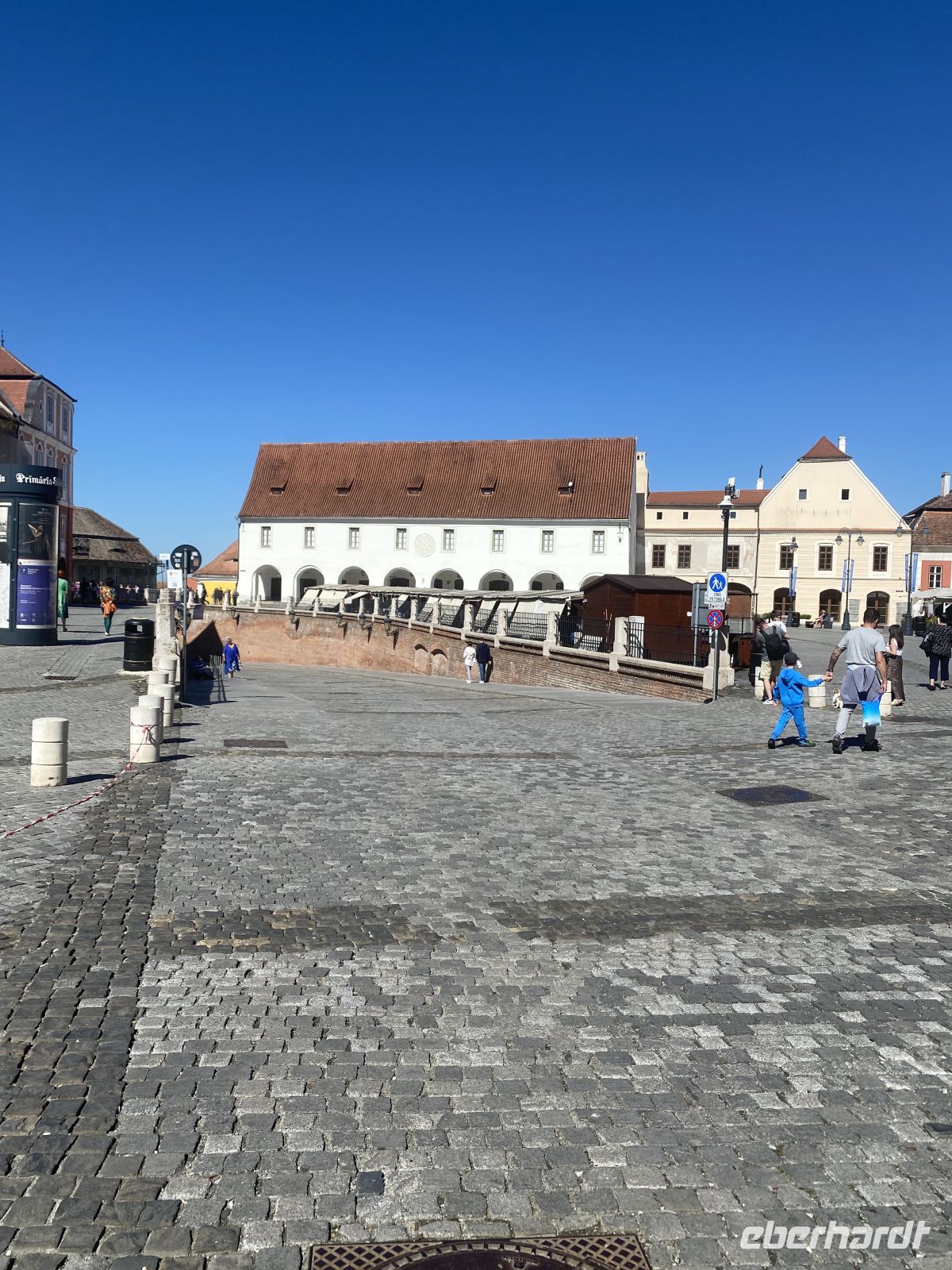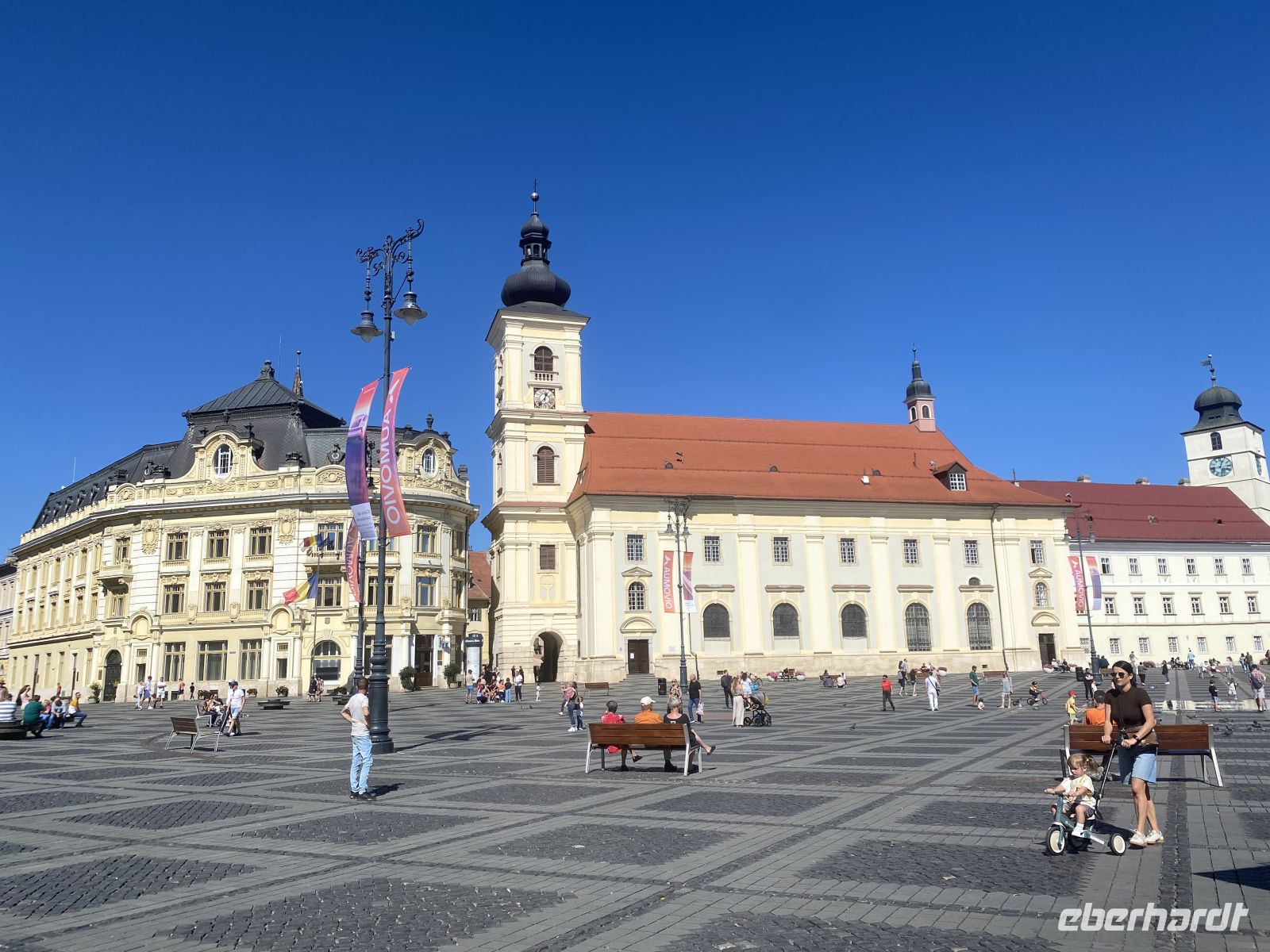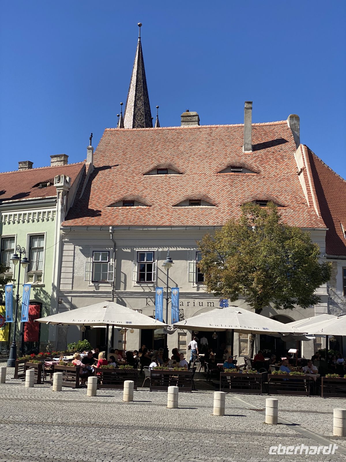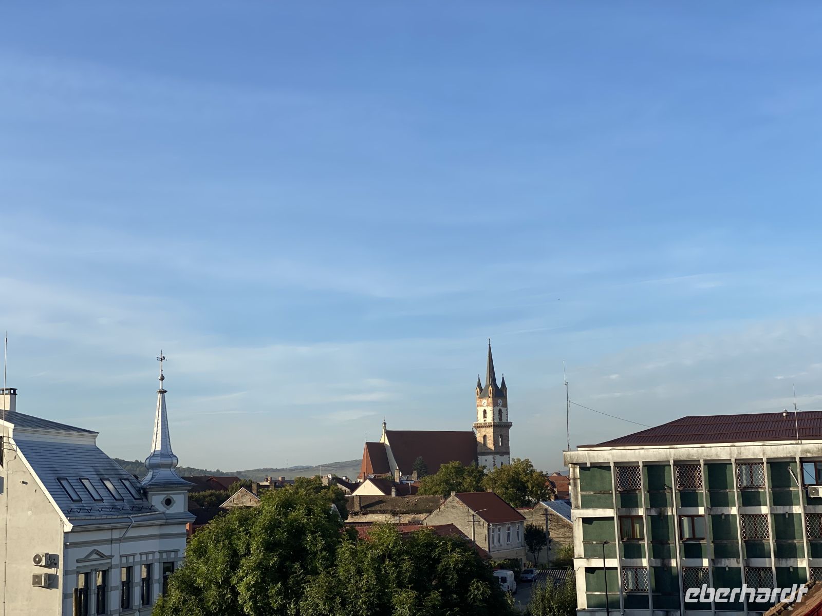 Gut ausgeruht starten wir zur Fahrt nach Sibiu. Unterwegs macht uns Gästeführer Ewald mit der Geschichte Siebenbürgens und der Siebenbürger Sachsen bekannt. Sibiu, zu deutsch Hermannstadt, war 2007 gemeinsam mit Luxemburg Kulturhauptstadt und das führte dazu, dass viele historische Gebäude aus der Blütezeit der Stadt umfassend restauriert wurden. In der Oberstadt gehen wir über den Großen Ring mit seinen schönen Gebäuden, dem Brukenthal-Palais, und der römisch-katholischen Kirche mit dem mächtigen Turm, der mit dem Ratturm korrespondiert. An ihm sehen wir eine Tafel zur Erinnerung an den Besuch von Prinz Charles im Jahre 1998. Auf dem Platz Huet stehen die Evangelische Stadtpfarrkirche , das Brukenthal-Gymnasium und das Denkmal für Georg Daniel Teutsch, der als Bischof die Kirche gegen die Ungarn vertrat. Wir wandern weiter über die Lügenbrücke zum Kleinen Ring, hier lebten früher vor allem die Handwerker, noch heute kann man ihre Zunfthäuser bewundern.