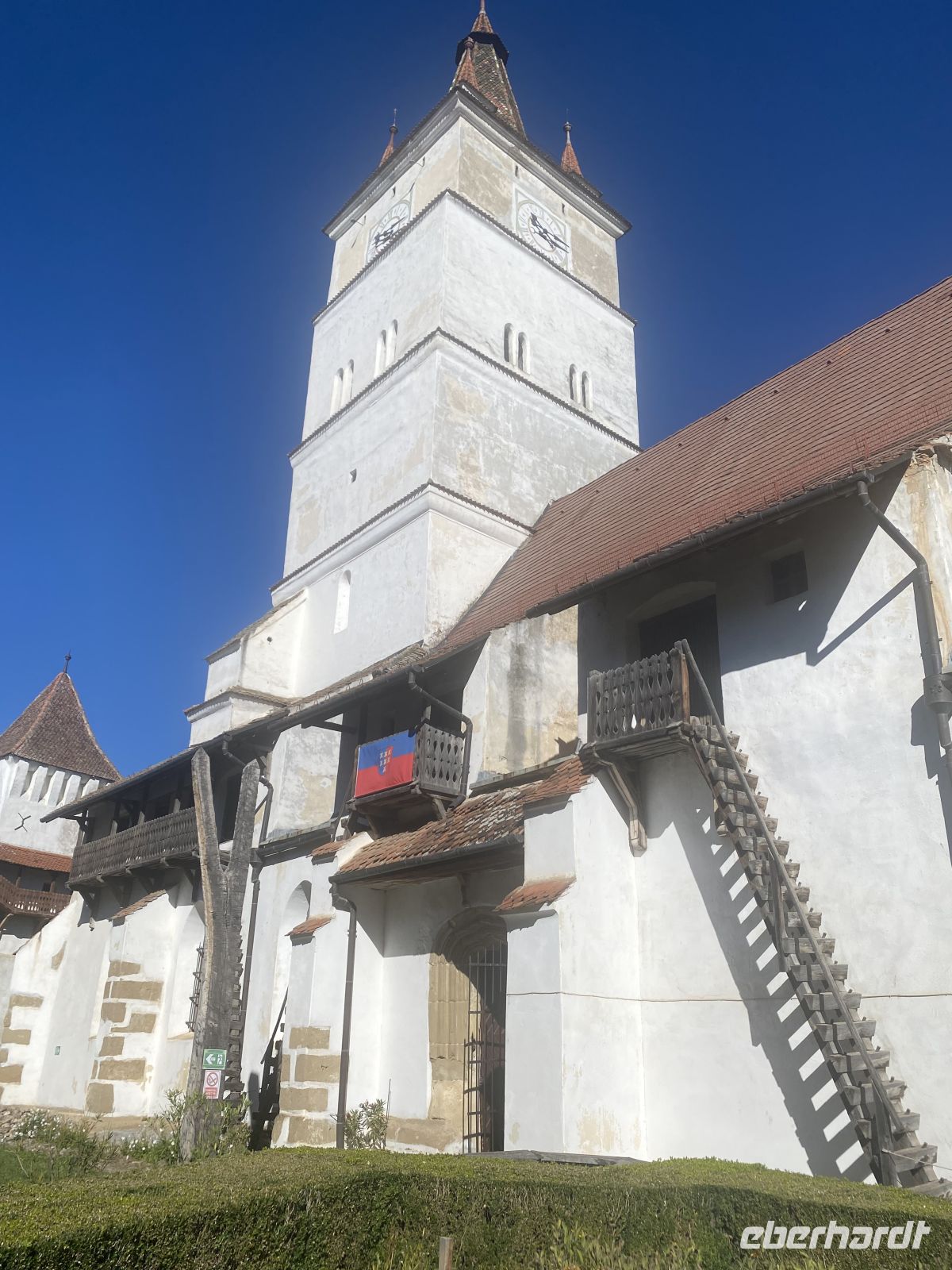 Wieder starten wir mit leichtem Gepäck, denn wir werden zum Übernachten nach Predeal zurückkehren. Das erste Ziel ist Harman (Honigberg) mit seiner interessanten Wehrkirche. Die Kirche geht auf das 13. Jahrhundert zurück, mehrfach wurde sie umgebaut und nach einem Brand erneuert. Über der Westempore hat sie zwei weitere Geschosse mit Schießscharten für die Verteidigung. Wie in vielen anderen Kirchen Siebenbürgens kann man orientalische Teppiche bewundern. Sie wurden von den Kaufleuten aus dem Orient mitgebracht und der Kirche als Opfergabe geschenkt. Um Belagerungen besser zu überstehen, konnte man in der Kirche Nahrungsvorräte aufbewahren, bekannt sind die Specktürme, in denen die Familien ihre Speckvorräte für den Winter unterbrachten.