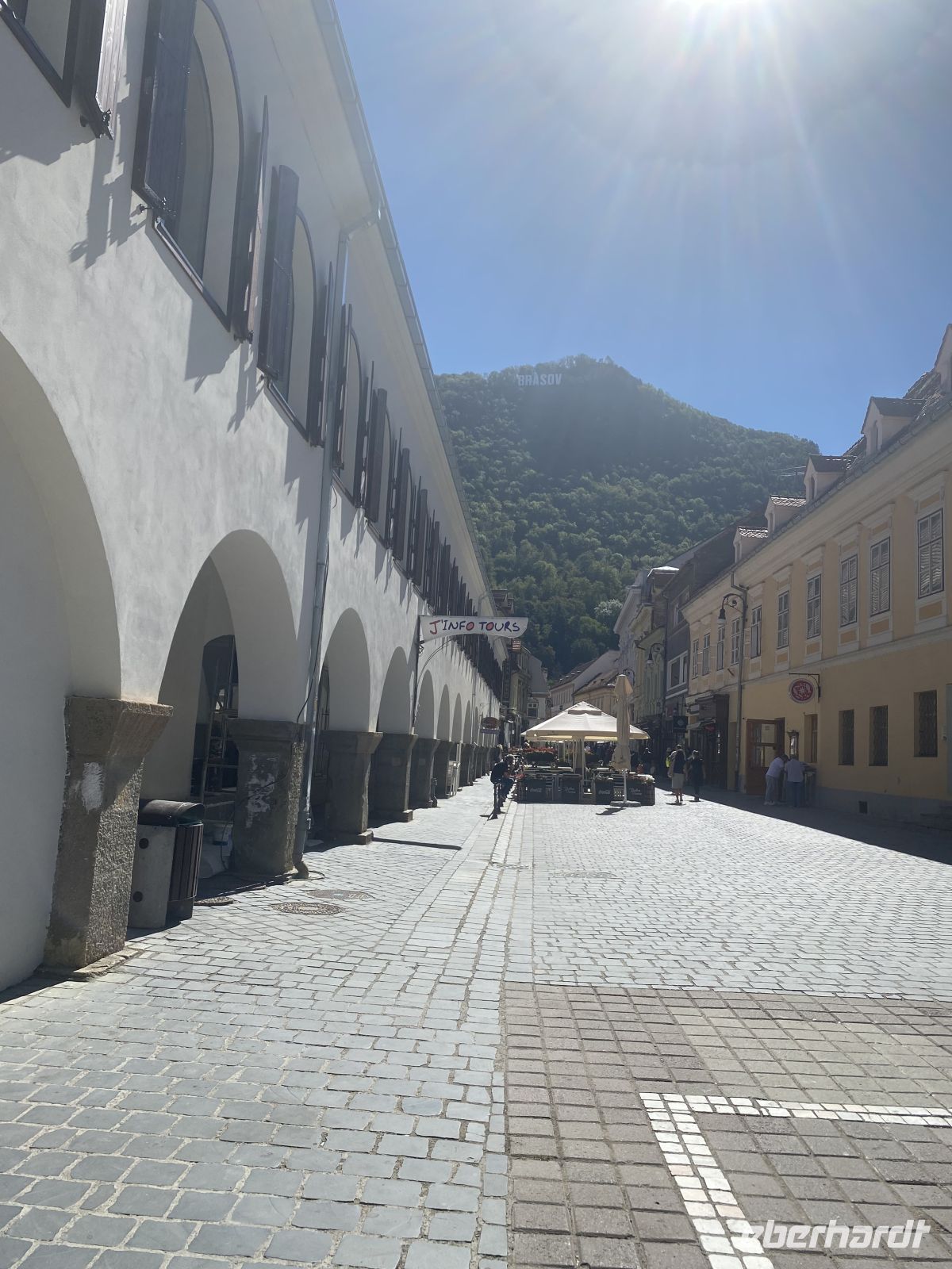 Um die Kirche herum sind zwei Ringmauern und ein Wassergraben zum Schutz vor Plünderungen angelegt, Reste eines dritten Mauerrings sind noch zu sehen. Beeindruckt vom schwierigen Schicksal der Siebenbürger fahren wir weiter in die Stadt Brasov (Kronstadt). Die Stadt ist eine Gründung des deutschen Ritterordens. Der Ritterorden war 1211 in das Burzenland gekommen um es gegen die Kumanen zu verteidigen. Er brachte Siedler mit und gründete befestigte Plätze, die zu Siedlungen wurden. Aber da er bald die auferlegten Grenzen überschritt, musste er das Land 1225 wieder verlassen. Brasov aber blieb und wurde zu einem wirtschaftlichen und geistigen Zentrum der Region. Beim Stadtrundgang sehen wir die Reste der Befestigungen, den schwarzen und weißen Turm. Die hübsche Fußgängerzone führt zum Marktplatz mit Rathaus und Uhrturm und schönen Kaufmannshäusern.