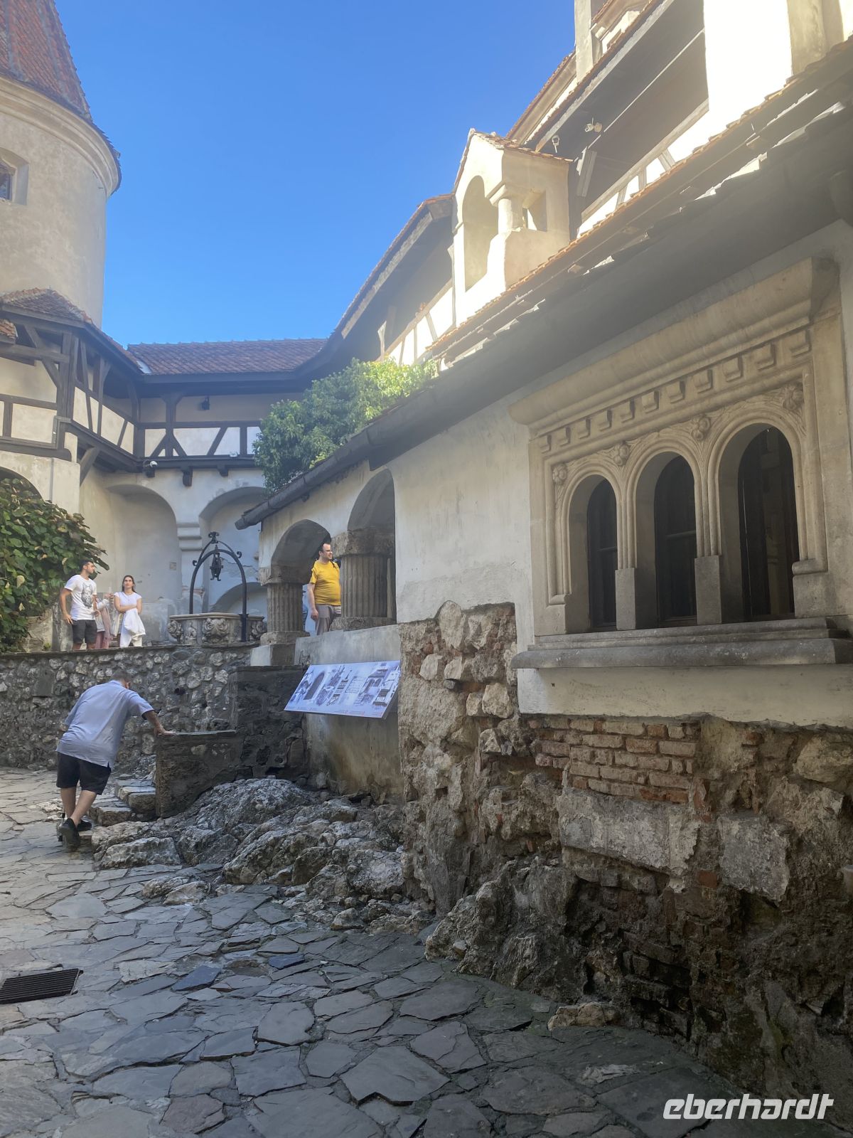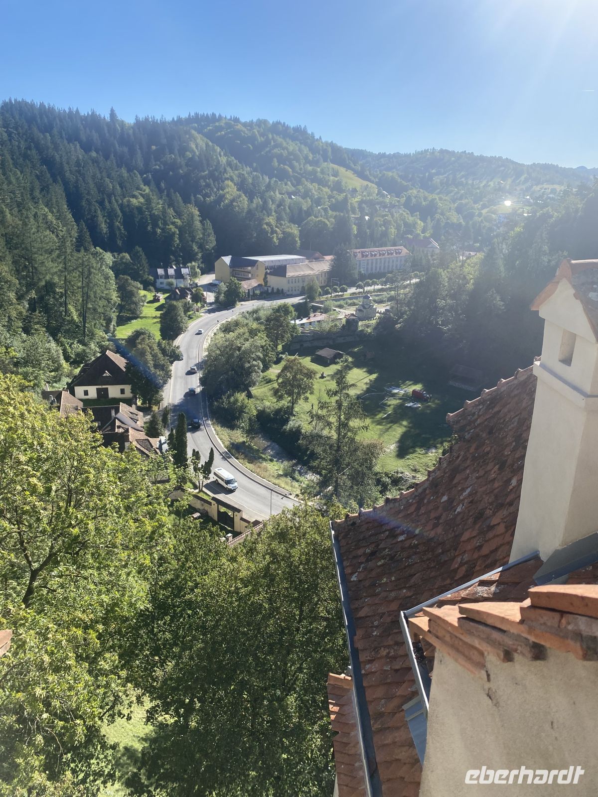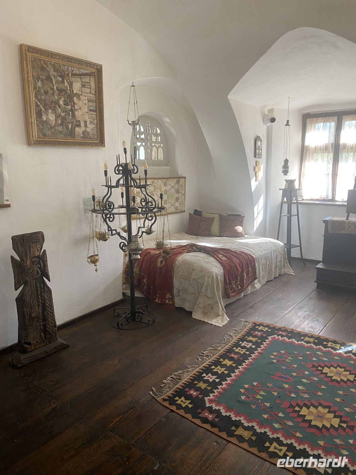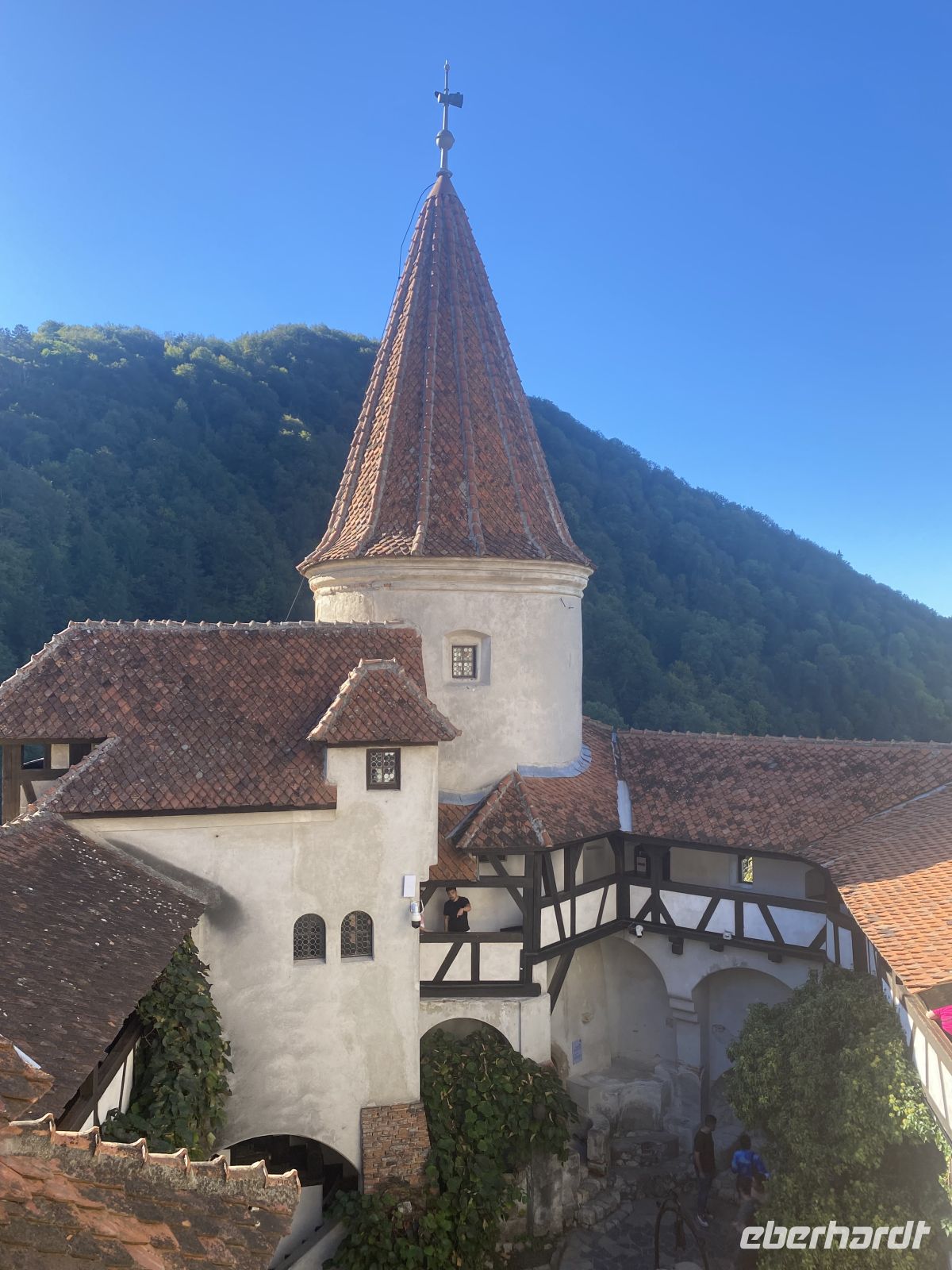 Einige statten noch der kleinen orthodoxen Nikolaikirche einen Besuch ab, dann ist Freizeit für eine Erfrischung und zur Einstimmung auf den letzten Programmpunkt dieses Tages. Wir fahren nach Burg Bran, ebenfalls eine Ordensgründung. Die Burg ist aus Flusssteinen errichtet und diente der Verteidigung der südöstlichen Grenze und als Zollstation zwischen der Walachei und dem Burzenland. Die Burg erhielt ihr gegenwärtiges Aussehen im 16. Jahrhundert. Zeitweise besaß sie Mircea der Alte, der Großvater des Vlad Tepes, genannt Dracula. Aber wahrscheinlich war Vlad nie in dieser Burg. Dennoch wird sie mit ihm in Verbindung gebracht und zahlreiche Souvenirs belegen dies. Sicher ist jedoch, dass Königin Maria die Burg als Sommerresidenz nutzte. Nun wandern wir durch die Burg und erfreuen uns an dem schönen Ausblick in die liebliche Landschaft.