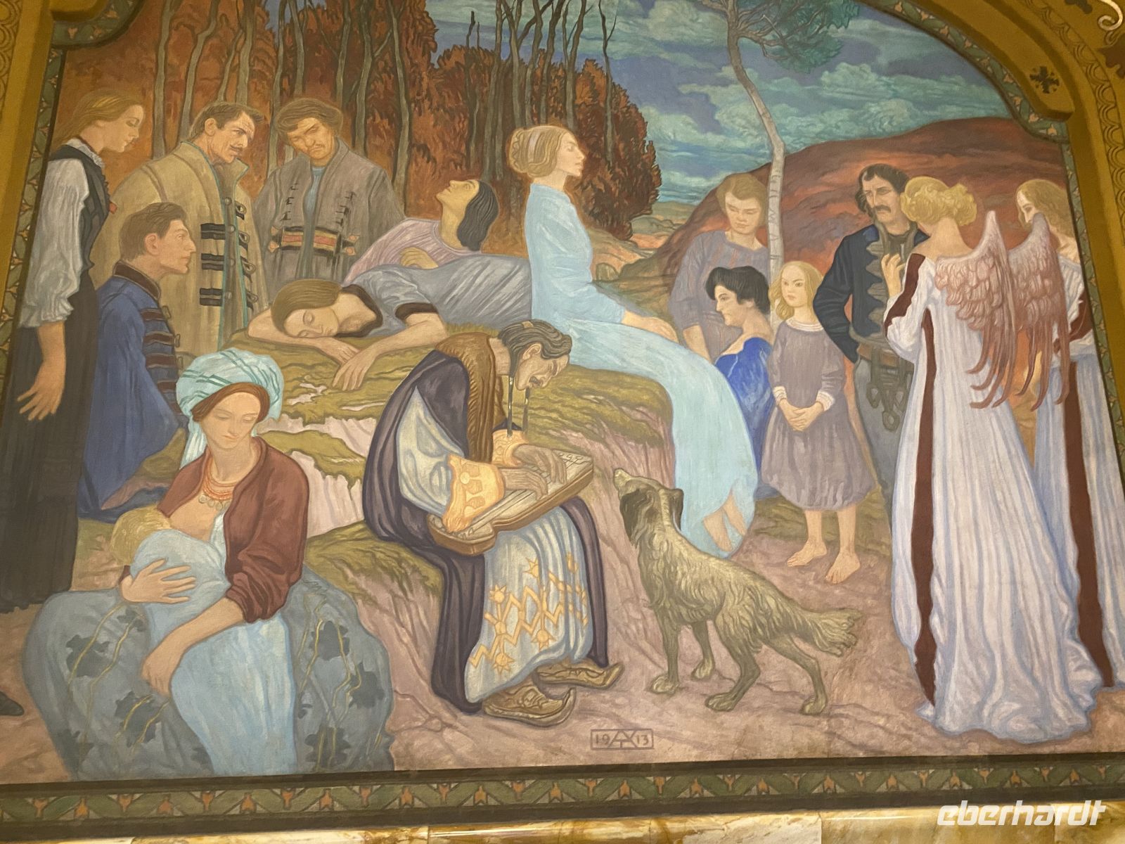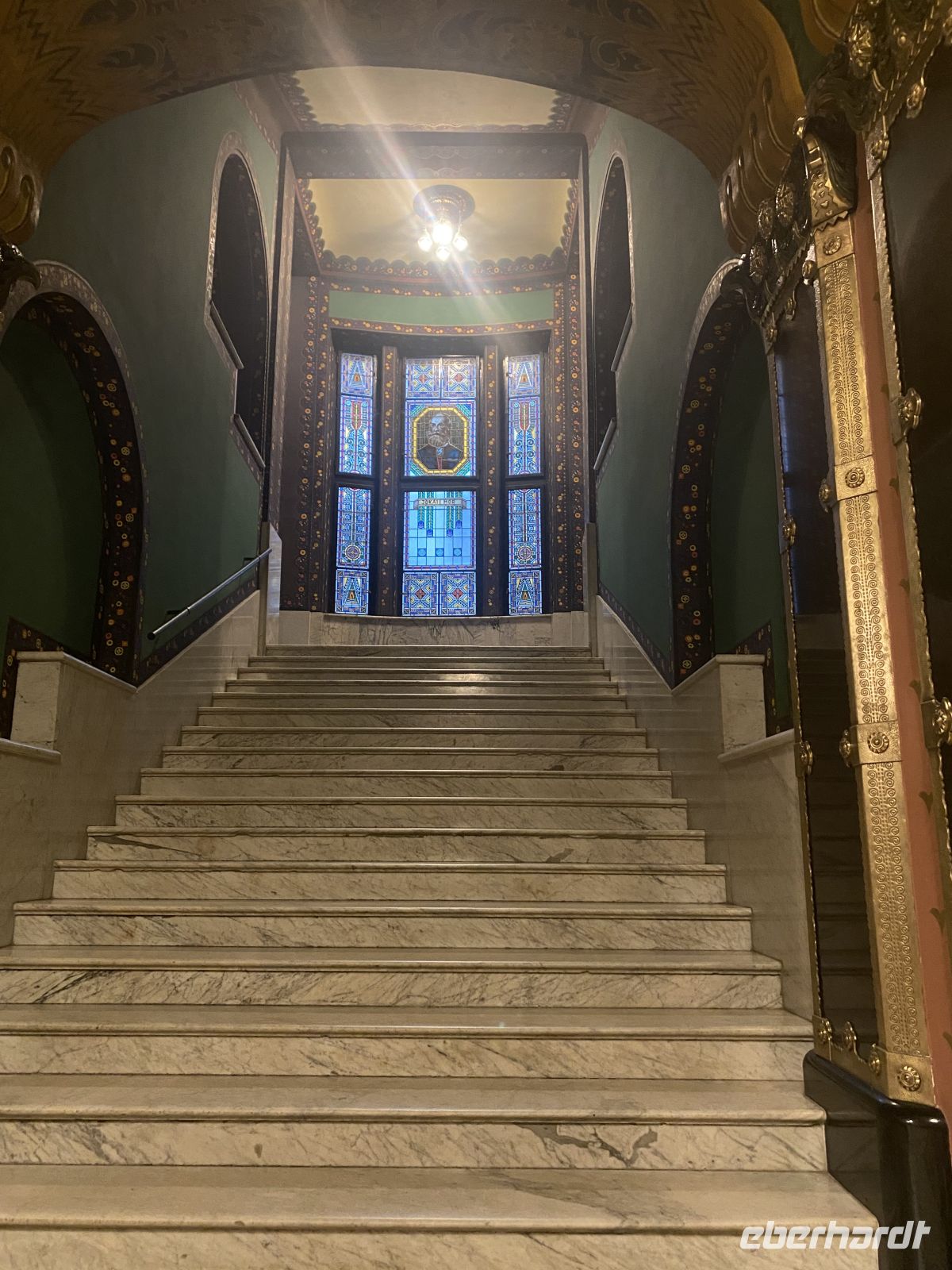 Nun steuern wir die größte Stadt des Szeklerlandes, Targu Mures (Neumarkt) an. Hier haben wir großes Glück, die Tür des eigentlich geschlossenen Kulturpalastes steht offen und so schlüpfen wir schnell hinein und können uns die hübschen Malereien sowie die venezianischen Spiegel besehen, bevor uns der Wachdienst wieder hinauskomplimentiert. Die Wandbilder sind im Jugendstil gemalt und stellen Szenen aus dem Leben der Szekler dar.