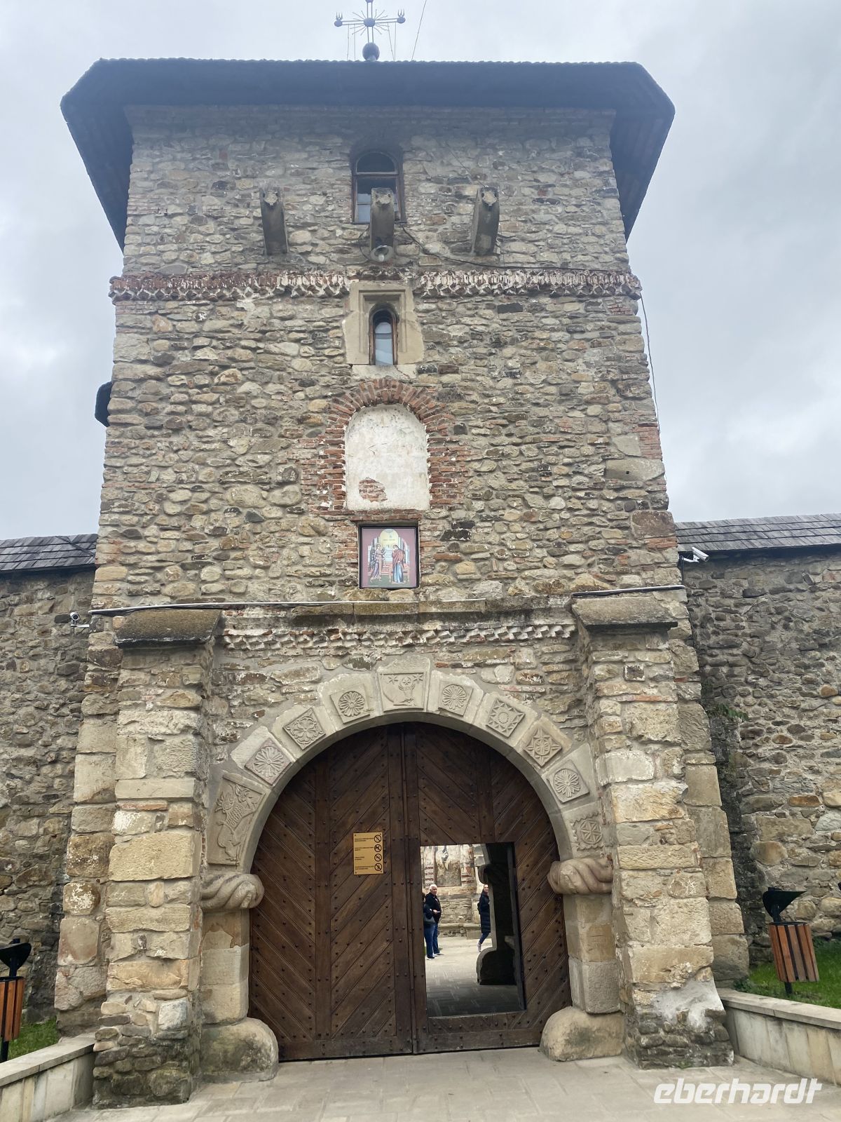 Die Außenmalereien zeigen die Wurzel Jesse, die Belagerung Konstantinopels sowie die Gebete aller Heiligen. Innen ist das Votivbild des Stifters mit seiner Familie sehr interessant, denn Petru, seine Frau und seine Söhne tragen deutlich individualisierte Züge, für die Entstehungszeit eher ungewöhnlich. Im kleinen Museum bewundern wir noch den goldenen Apfel, eine Auszeichnung für vorbildliche Restaurierung und Instandhaltung, dann setzen wir unseren Weg fort nach Gura Humorului, dort essen wir zu Abend und übernachten im Hotel Club Bukowina.