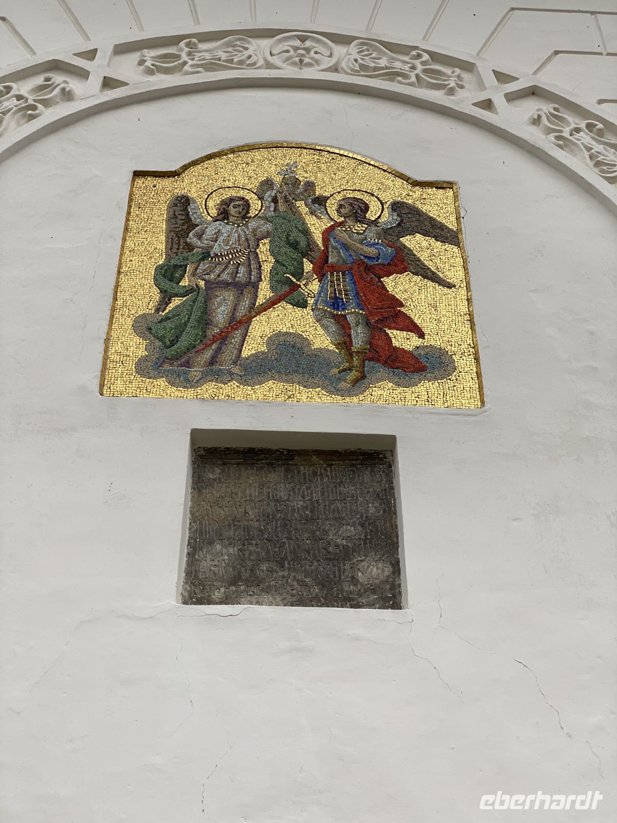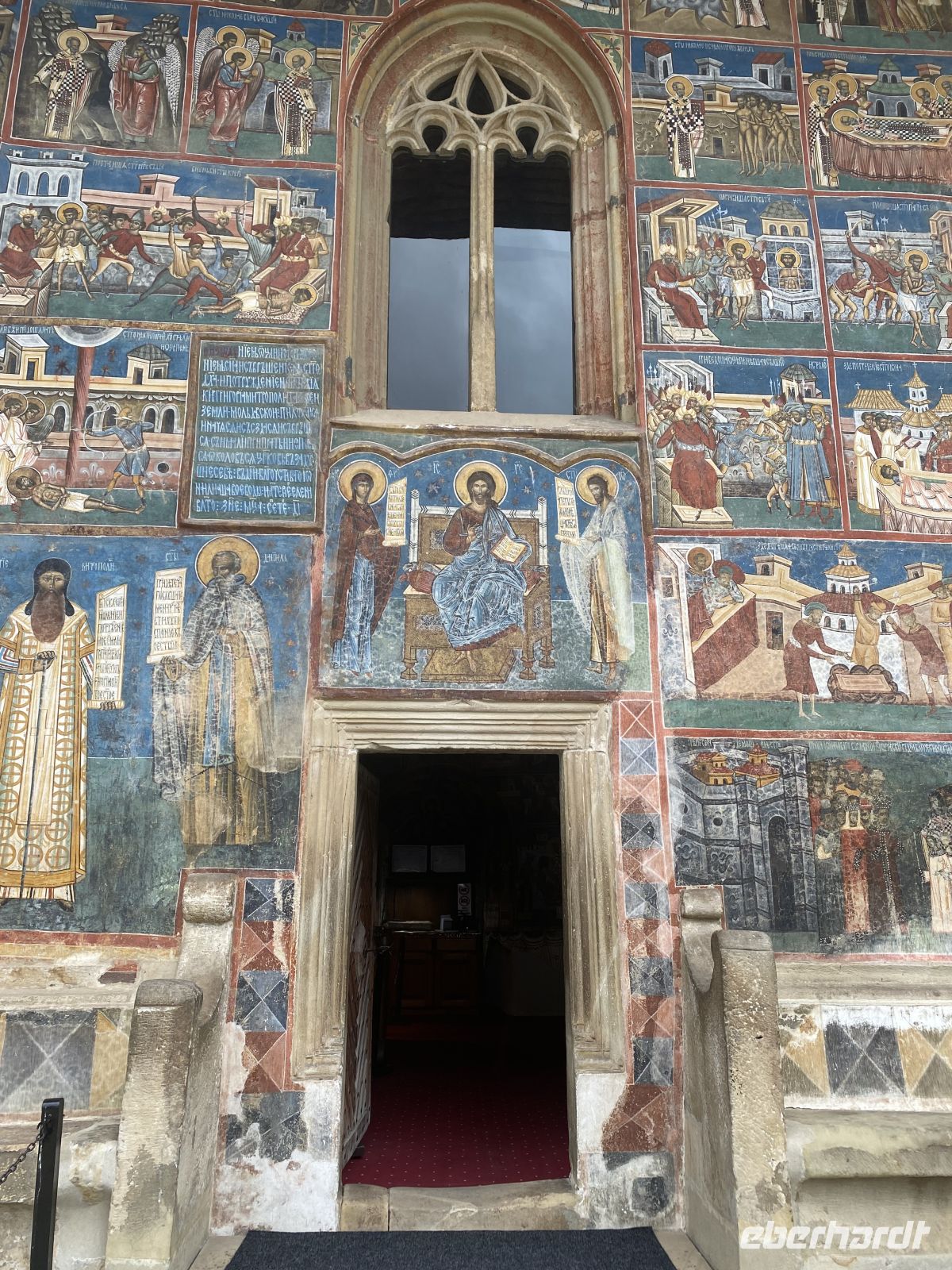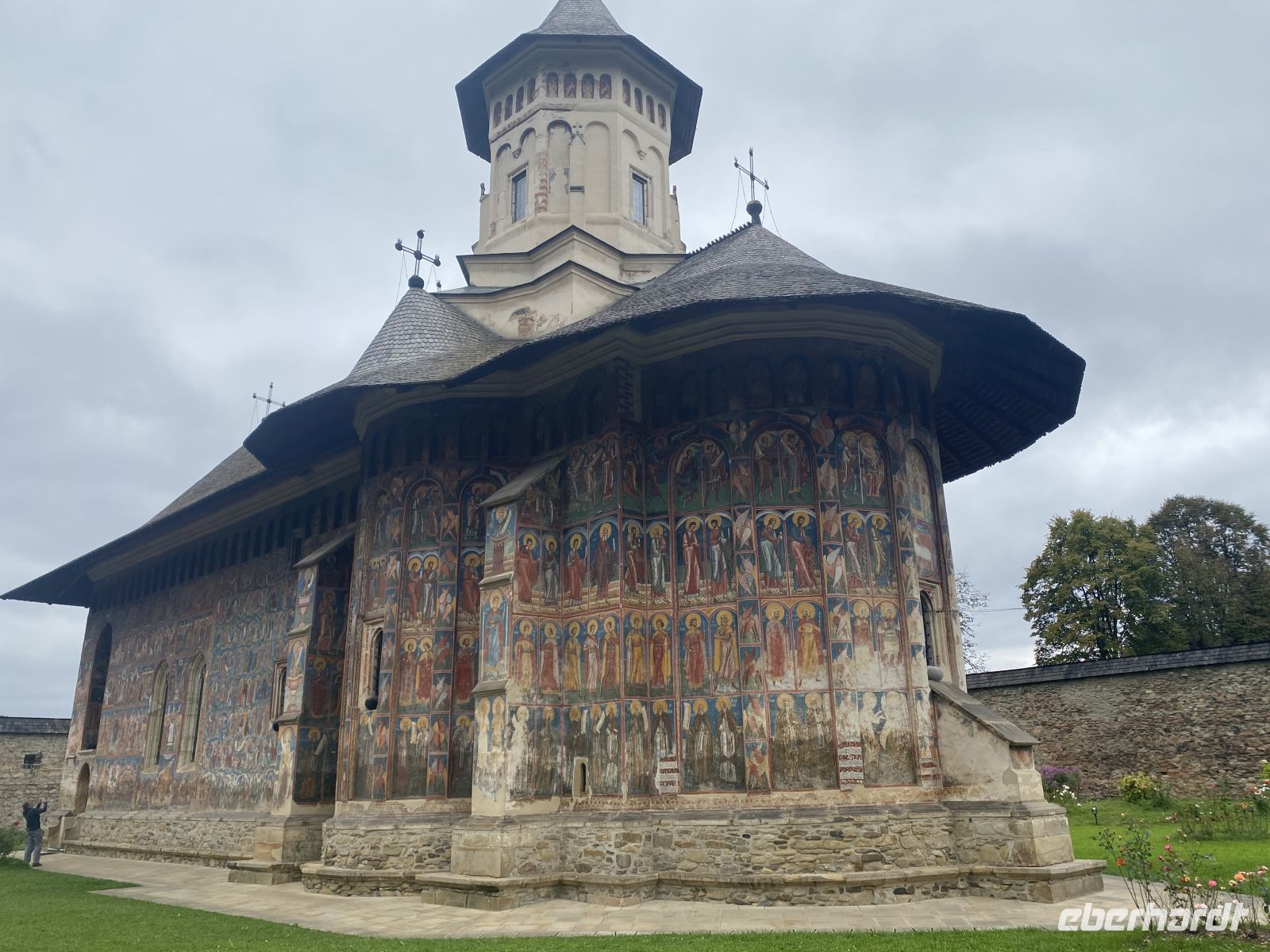 Nach dem schönen Wetter, welches uns bisher erfreute, kommt nun etwas Regen und Abkühlung, aber uns erschreckt so leicht nichts und so brechen wir wohlgemut zum Kloster Voronet auf. Die Klosterkirche, dem heiligen Georg gewidmet, wird oft als Sixtinische Kapelle des Ostens bezeichnet. Dies bezieht sich auf die einzigarten Fresken sowohl außen als auch innen. Der strahlend blaue Hintergrund der Malereien wird Voronets-Blau genannt und wurde auf der Basis von Lapislazuli hergestellt. Die Kirche wurde im Sommer des Jahres 1488 errichtet, Stefan der Große stiftete sie auf Anregung des Einsiedlers Daniil, der in der Nähe im Wald lebte. 1547 wurden dann die Außenwände bemalt. Die ganze westliche Wand ist der Darstellung des jüngsten Gerichts gewidmet. Auf der südlichen Seite sieht man die Wurzel Jesse. Neben den Propheten sind auch Philosophen dargestellt: Aristoteles, Platon, Pythagoras, Sokrates und die Seherin Sybille.