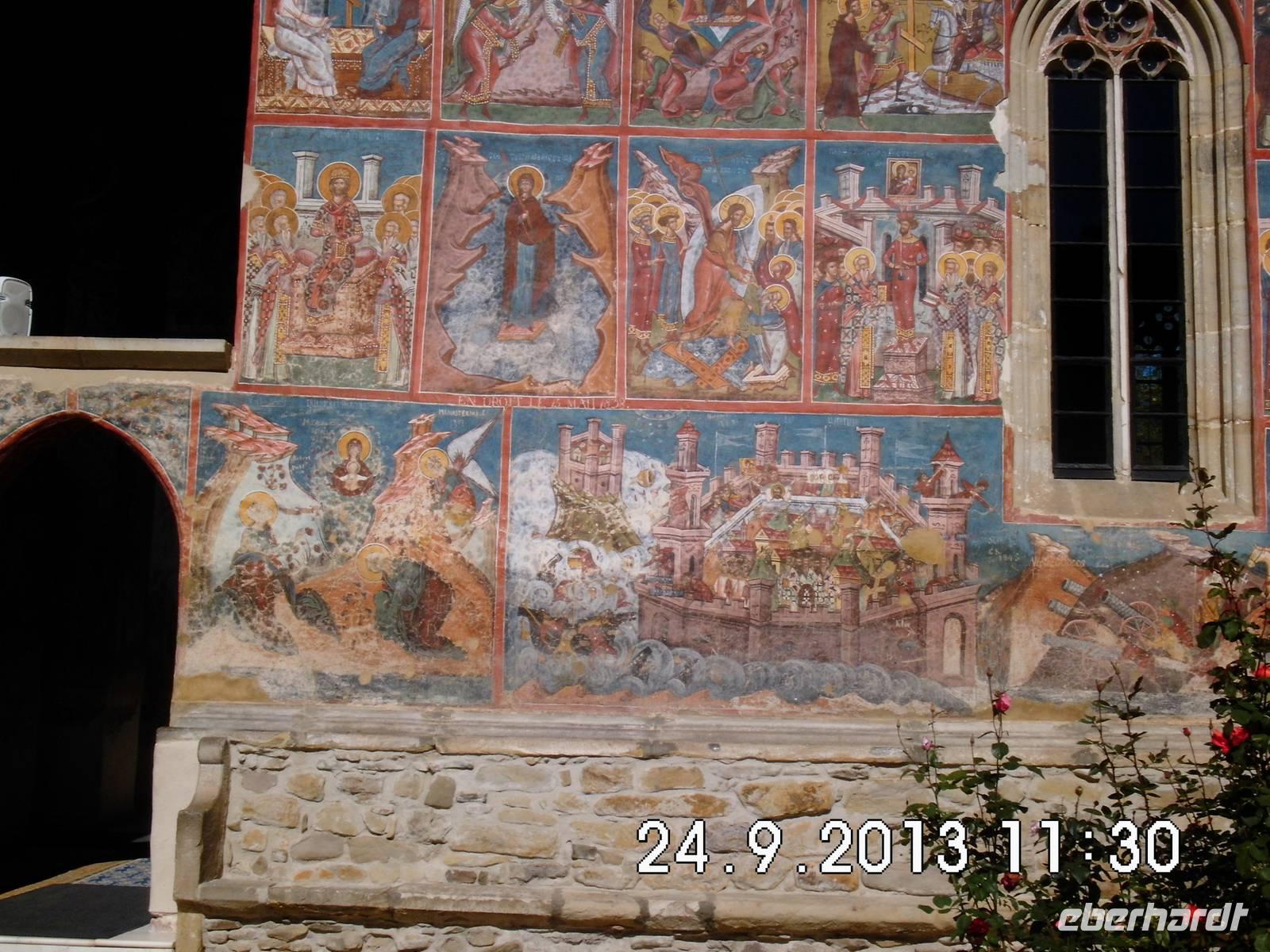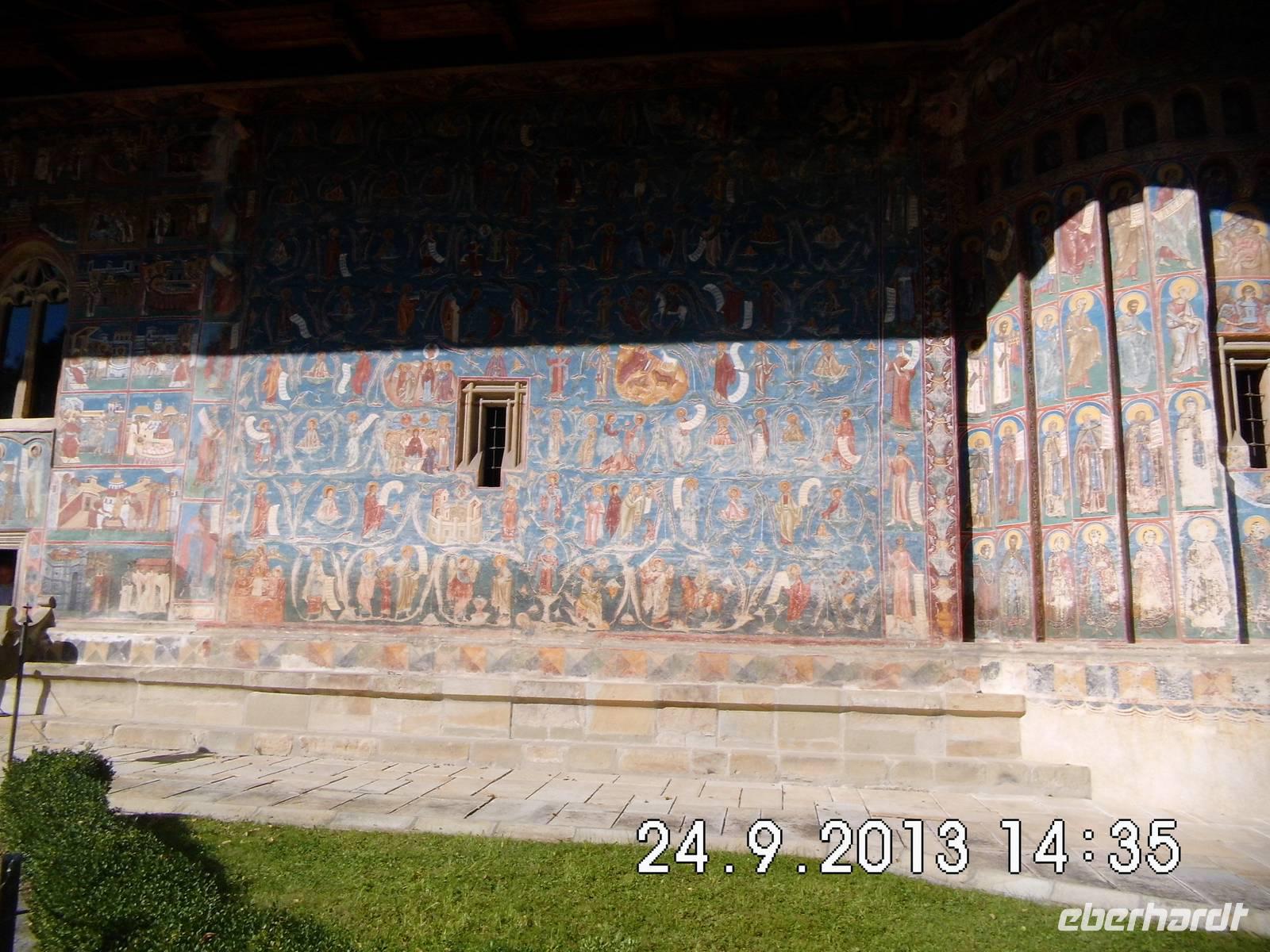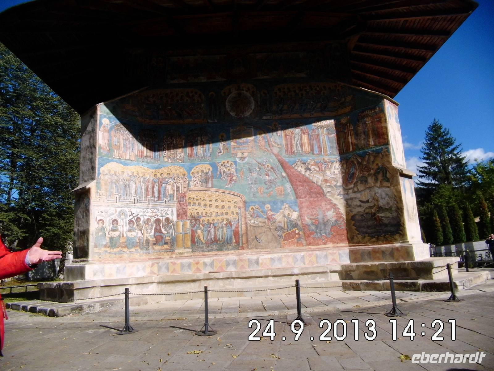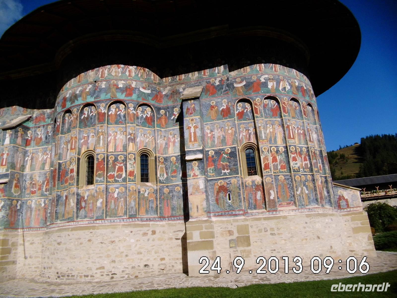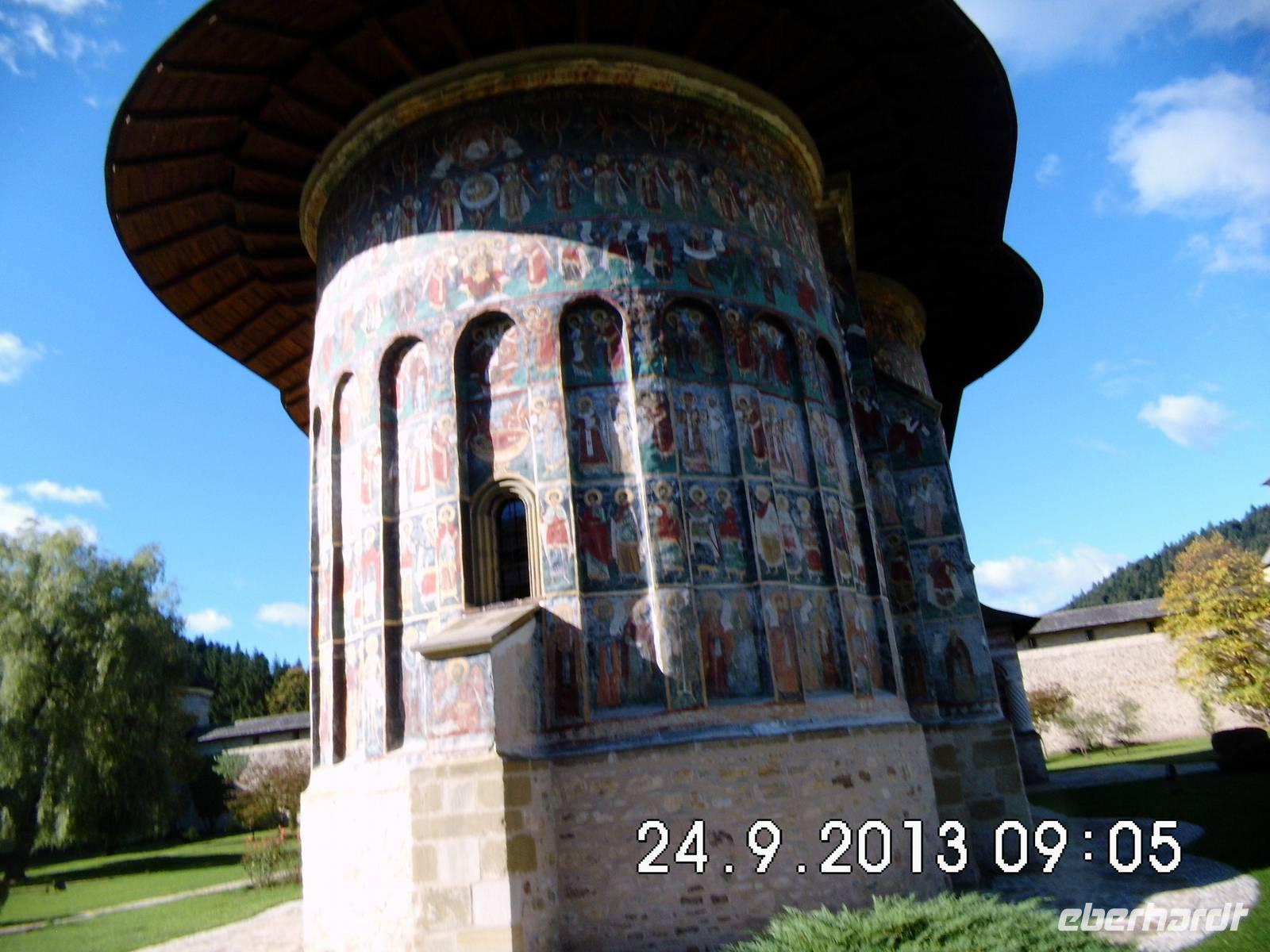 Der heutige Tag steht ganz im Zeichen der berühmten Moldauklöster. Wir befinden uns im Nordosten Rumäniens und die Bukowina erfreut uns mit schönstem Sonnenschein. Moldau benannt. Die Klöster hier sind ein besonderer Schatz: schlichte, in schöne Natur eingebettete Klöster, deren Innen- und Außenwände mit farbigen Bildteppichen überzogen sind, die sowohl sakrale als auch zeitgeschichtliche Motive beinhalten.