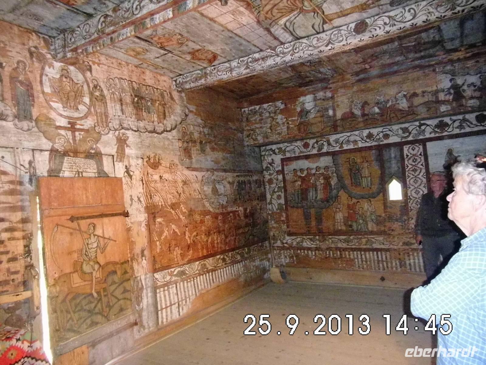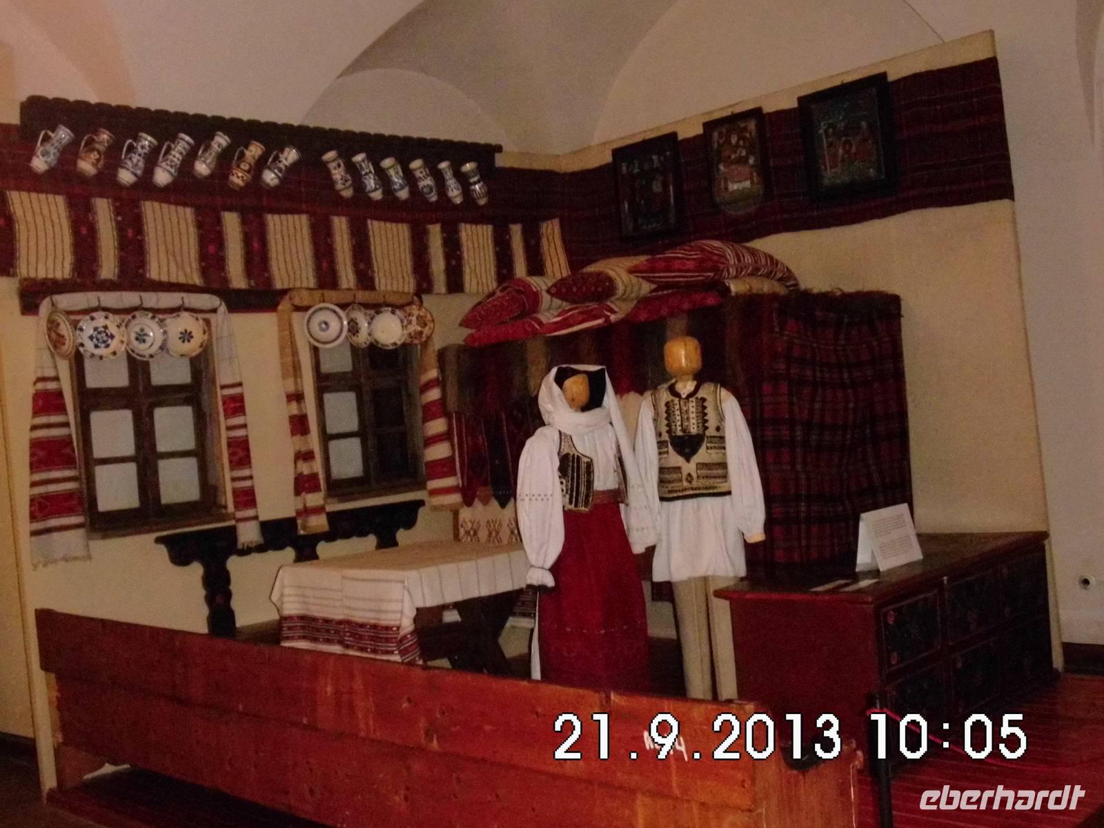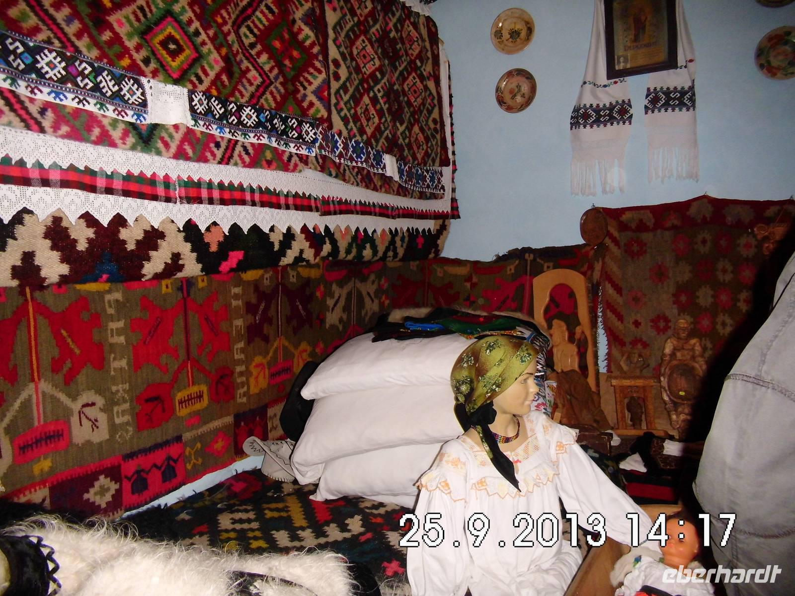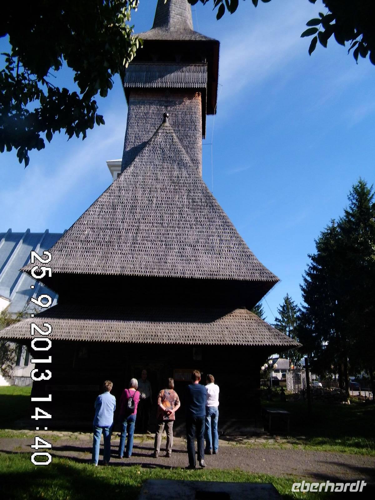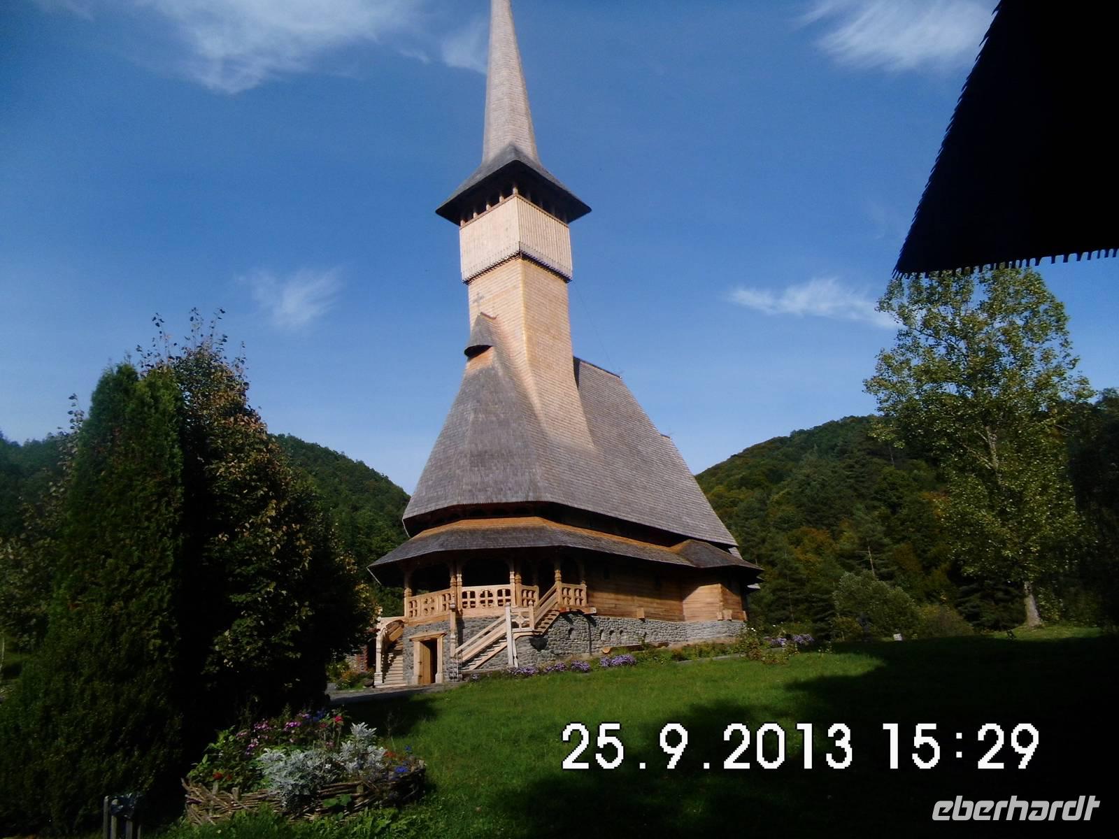 Aufgrund einer kleineren Havarie am Bus können wir unser Lunchpaket nicht als Picknick in der freien Natur verzehren, sondern steuern Bistritz als Pausenort an. Zum Lunch gibt es Wein von Eberhardt aus der Sektkellerei Azuga. Unser aller Schatz Janutz kann den Bus in Ruhe in Ordnung bringen und weiter geht es in die Region Maramures. Auf unserer Fahrt säumen Nussbäume die Strassen. Wir besuchen zusätzlich zum offiziellen Programm das Museum für die Frau, ein hübsches privates Volkskunstmuseum. Unweit davon besuchen wir die Holzkirche Bogdan Voda. Buci zeigt uns aber auch eine moderne, wunderschöne Klosteranlage, das Barsana Kloster. Wie auf Verabredung kreuzt eine Herde der hier gezüchteten gleichnamigen Schafe die Strasse. Sie sind für ihre dichte, weiche und lange Wolle bekannt. Auch ein Eselchen läuft in der Herde mit.