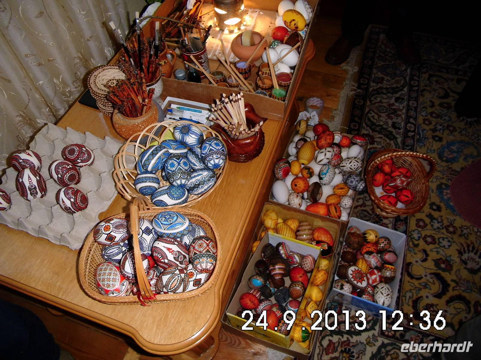 durch Schwester Tatjana in deutscher Sprache. In der Nähe liegt das Atelier einer Eiermalkünstlerin,das wir besuchen.Die Künstlerin erklärt die verschiedenen Techniken des Eiermalens und natürlich kann fast keiner widerstehen und kauft ein paar dieser kleinen Kunstwerke. Wir verzichten auf eine ausführliche Mittagspause und kaufen uns im hiesigen Geschäft etwas auf die Hand zum Essen. Zum Abschluss des Tages besichtigen wir noch das Kloster Voronetz.