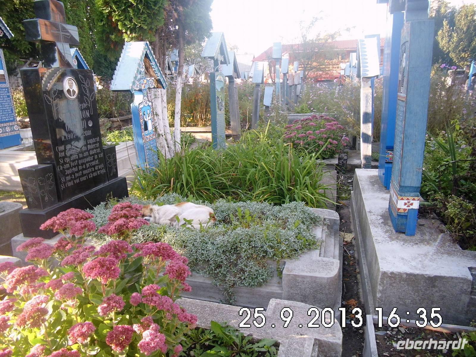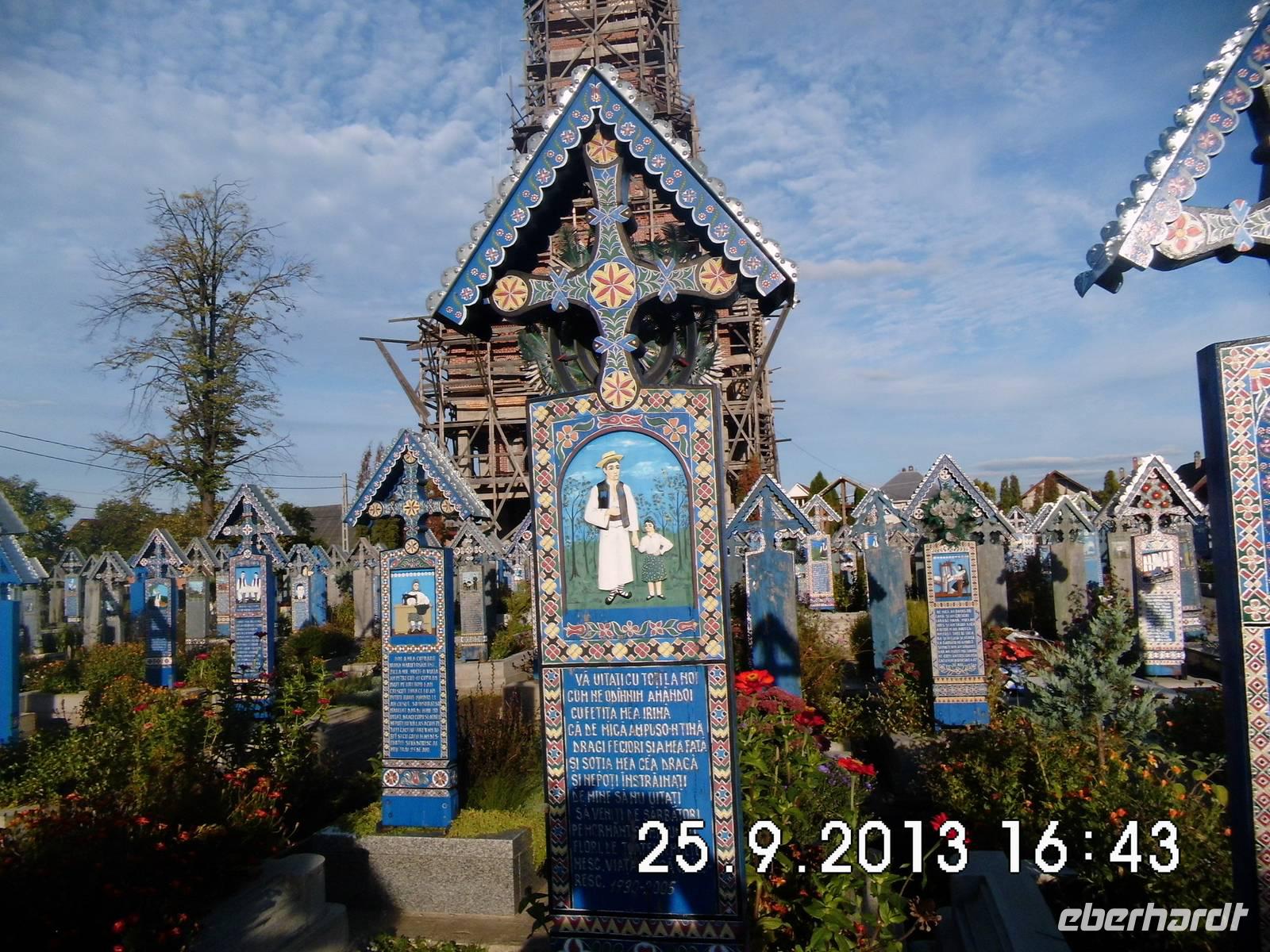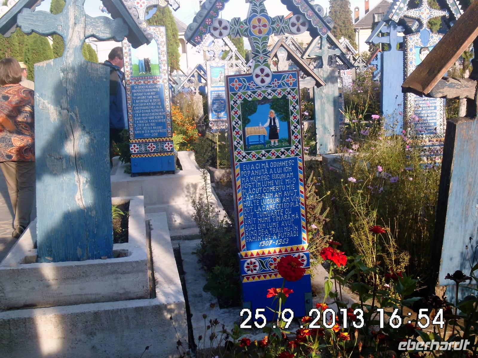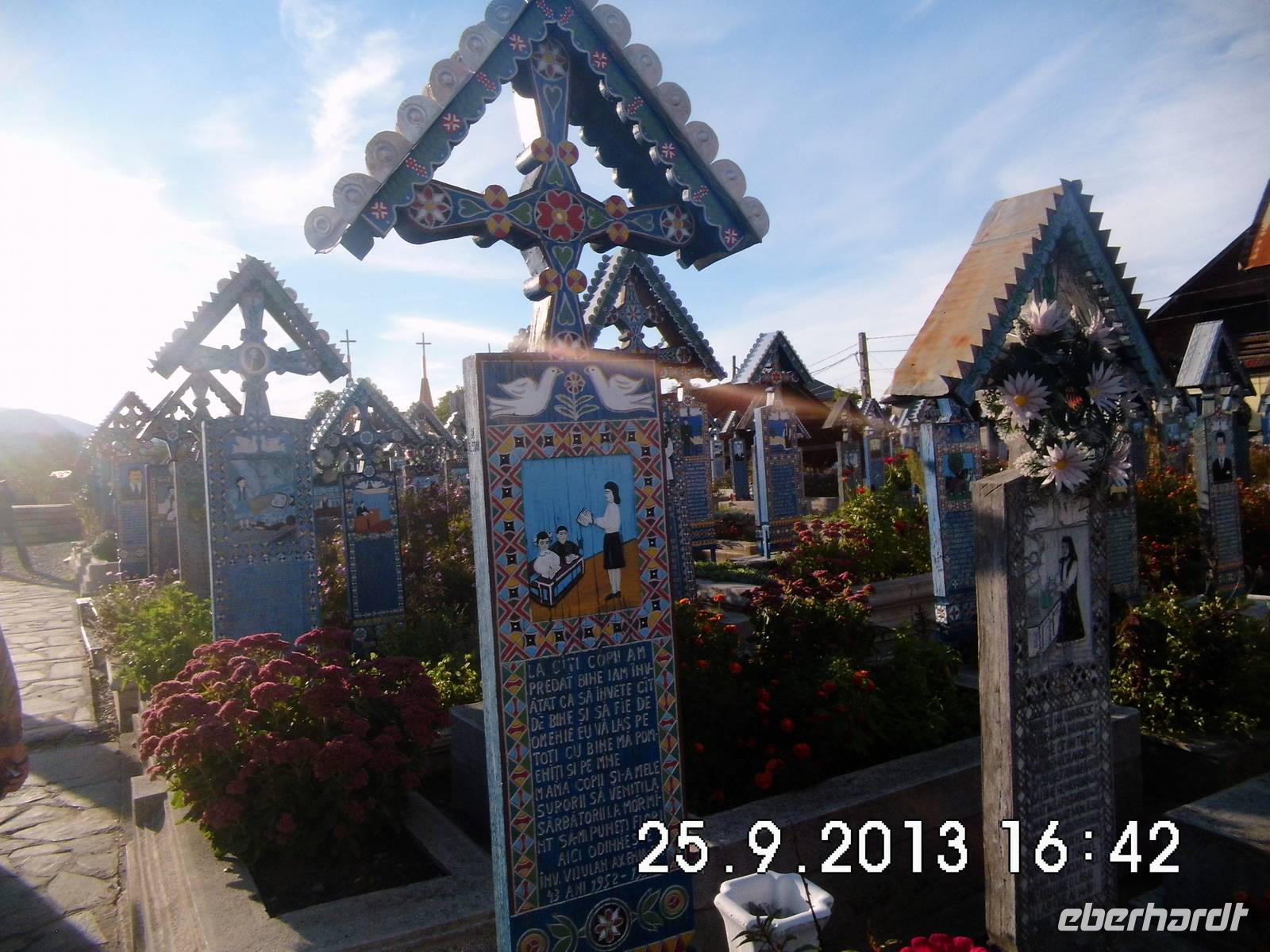 Bald erreichen wir den nördlichsten Ort Rumäniens an der ukrainischen Grenze und nähern uns dem „Fröhlichen Friedhof" von Sapanta.Sein Name geht auf einen französischen Reisenden zurück, den die farbenfrohen Kreuze mit den naiven Szenen begeisterten. Die bemalten Reliefbilder zeigen den Verstorbenen in einer charakteristischen Szene aus seinem Leben, darunter einen passenden,humorvollen Vers. Der witzigste Vers ist zweifellos der mit der Schwiegermutter. Auf den Bildern wird das Dorfleben wieder lebendig und dem Tod wird etwas von seinem Schrecken genommen.