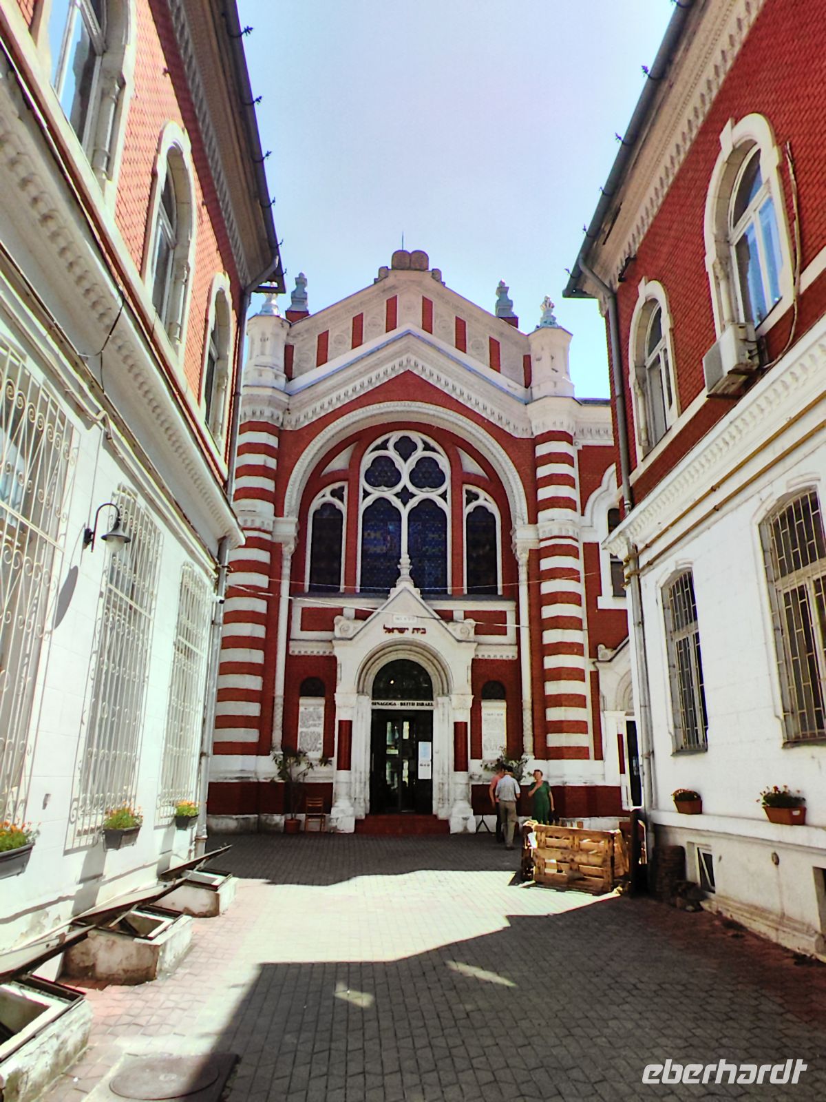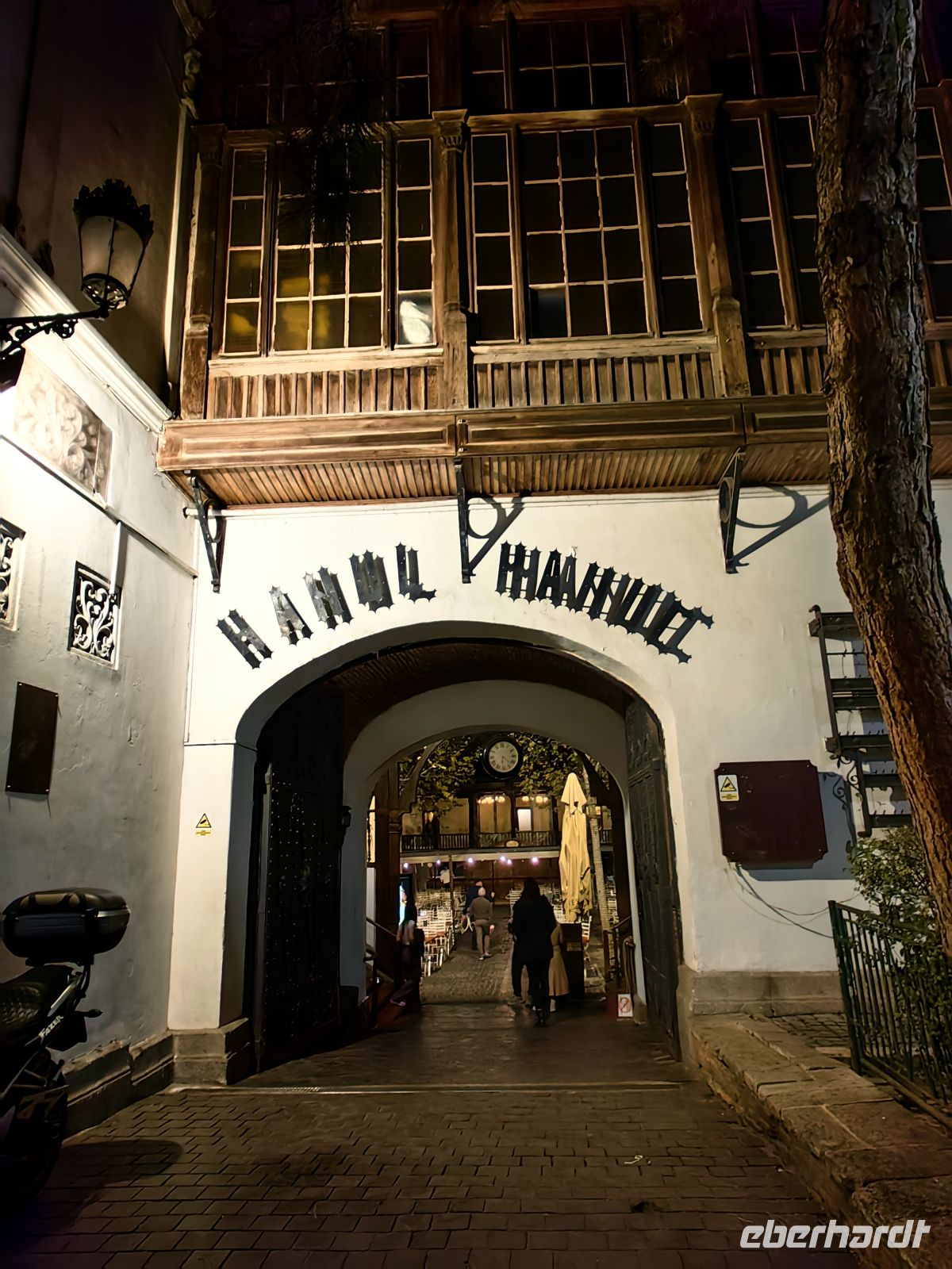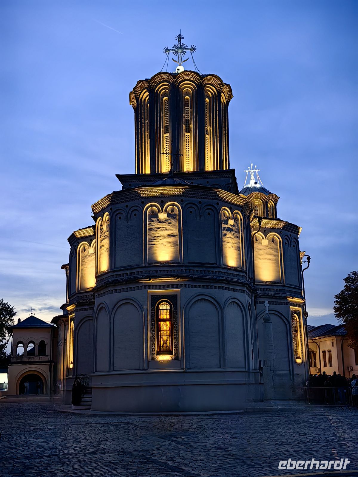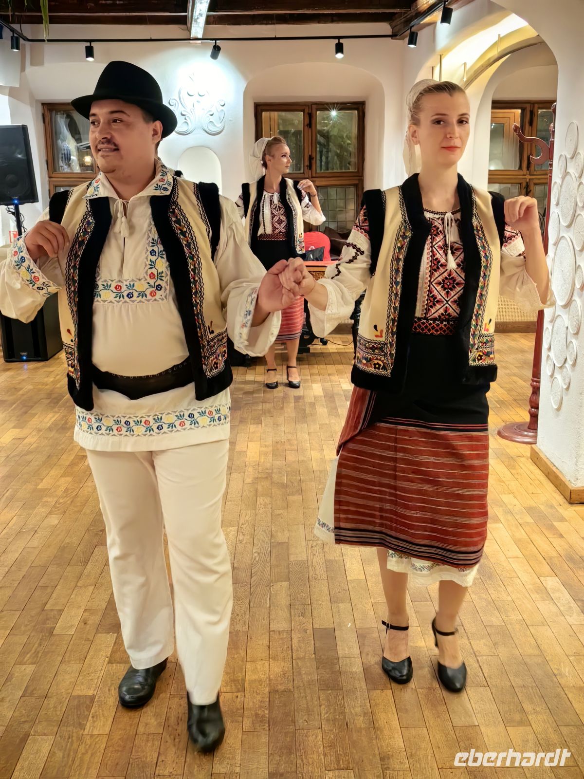 Wir fahren am Abend so nah an die Altstadt heran, wie es geht und laufen zur alten Karawanserei, dem Hanul lui Manuc. Hier erwartet man uns zum Abendessen. 1769 durch Manuc Bey gegründet, diente der Hof einst als Herberge für Reisende, die von der Seidenstraße kamen. Hier lagerte man Wein in 15 unterirdischen Weinkellern und beherbergte über 20 Läden im Erdgeschoß. Im ganzen Areal konnte man bis zu 500 Fremde unterbringen. Heute ist der Hof ein Restaurant, als wir ankommen ist es rappelvoll und wir bekommen unsere Plätze neben den Musikern. Zuerst gibt es Musik auf dem Hackbrett und danach geht es mit zünftiger rumänischer Folklore und Tänzen weiter.