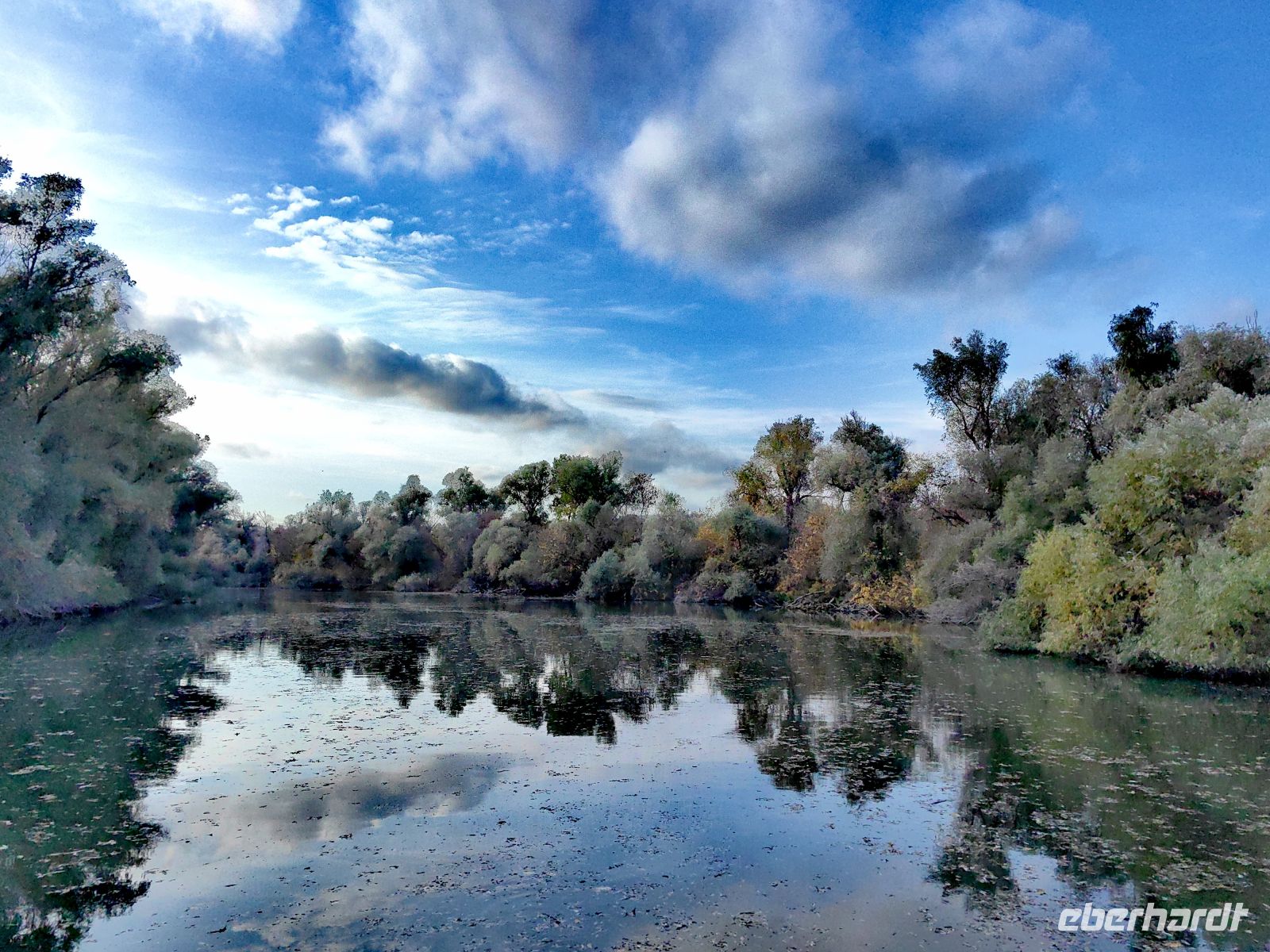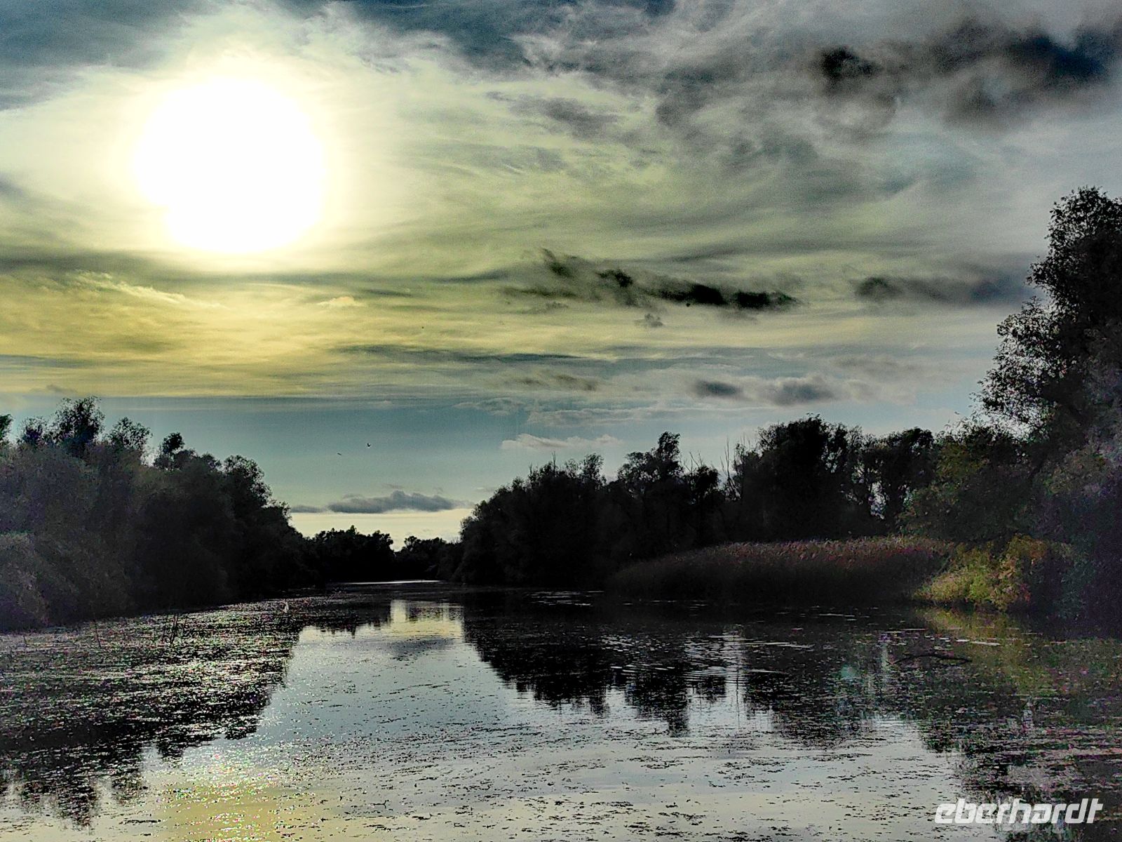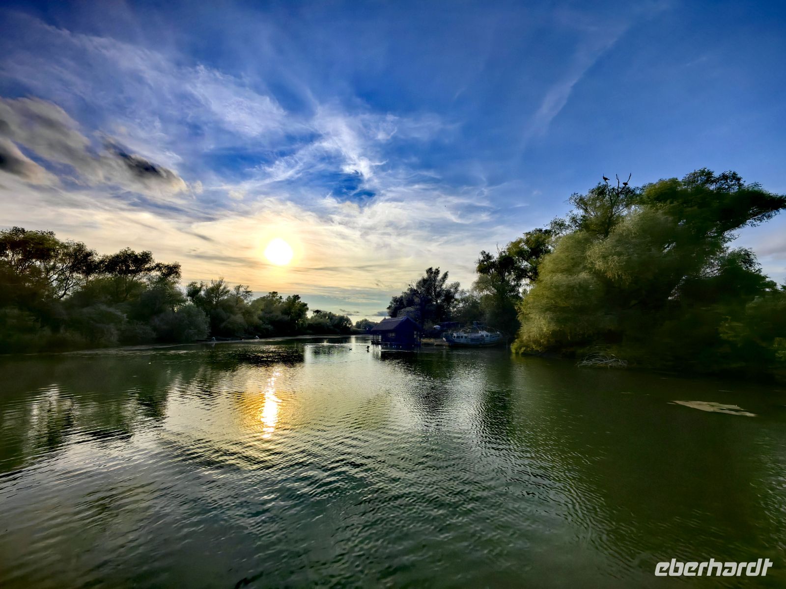 Am späten Nachmittag erreichen wir den Bootsanleger und fahren bei schönstem Nachmittagshimmel und Sonnenschein ins Donaudelta hinein. Alle Gäste sind ganz verzaubert von der wunderbaren Flußlandschaft, wir werden von Seeschwalben umrundet, Enten formieren sich und ziehen am strahlend blauen Himmel gen Süden, die Pelikane sind bereits in wärmere Gefilde geflogen. Auf den Baumwipfeln erspähen wir unzählige Kormorane und sogar zwei Seeadler können wir gut beobachten. Der Kapitän fährt extra langsam und es ist magisch still und so langsam geht die Sonne über dieser einzigartigen Deltalandschaft unter. An Bord dürfen wir noch zu Abend essen und als es bereits dunkel ist, kehren wir nach Tulcea zurück.