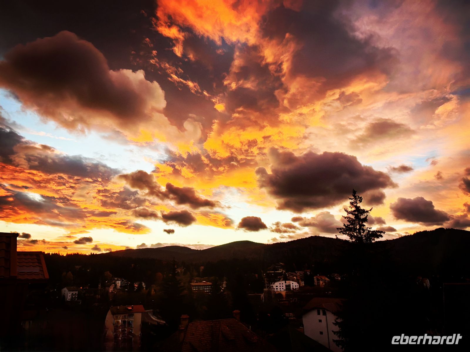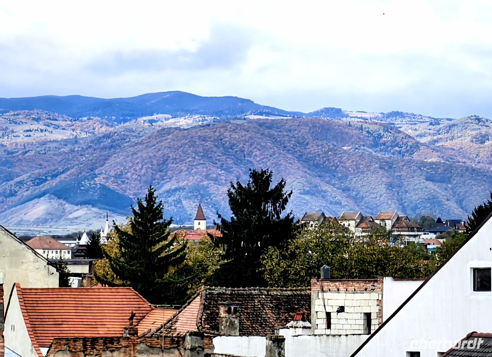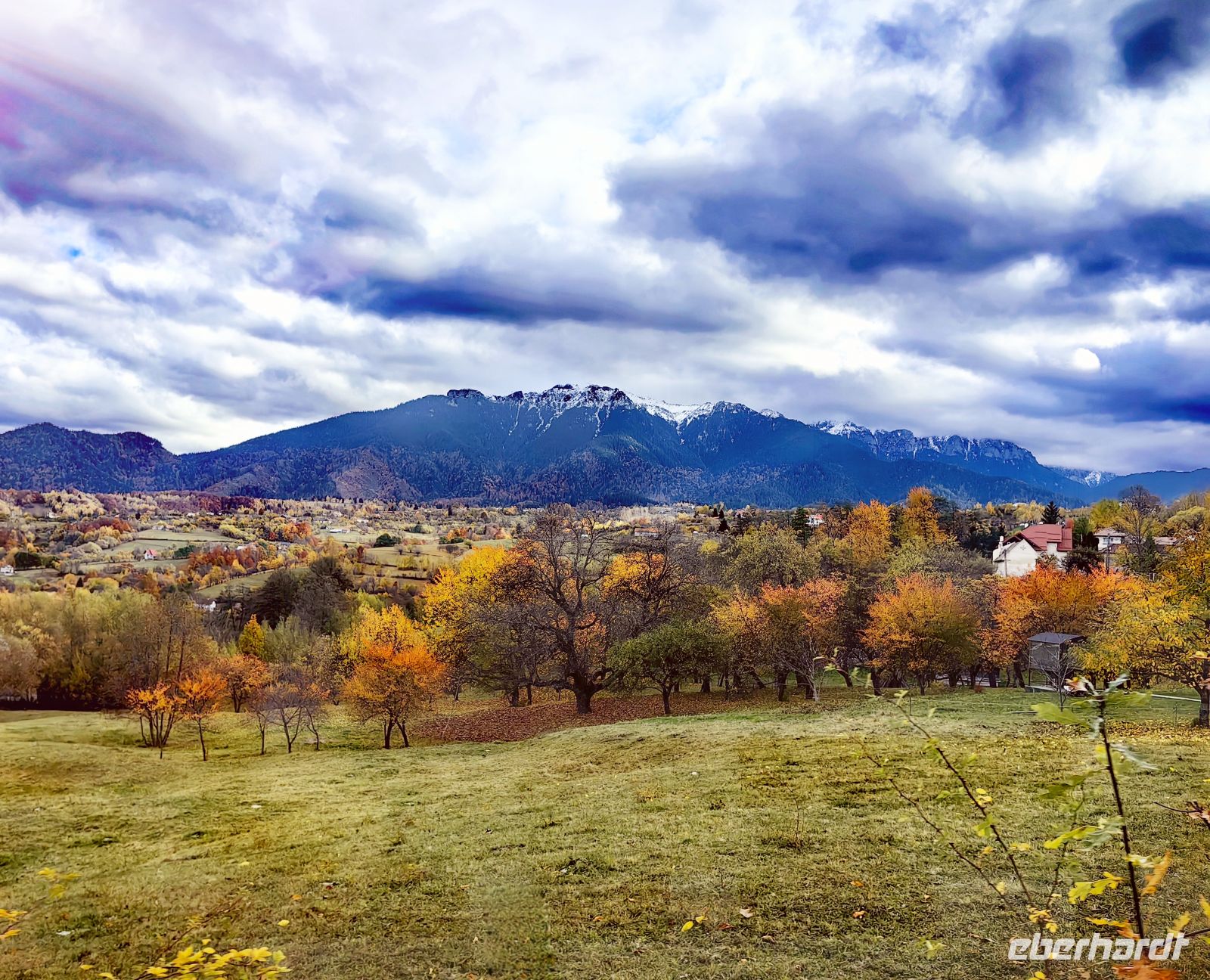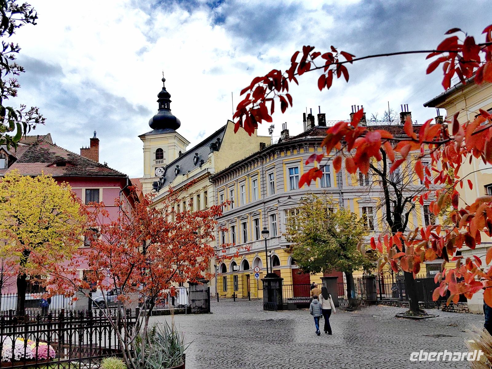 Am frühen Morgen ist der Himmel in Predeal glutrot und die Berge hängen in spektakulären Wolken. Frohen Mutes starten wir in Richtung Sibiu und sehen die majestätischen Gipfel des Fagarasgebirges, davor die Buchenwälder in allen erdenklichen Herbsttönen gefärbt, ein Regenbogen krönt den Himmel. Als wir allerdings das Örtchen Rosenau auf einem Hügel erreichen, öffnet der Himmel seine Schleusen. Zur Mittagszeit beschließen wir daher, eine Pause in Sibiu - Hermannstadt - einzulegen, um nicht völlig naß zu werden und danach hört es tatsächlich auf zu regnen und wir wagen uns zur Stadtführung.