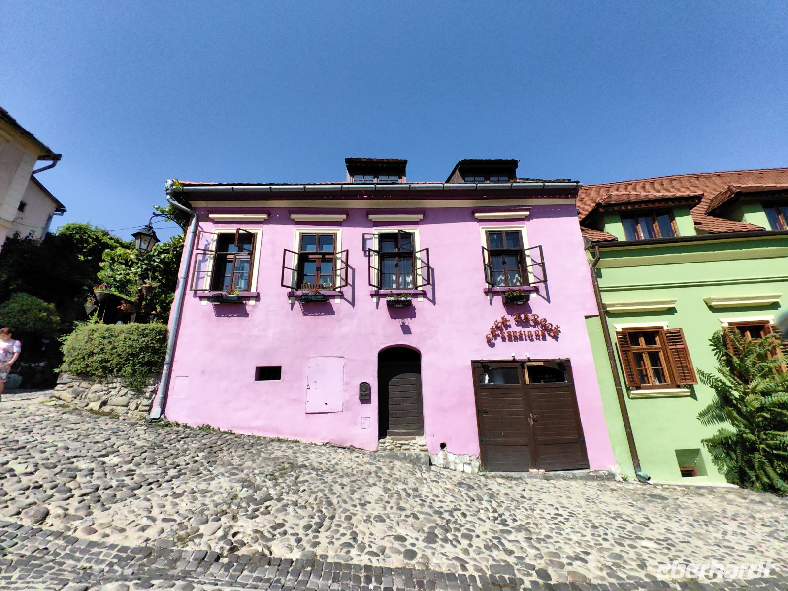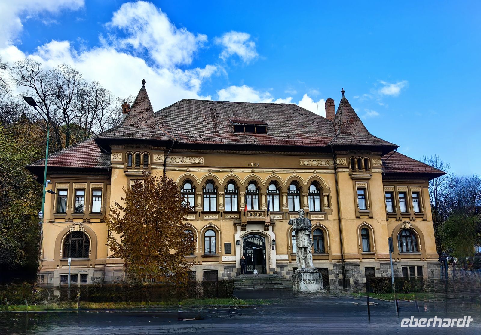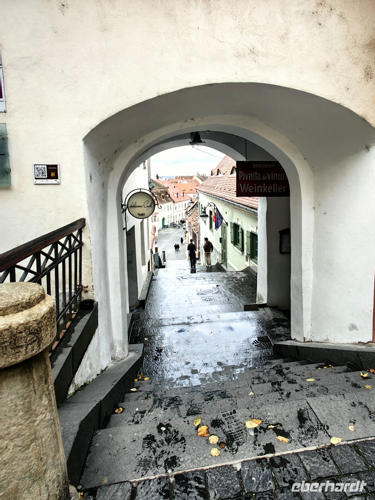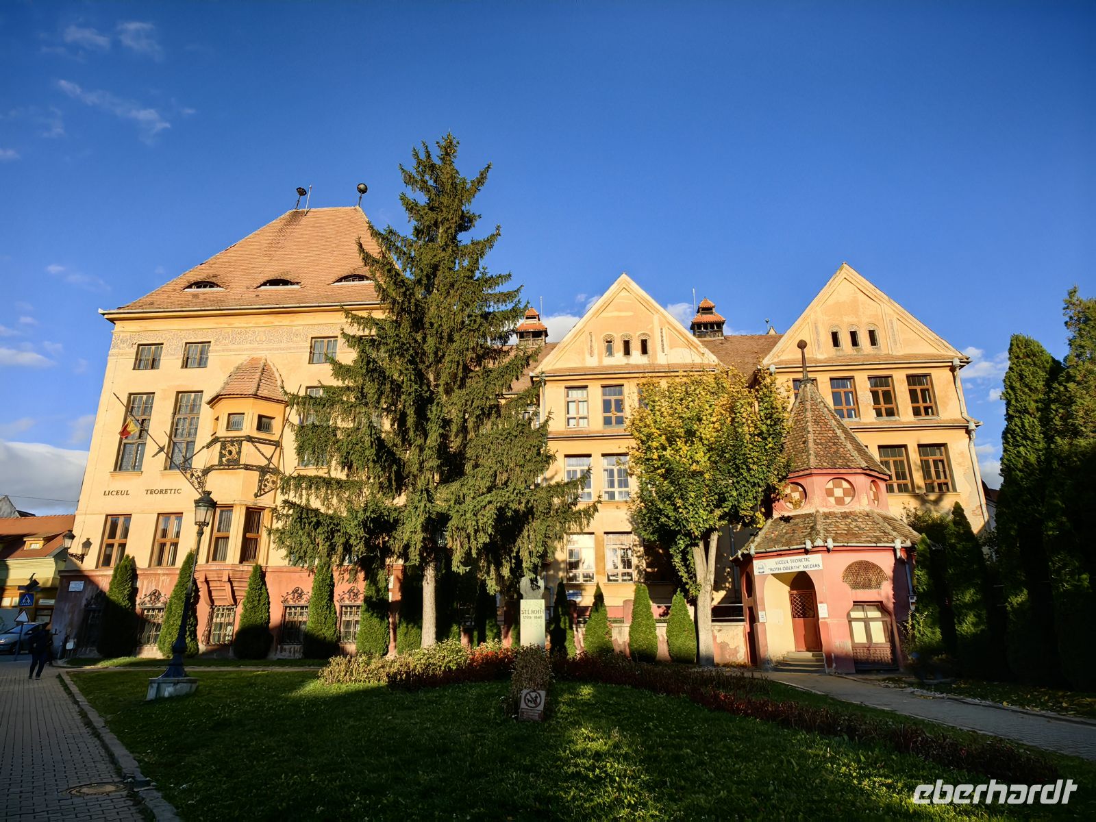 Nun wird es anstrengend. Wir erklimmen die 176 Stufen der sogenannten "gedeckten Schülertreppe", die zum Gipfel des Schulberg-Hügels führt, wo sich das Josef Haltrich Lyzeum befindet, in dem seit Anfang des 17. Jahrhunderts Deutsch unterrichtet wird. Die Schüler und Lehrer dieses Gymnasiums müssen alle sportlich sein, sie legen diesen Weg mehrmals täglich zurück!