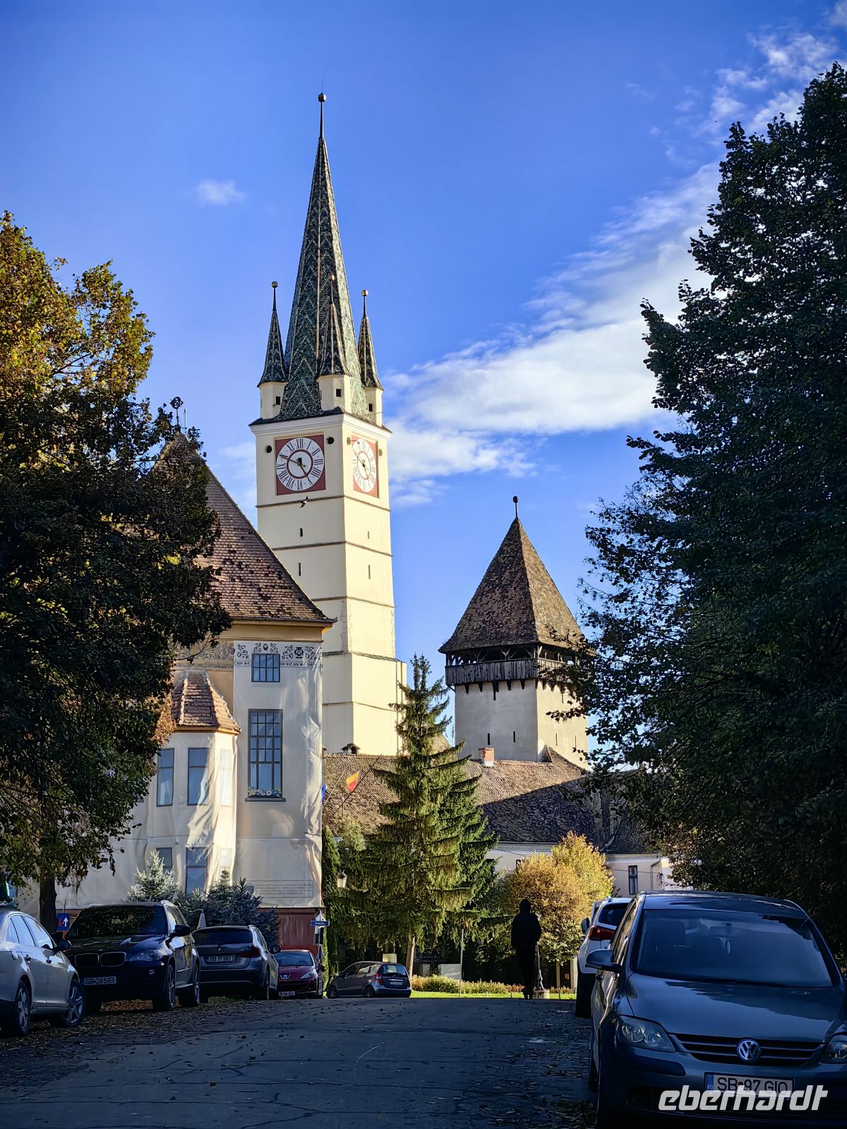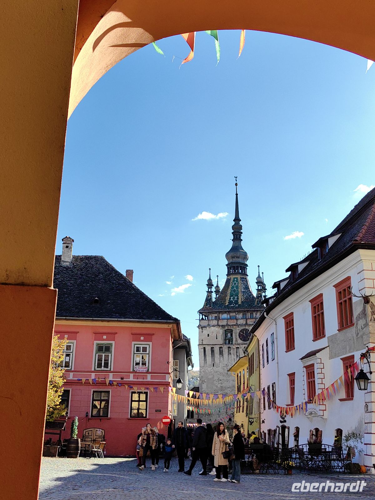 Etwa eine halbe Fahrstunde entfernt liegt die von sanften Hügelketten der Karpatenausläufer umgebene Stadt Sighisoara - Schäßburg. Hier leben heute etwa 30.000 Einwohner und die sind dreisprachig. Ein Fünftel der Bevölkerung gehört zur ungarischen Volksgruppe und noch etwa 500 Bewohner sind Siebenbürger Sachsen. Wir laufen hinauf in die Oberstadt und passieren eines der eindrucksvollen Stadttore mit dem markanten Zinngießerturm. Von oben hat man eine ganz bezaubernde Sicht auf die Umgebung und die Dächer der mittelalterlichen Altstadt. Vom Marktplatz aus sehen wir den charakteristischen Stundturm.