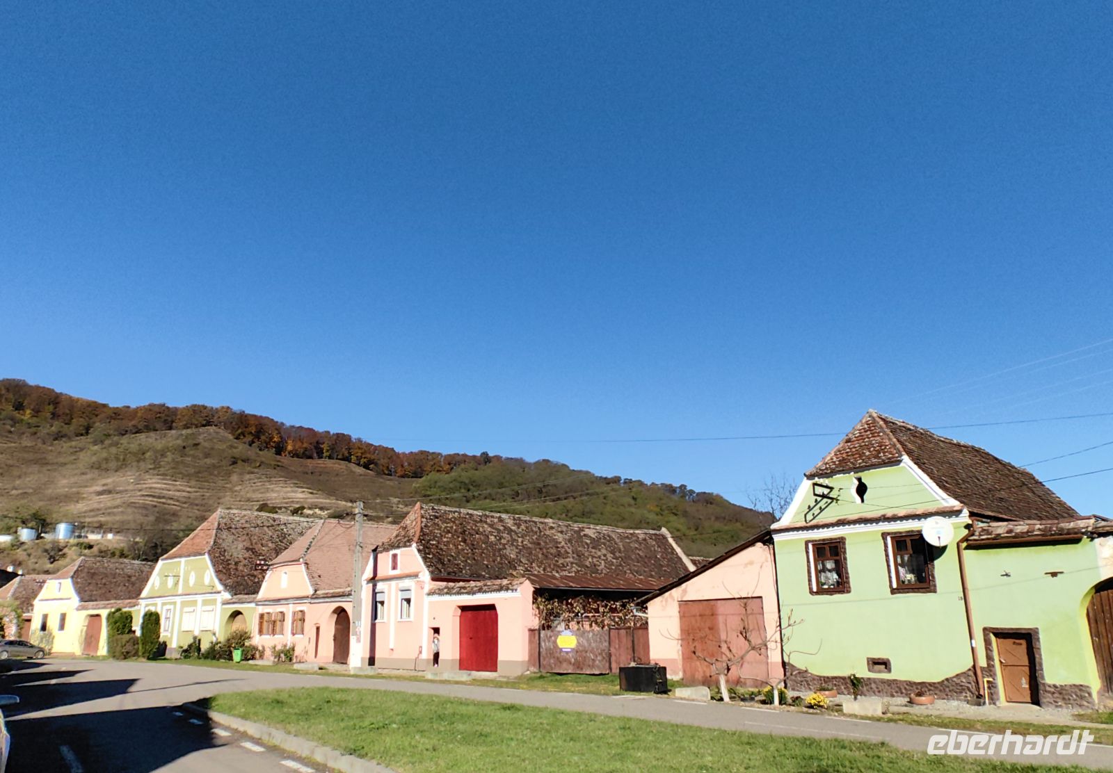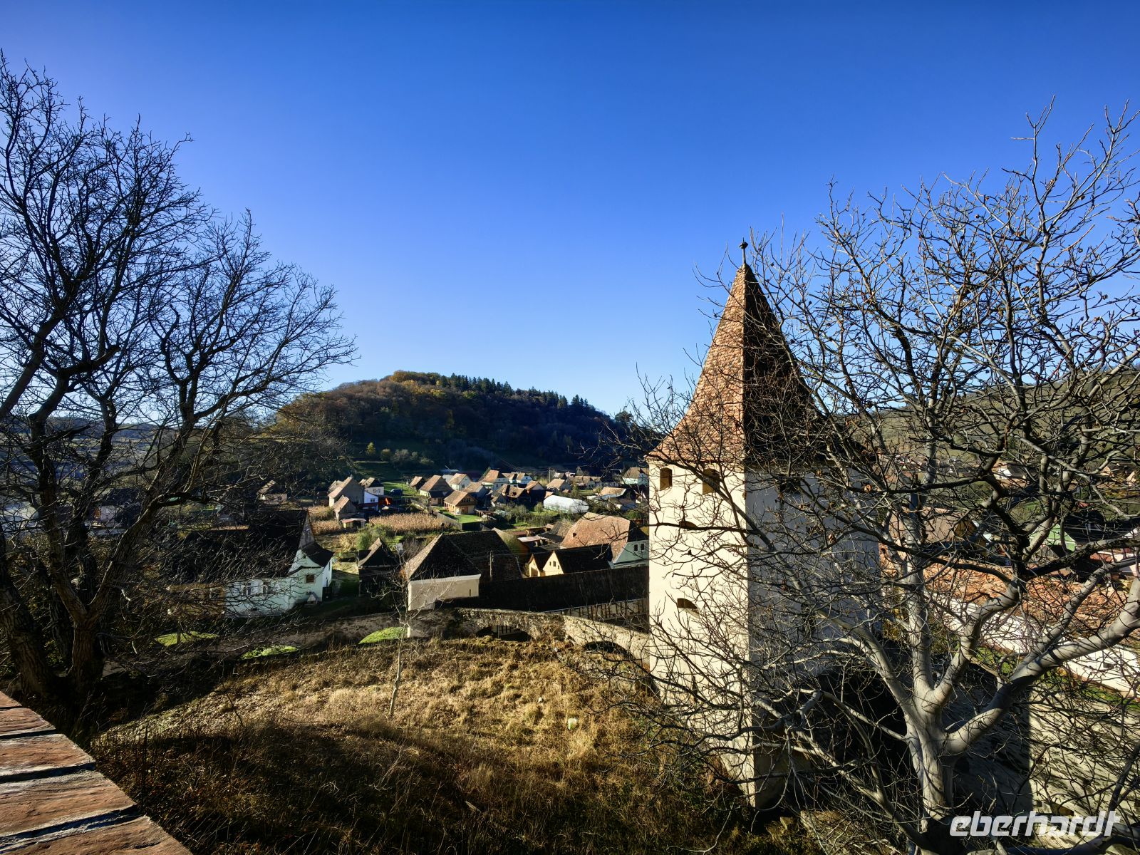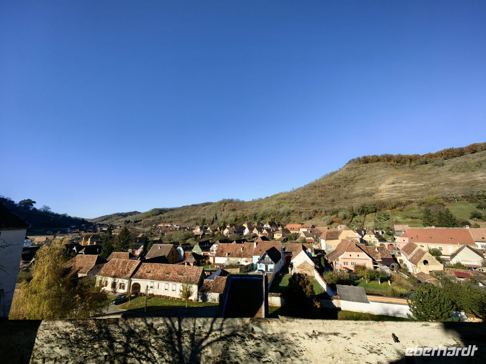 Heute Morgen regnet es, die Wolken hängen tief und wir brechen nach Harman auf, zu deutsch Honigberg. Wir besichtigen eine der am besten erhaltenen Kirchenburgen in ganz Rumänien. Sie war einst eine bäuerliche Wehranlage der Siebenbürger Sachsen. Um 1300 wurde die ursprüngliche Kapelle errichtet. Die Besonderheit an dieser Kirche sind Vorratskammern, die sich wie Nester von Schwalben unter der Traufe an das Mittelschiff schmiegen. Diese Lebensmittelspeicher brauchte man, um sich während der widerholten Angriffe der Osmanen im 16. Jahrhundert und der Ungarn im 17. Jahrhundert monatelang verschanzen zu können. Die sogenannten Specktürme beherbergten, wie ihr Name schon andeutet, tatsächlich gepökeltes Fleisch und Speck und nur durch sie war es möglich, den Eroberungsversuchen zu entgehen. Wir schauen uns das das Innere der Kirche an und besichtigen die Räume im Ringwall, wo man einen guten Eindruck bekommt, wie die Siebenbürger Sachsen in den vergangenen Jahrhunderten gelebt haben. Am Ende steigen wir die steile Treppe zum Festungswall hinauf und umrunden das ganze Areal.