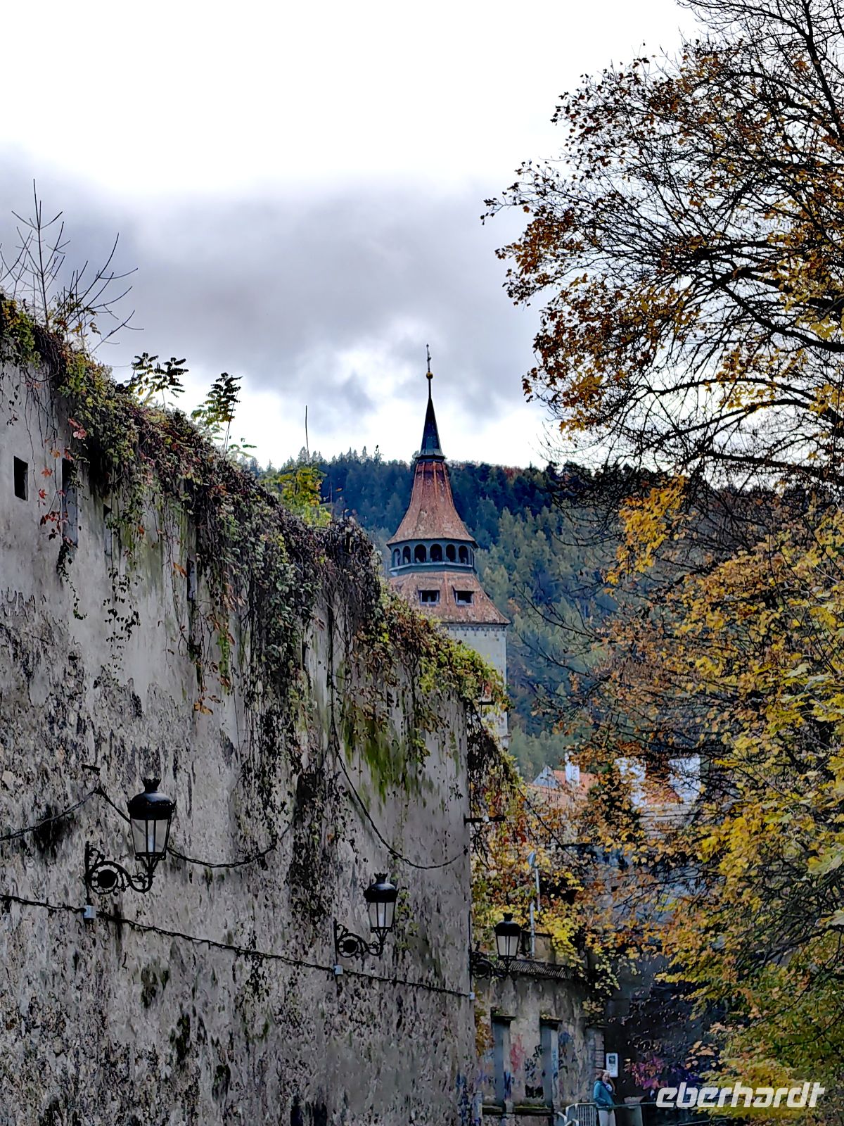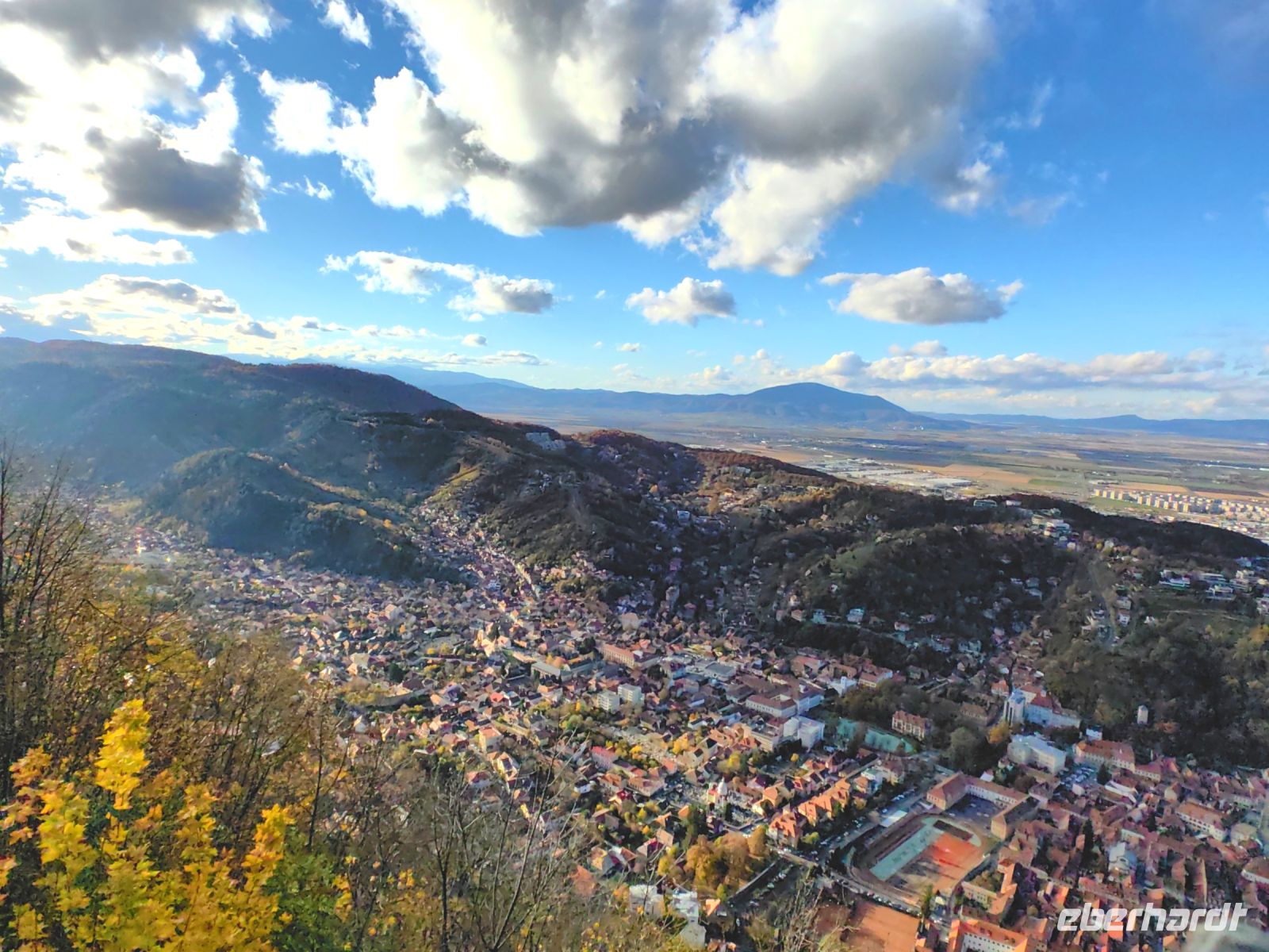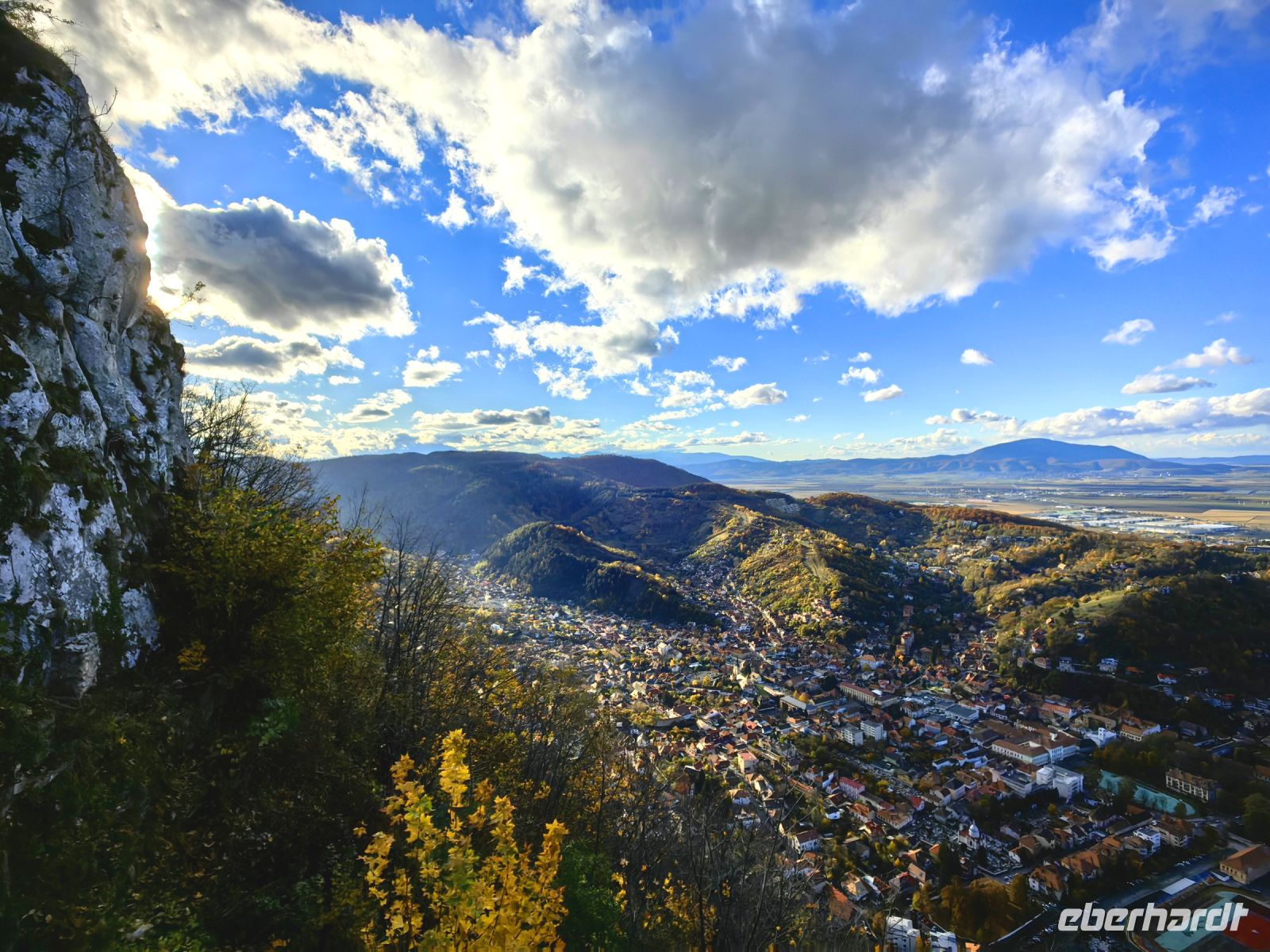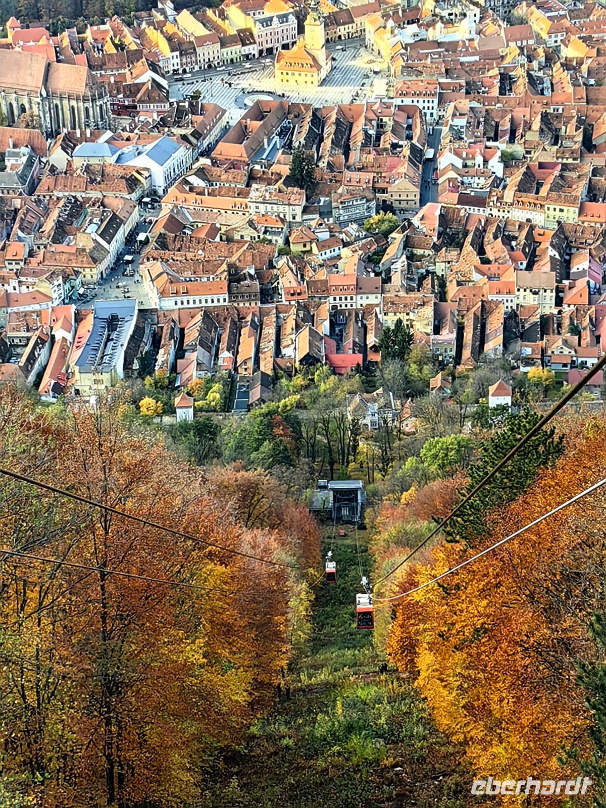 Entlang der Stadtmauer laufen wir zum Katharinentor und schauen uns den beeindruckenden Marktplatz mit dem Rathaus an und wollen gleich darauf noch die berühmte Biserica Neagra (die Schwarze Kirche) besichtigen. Sie beherbergt eine Sammlung an Orientteppichen und zählt zu den bedeutendsten Baudenkmälern Rumäniens. Ursprünglich wurde sie der Heiligen Jungfrau Maria gewidmet und war eine katholische Kirche. Mit der Reformation in Siebenbürgen, wurde das katholische Patrozinium aufgegeben und heute ist sie ein evangelisches Gotteshaus. Den Namen Schwarze Kirche verdankt sie einem Stadtbrand im Jahre 1689. Eigentlich sollten wir jetzt das Geschichtsmuseum besuchen, welches jedoch montags geschlossen ist. Daher beschließen wir kurzerhand, bei dem traumhaften Wetter, was alles goldene Herbstfarben taucht, die neu eröffnete Seilbahn auf den Hausberg auszuprobieren und schwingen uns hoch hinauf. Von hier oben hat man einen wunderbaren Blick über goldgelbe Hänge hinunter zur Altstadt, auf der anderen Seite bis zum schneebedeckten Königsstein. Wir schießen wunderschöne Fotos und fahren wieder hinunter, um ein wenig freie Zeit in der Altstadt zu genießen.