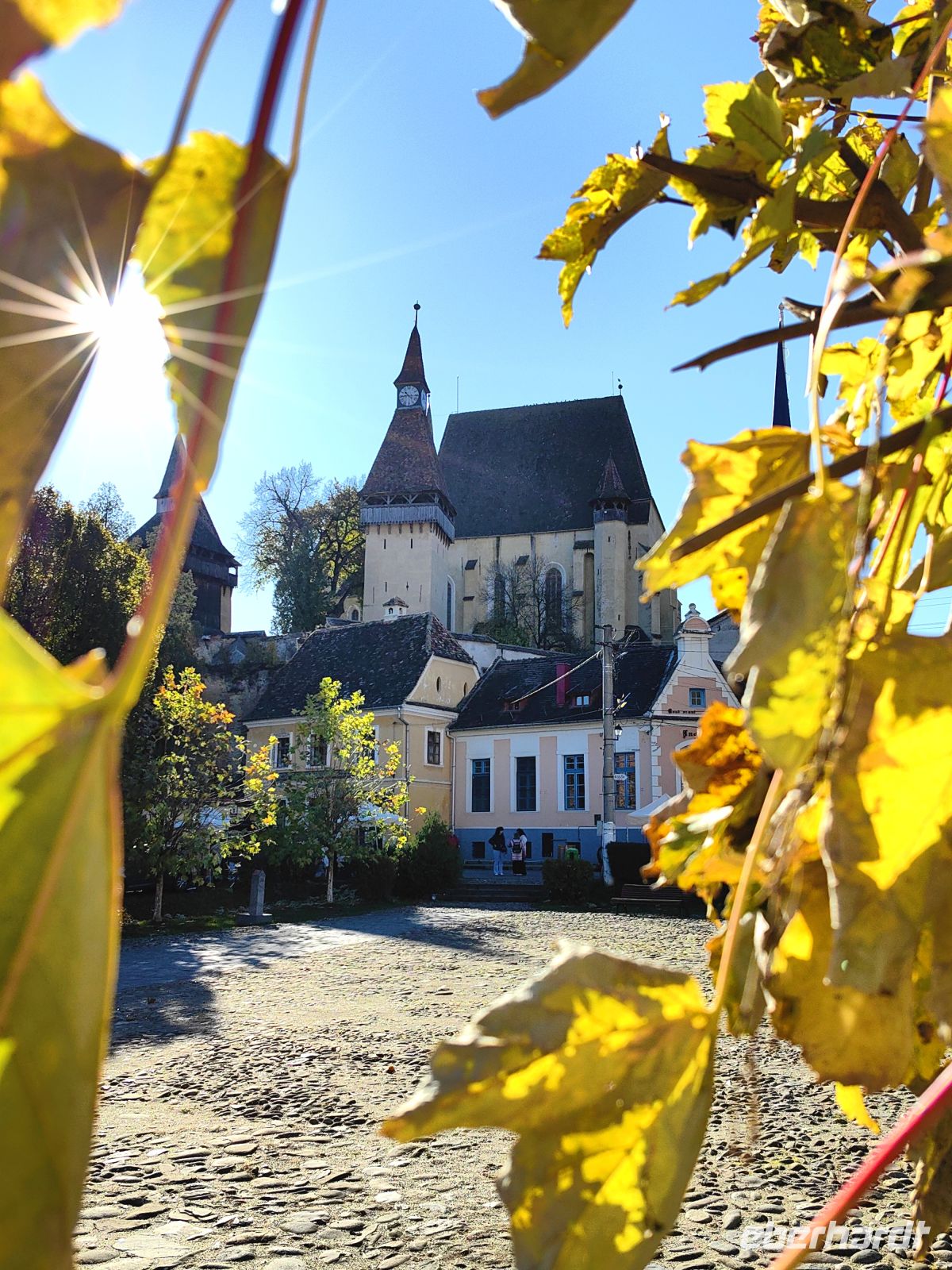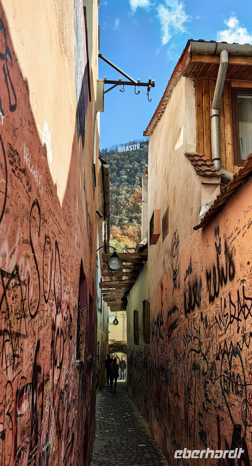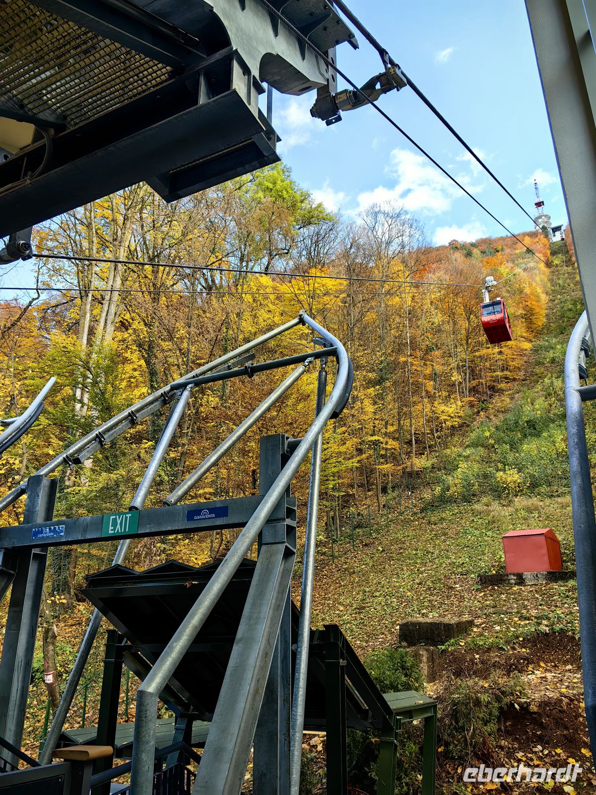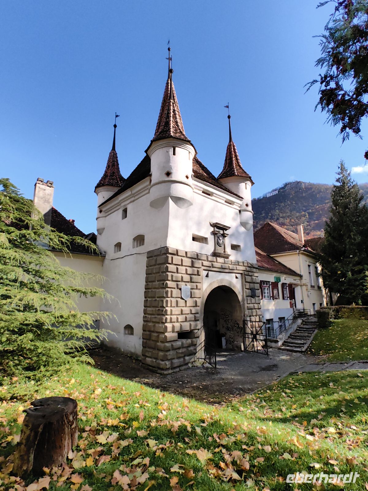 Entlang der Stadtmauer laufen wir zum Katharinentor und schauen uns den beeindruckenden Marktplatz mit dem Rathaus an und wollen gleich darauf noch die berühmte Biserica Neagra (die Schwarze Kirche) besichtigen. Sie beherbergt eine Sammlung an Orientteppichen und zählt zu den bedeutendsten Baudenkmälern Rumäniens. Ursprünglich wurde sie der Heiligen Jungfrau Maria gewidmet und war eine katholische Kirche. Mit der Reformation in Siebenbürgen, wurde das katholische Patrozinium aufgegeben und heute ist sie ein evangelisches Gotteshaus. Den Namen Schwarze Kirche verdankt sie einem Stadtbrand im Jahre 1689. Eigentlich sollten wir jetzt das Geschichtsmuseum besuchen, welches jedoch montags geschlossen ist. Daher beschließen wir kurzerhand, bei dem traumhaften Wetter, was alles goldene Herbstfarben taucht, die neu eröffnete Seilbahn auf den Hausberg auszuprobieren und schwingen uns hoch hinauf. Von hier oben hat man einen wunderbaren Blick über goldgelbe Hänge hinunter zur Altstadt, auf der anderen Seite bis zum schneebedeckten Königsstein. Wir schießen wunderschöne Fotos und fahren wieder hinunter, um ein wenig freie Zeit in der Altstadt zu genießen.
