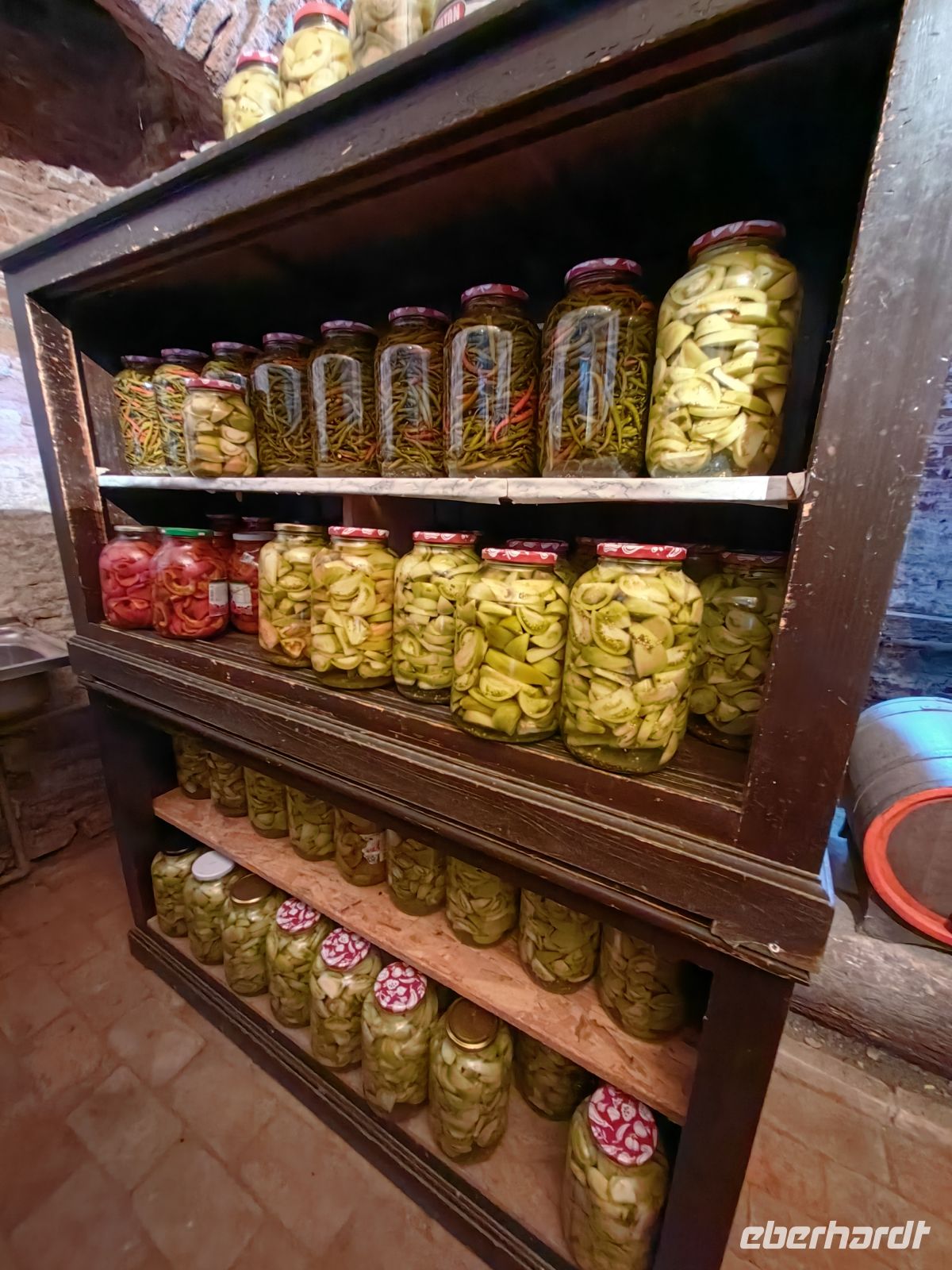 Am Nachmittag sind wir pflastermüde und uns steht der Sinn nach einer Weinprobe. Wir begeben uns nach Gallendorf, wo man uns im Weingut schon erwartet. Nachdem wir den Keller mit den riesigen Fässern inspiziert haben, verkosten wir einen weißen, einen rosé und einen roten Cuvee und Käsehäppchen und decken uns mit karamelisiertem Knoblauch, Trüffelcreme und Sacusca ein, bevor wir ins Hotel zurückkehren.
