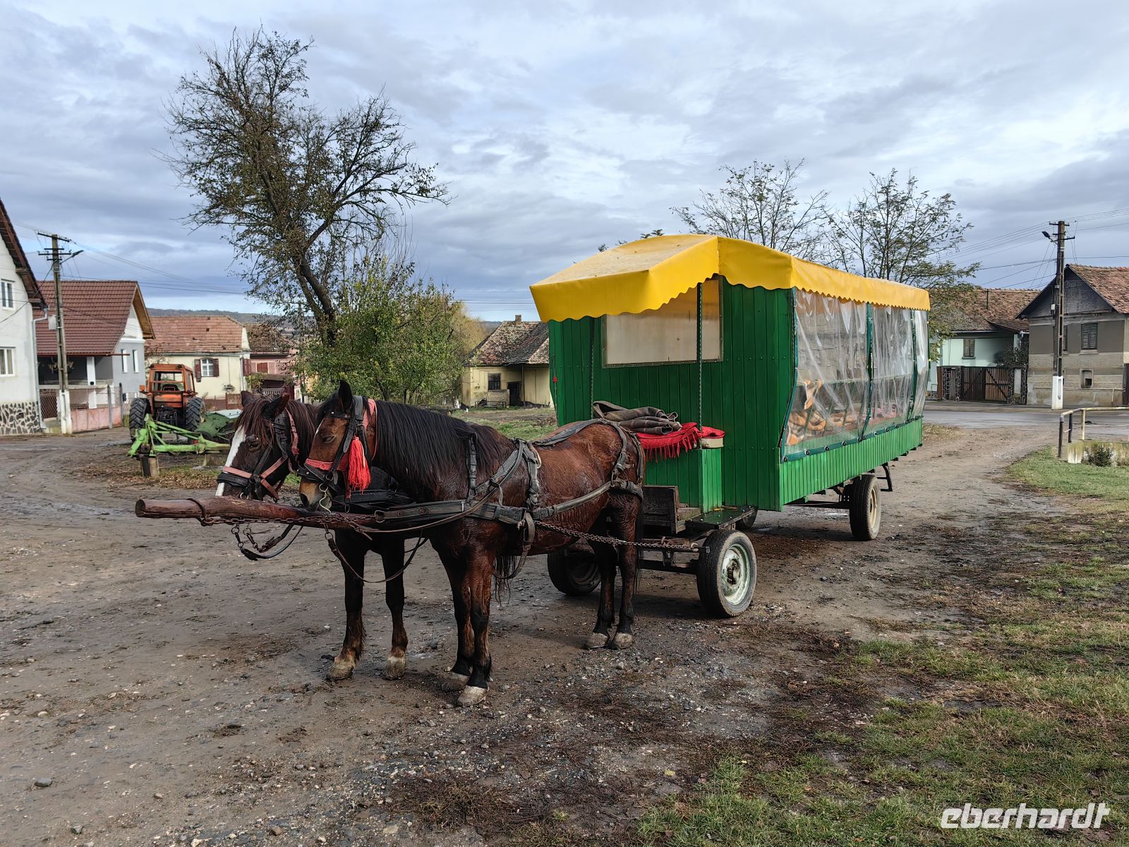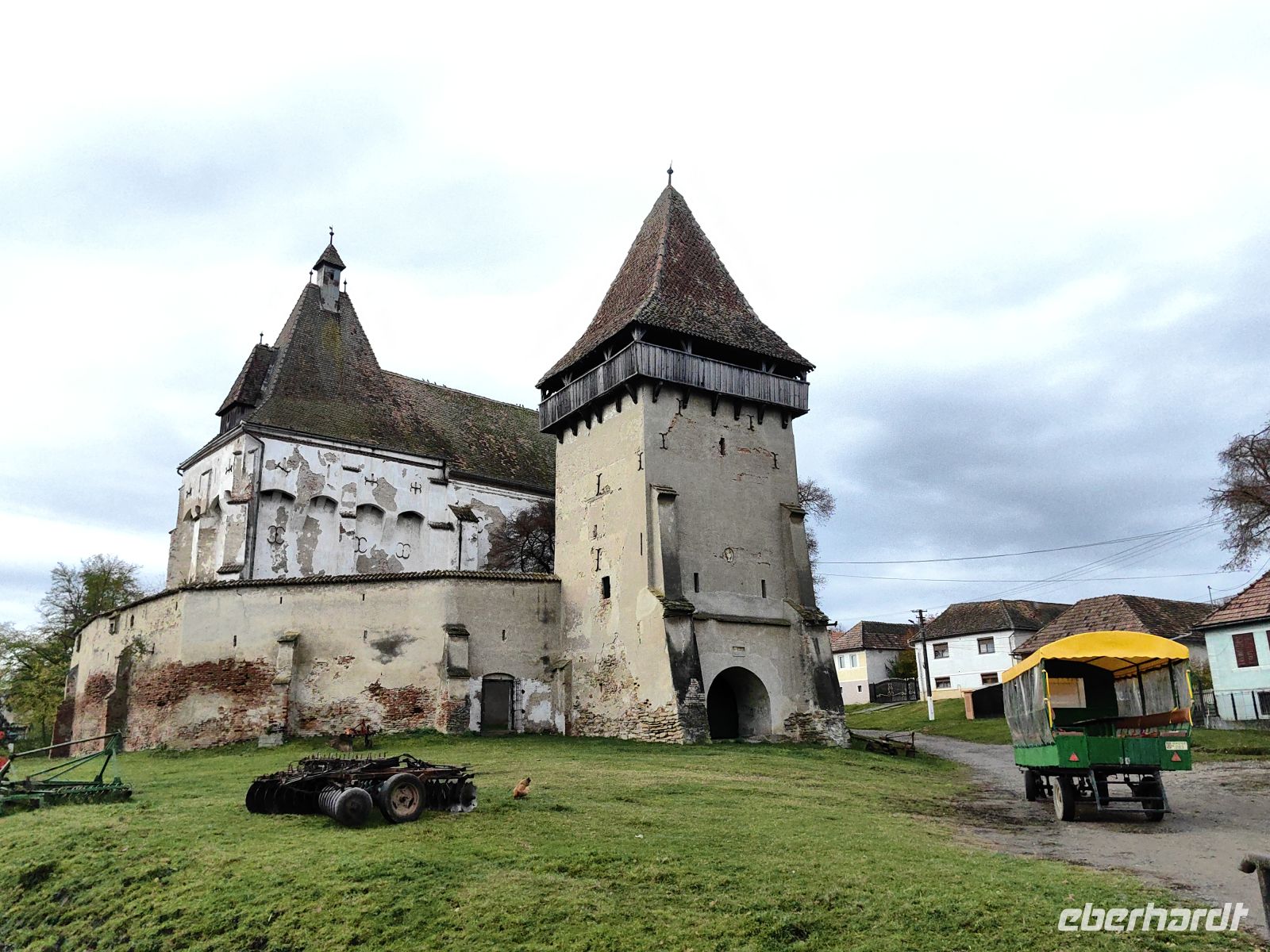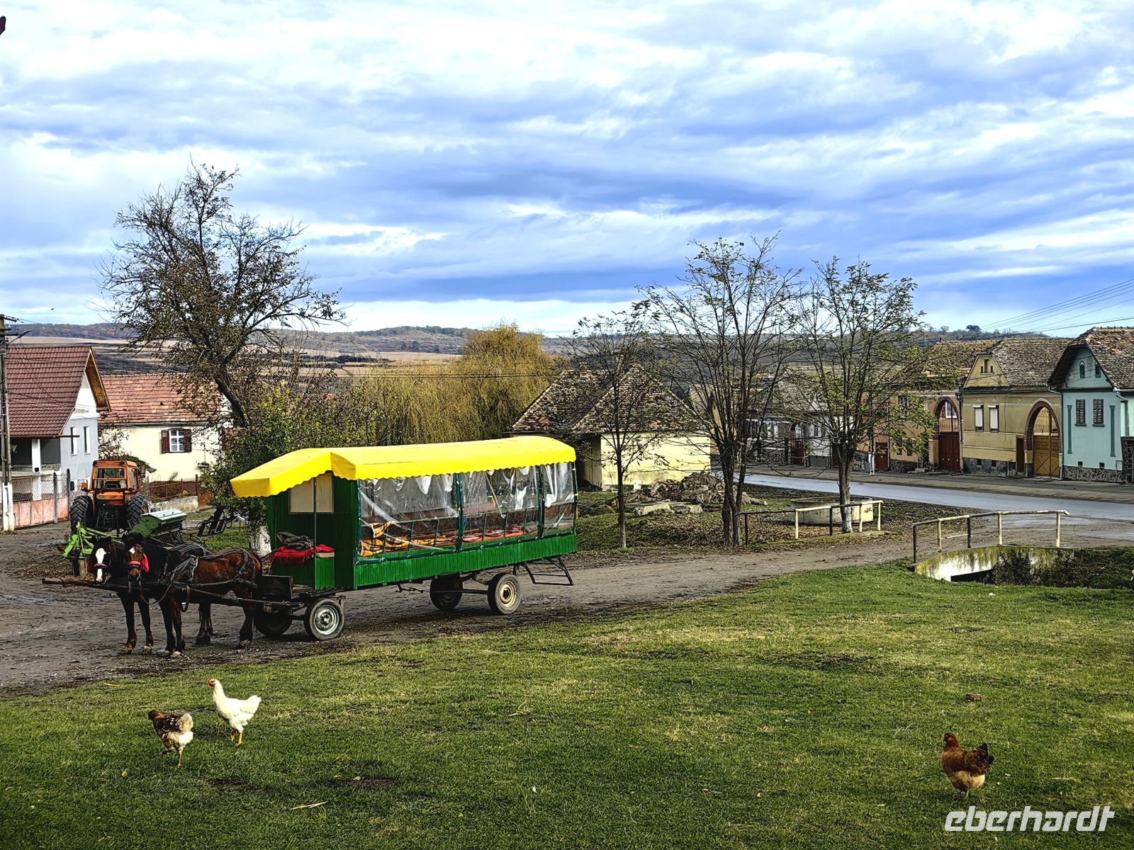 Nach dem Frühstück verlassen wir Medias und fahren nach Bazna. Dort erwartet uns ein Roma mit seinem Pferdewagen und bringt uns nach Boian zu einer verfallenen Kirchenburg. Am Wegesrand sehen wir Strauße, die Kühe und Wasserbüffel, die sonst immer hier im Tal grasen, sind nicht zu erblicken. Leider spielt das Wetter heute nicht ganz mit, und wir sind froh als wir in das geschlossene Gemäuer kommen. Man renoviert gerade innen und das gesamte Gestühl ist abgebaut, wir trinken einen Rotwein und fahren weiter nach Agnita