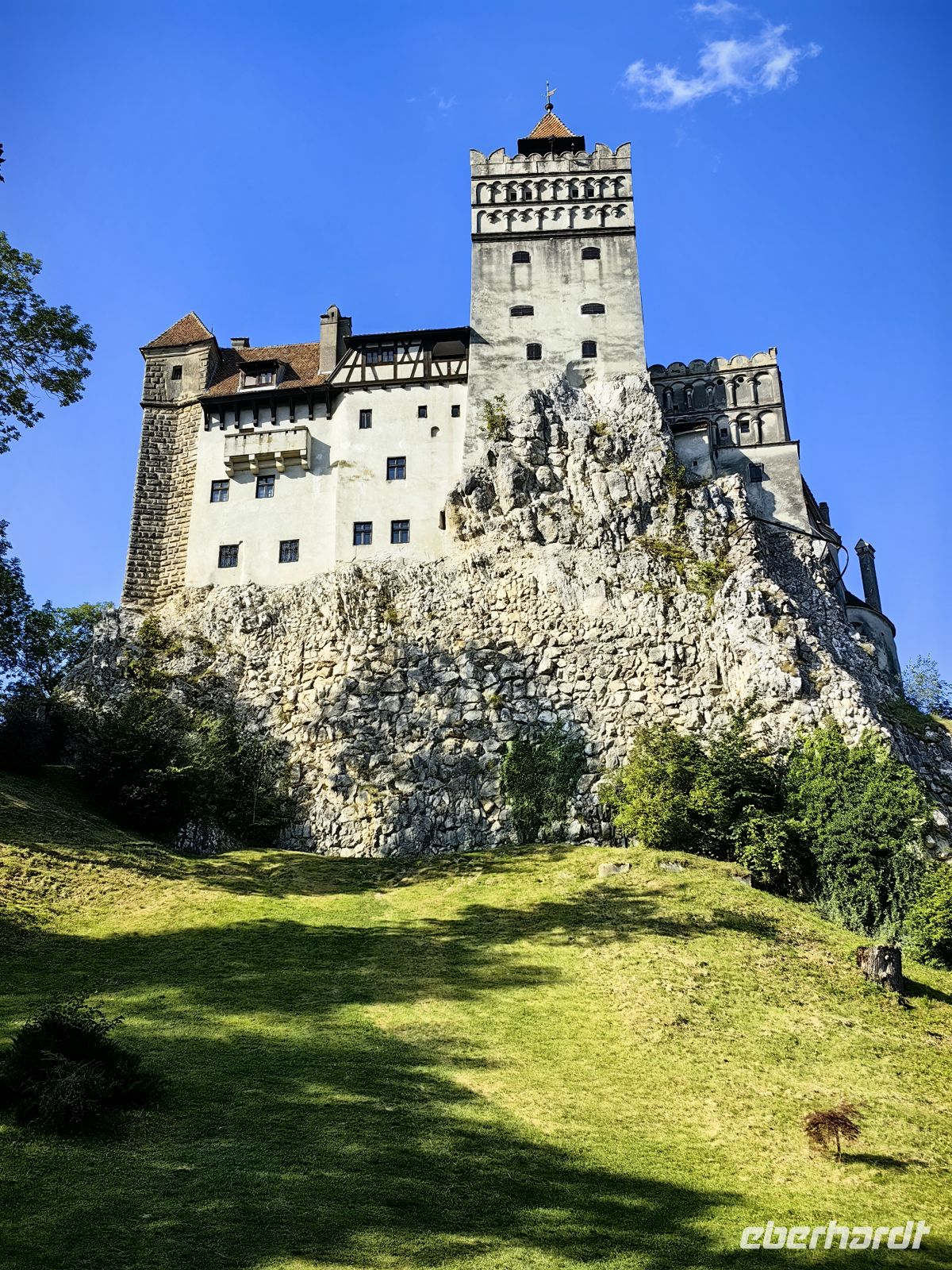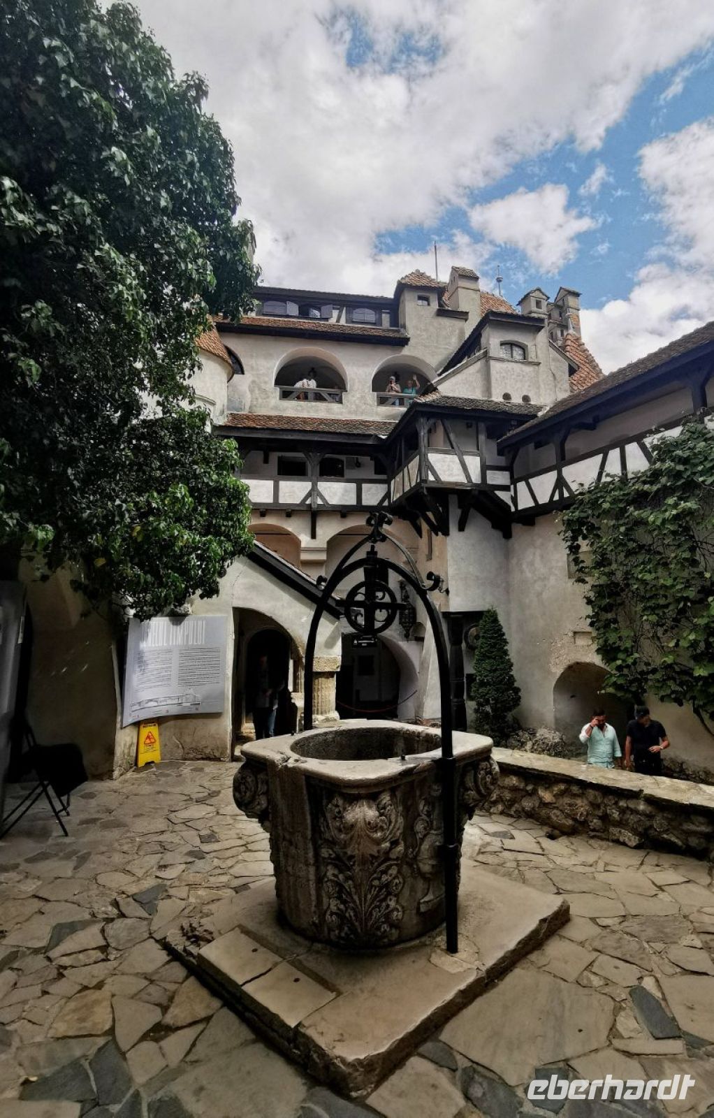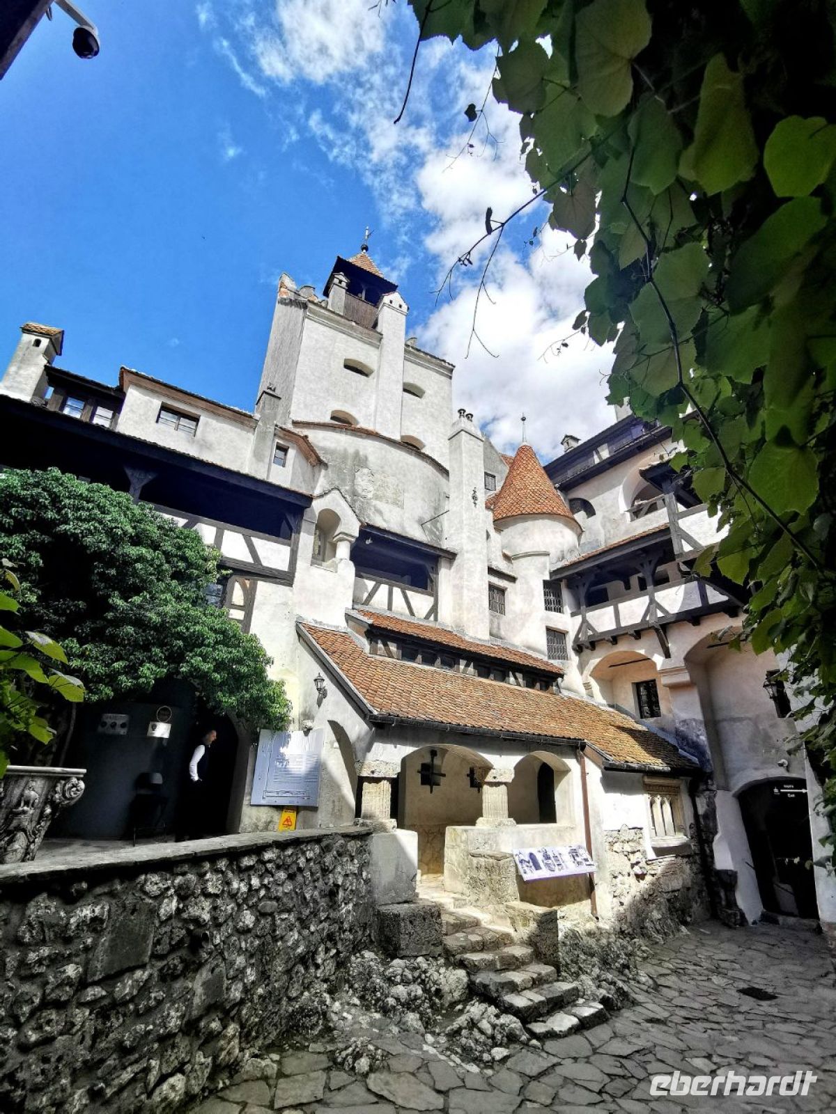 Endlich am Nachmittag erreichen wir Bran, wo die berühmte Törzburg steht. Mächtig erhebt sich dieses alte Gemäuer über der gleichnamigen Ortschaft in Transsilvanien. Tatsächlich umgibt diese Burg eine düstere Atmosphäre und durch viele Draculafilme ausgelöst, läuft beim Anblick des Anwesens so manchem Besucher ein eiskalter Schauer über den Rücken. Alle haben die berühmte Romanfigur des irischen Schriftstellers Bram Stoker in bester Erinnerung. Stoker hatte bei den Recherchen zu seinem Roman eine Zeichnung dieser Burg gefunden und siedelte seinen Roman hier an. Als historische Vorlage für seinen Dracula diente ihm Vlad III. Draculea, ein walachischer Fürst, der Angst und Schrecken unter seinen Feinden durch seine Vorliebe für das Pfählen verbreitete. Es ist viel los, da heute Sonntag ist und so müssen wir eine Weile anstehen, bevor wir in die engen Gänge der Burg hineinkommen.