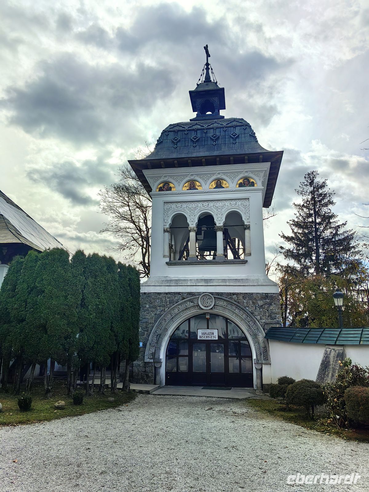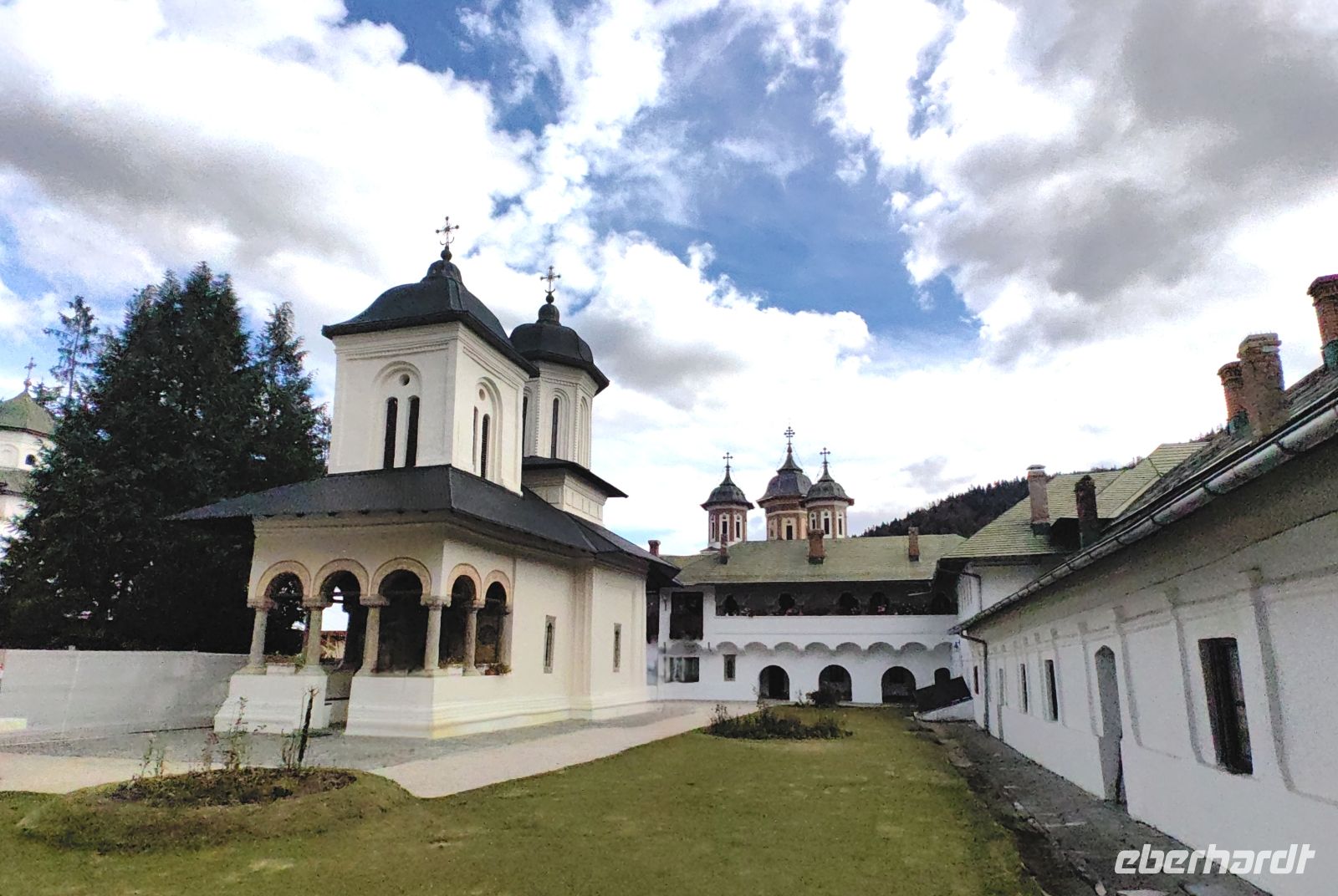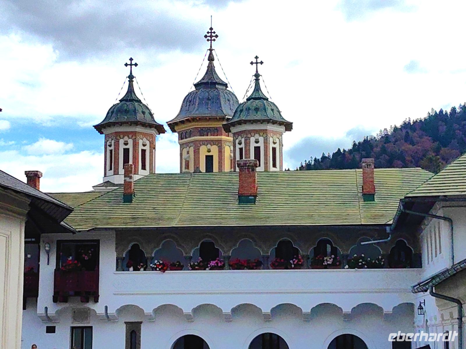 Umgeben von einer spektakulären Berglandschaft liegt das Kloster am Ortsrand. An diesem spirituellen Rückzugsort aus dem 17. Jahrhundert, an dem es jahrhundertealte Fresken und religiöse Schätze zu bewundern gibt, lebt heute noch eine kleine Gruppe christlich-orthodoxer Mönche. Die alte Kirche wurde 1695 erbaut. Den stattlichen Eingang mit seinem wunderschön gestalteten Steinportal, der kunstvoll verzierten Tür und den Fresken, die Szenen aus dem Leben der Heiligen Katharina darstellen, widmen wir besondere Aufmerksamkeit. Die Inschrift über dem Eingang stammt aus dem Jahr 1795, als die Kirche nach einem Brand restauriert wurde. Im Innern sind Wände und den Decken mit herrlichen Gemälde verziert. Die Goldmosaik-Malereien im neobyzantinischen Stil im Inneren der Dreifaltigkeitskirche zeigen berühmte Persönlichkeiten der rumänischen Geschichte, darunter König Carol I. und seine Gemahlin Elisabeth zu Wied. Zu den weiteren Highlights dieser Kirche gehören das kunstvoll verzierte Mobiliar aus vergoldeten Platanen sowie Stühle, die einst von Mitgliedern der königlichen Familie des Landes verwendet worden sind.