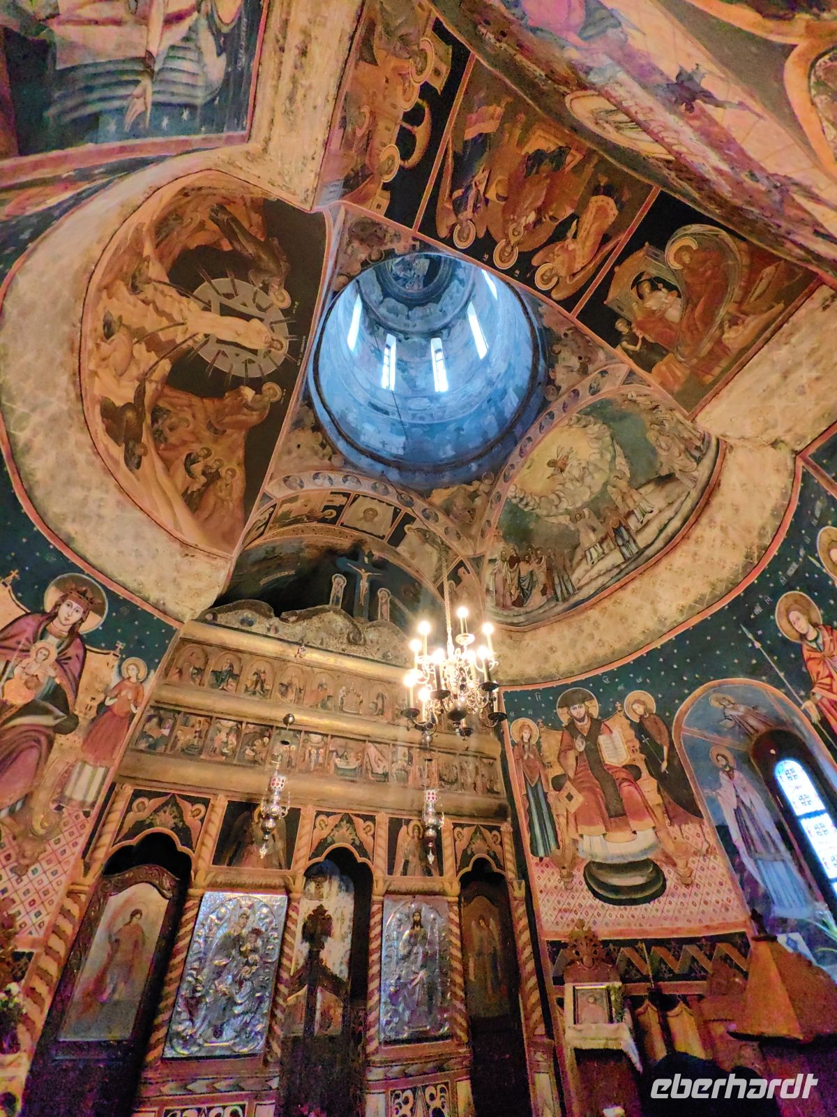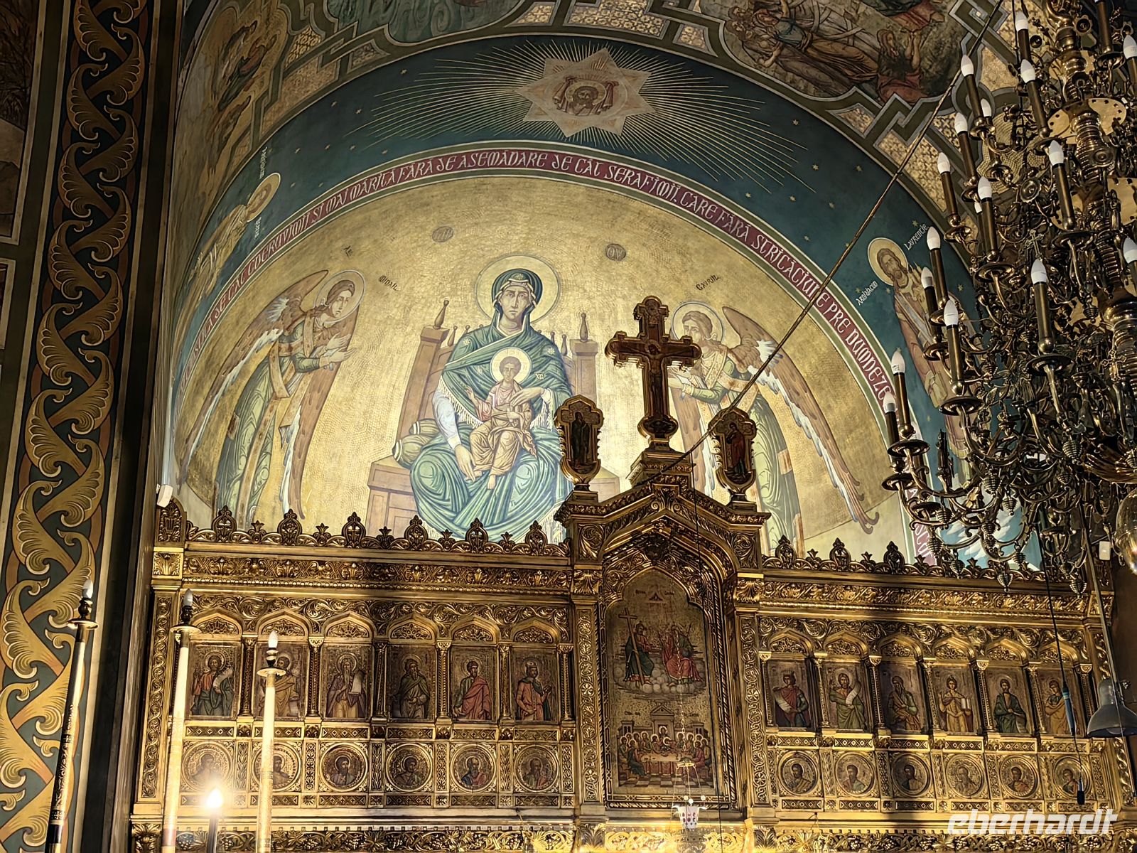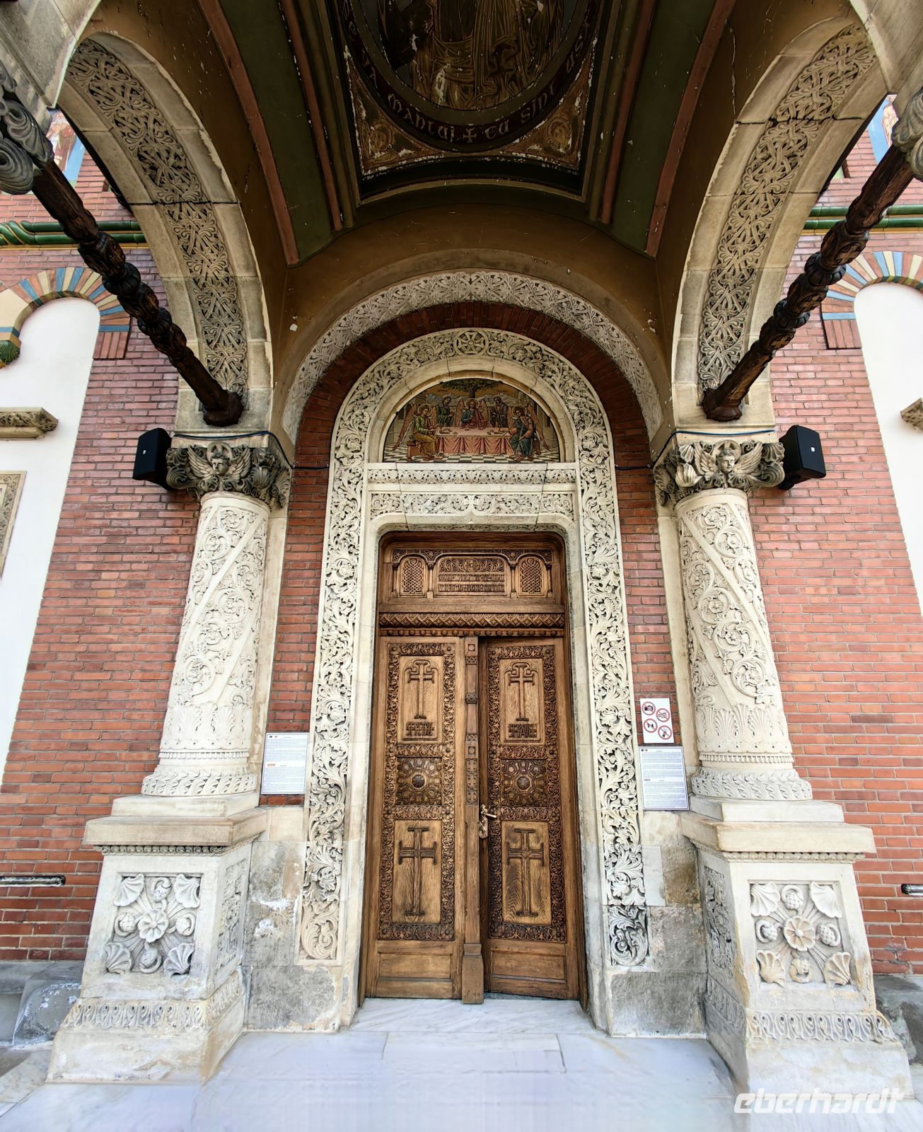 Umgeben von einer spektakulären Berglandschaft liegt das Kloster am Ortsrand. An diesem spirituellen Rückzugsort aus dem 17. Jahrhundert, an dem es jahrhundertealte Fresken und religiöse Schätze zu bewundern gibt, lebt heute noch eine kleine Gruppe christlich-orthodoxer Mönche. Die alte Kirche wurde 1695 erbaut. Den stattlichen Eingang mit seinem wunderschön gestalteten Steinportal, der kunstvoll verzierten Tür und den Fresken, die Szenen aus dem Leben der Heiligen Katharina darstellen, widmen wir besondere Aufmerksamkeit. Die Inschrift über dem Eingang stammt aus dem Jahr 1795, als die Kirche nach einem Brand restauriert wurde. Im Innern sind Wände und den Decken mit herrlichen Gemälde verziert. Die Goldmosaik-Malereien im neobyzantinischen Stil im Inneren der Dreifaltigkeitskirche zeigen berühmte Persönlichkeiten der rumänischen Geschichte, darunter König Carol I. und seine Gemahlin Elisabeth zu Wied. Zu den weiteren Highlights dieser Kirche gehören das kunstvoll verzierte Mobiliar aus vergoldeten Platanen sowie Stühle, die einst von Mitgliedern der königlichen Familie des Landes verwendet worden sind.