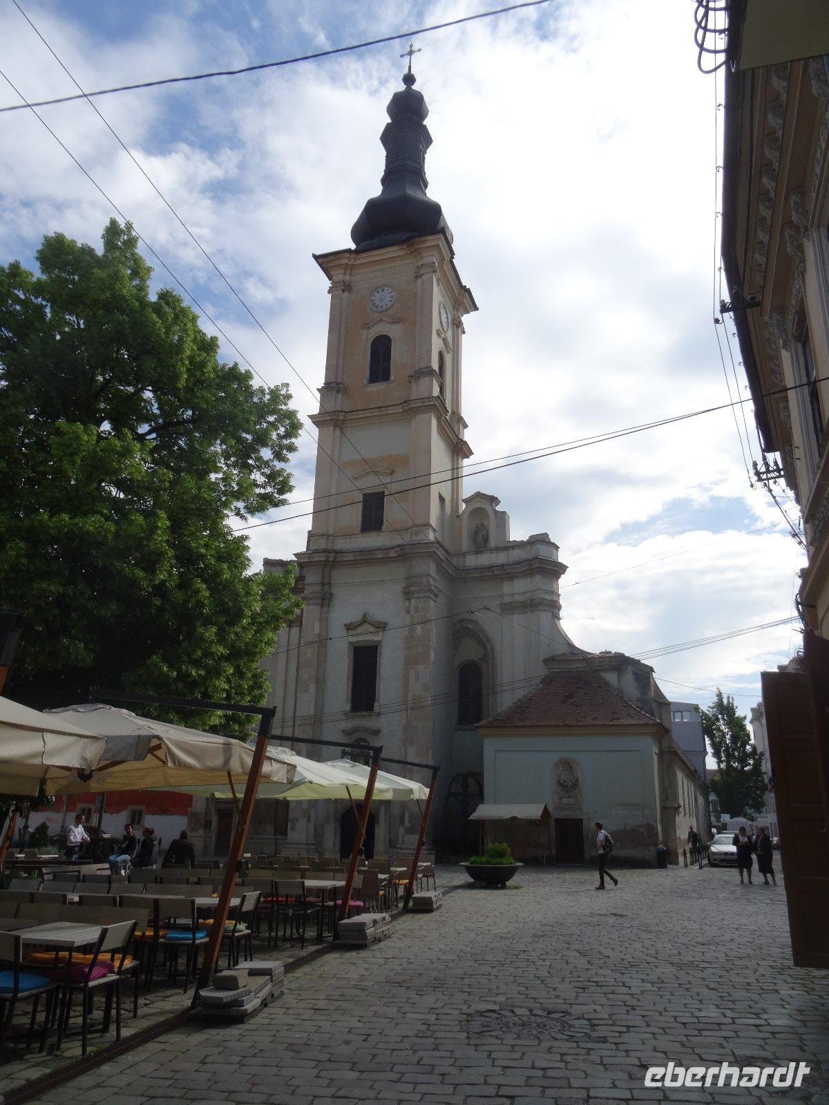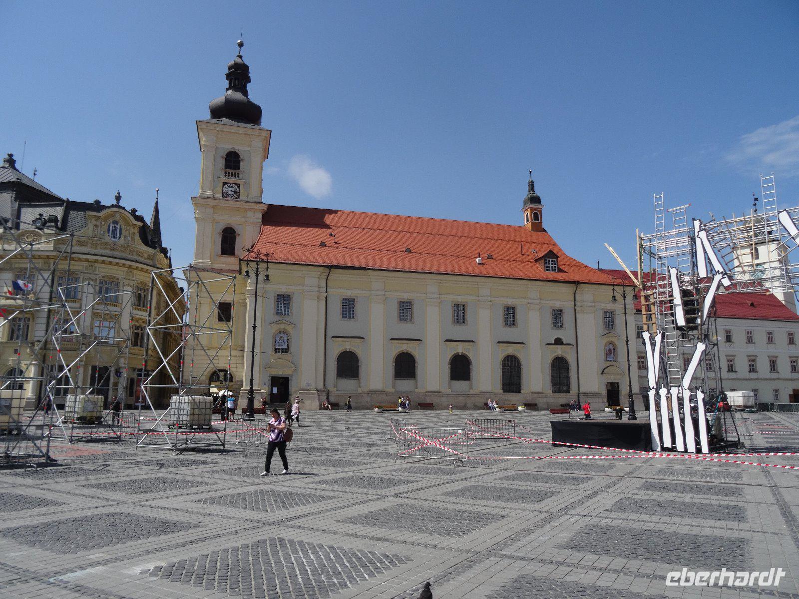 Es geht weiter nach Sibiu, wo wir gegen Mittag ankommen und zunächst eine wohlverdiente Pause einlegen. Rund um den großen Platz befinden sich zahlreiche Gasstätten, keiner wird hier verhungern. Auf dem Großen Platz befindet sich die mächtige römisch-katholische Kirche aus dem 18. Jahrhundert, einst von den Jesuiten errichtet. Die Gottesdienste finden hier in den Sprachen Deutsch, Ungarisch und Rumänisch statt. Weitere prächtige Häuser säumen den Platz, wie z. b. das blaue Stadthaus, das Brukenthal-Palais, die frühere Bahnkreditanstalt und das Jesuitenkolleg, heute Bischofssitz.