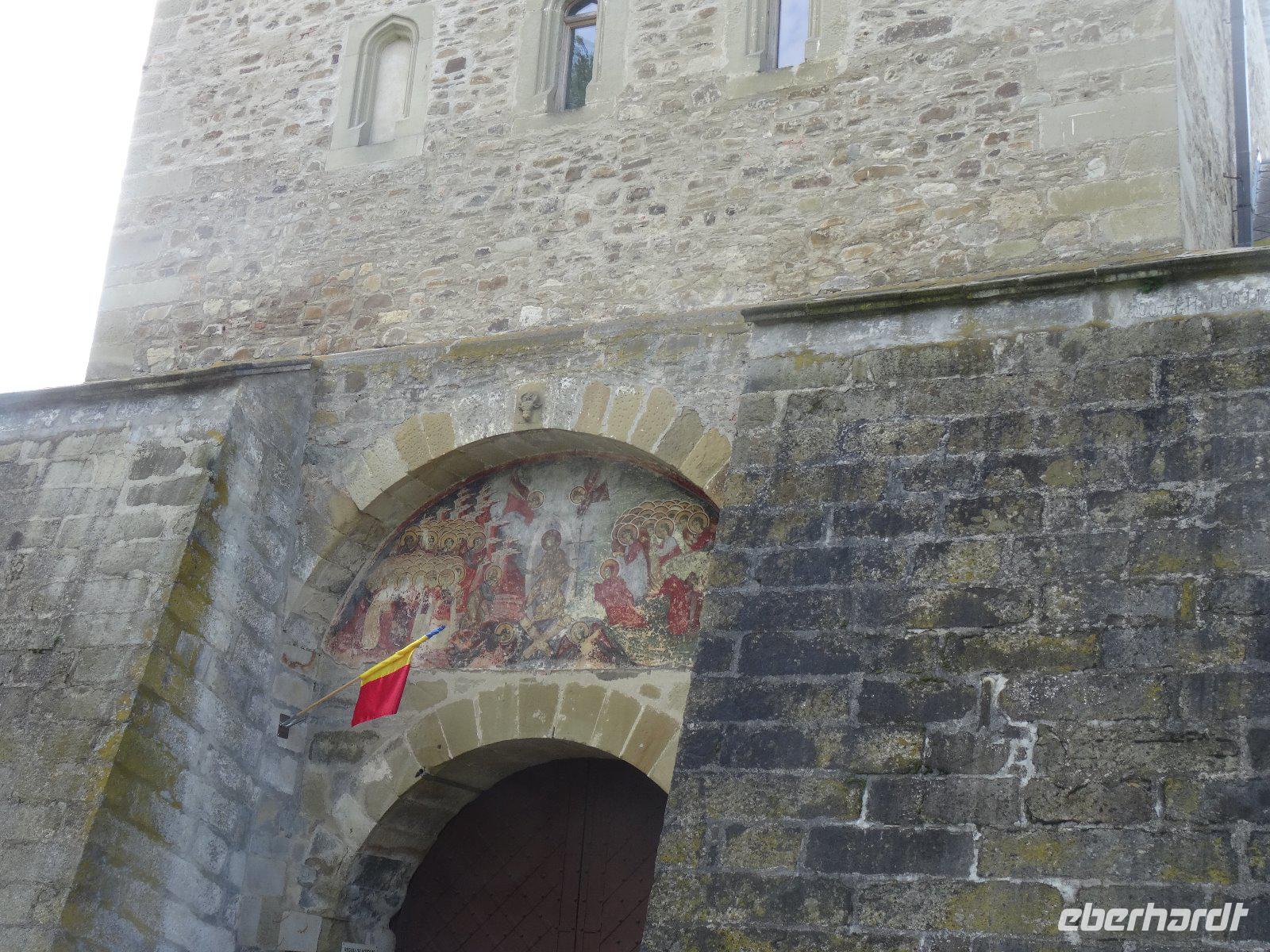 Pfarrer Zosim, der 1963 seinen Dienst in der Gemeinde Sibiel antrat, erkannte den großen Wert der Ikonen und begann, sie für sein Museum zu sammeln. So kann man hier heute mehrere 100 wunderschöne Ikonen bestaunen. Wir schauen noch kurz in die Dorfkirche von Sibiel hinein und dann wird es höchste Zeit für eine kleine Überraschung. Es wird die Besteigung eines Turms der Kirchenburg in Grossau (Cristian) angekündigt - Begeisterung kommt nicht wirklich auf. In Grossau angekommen, werden wir von Maria begrüßt und durch die Kirche geführt und dann kommt die Überraschung: der Turm wird geöffnet und er enthält das gleiche wie früher: Speck und Wurst, Schnaps und Brot. Alle sind beglückt und greifen beherzt zu - Danke an Eberhardt für die Aufrechterhaltung der Lebensgeister inmitten uralter Gemäuer.