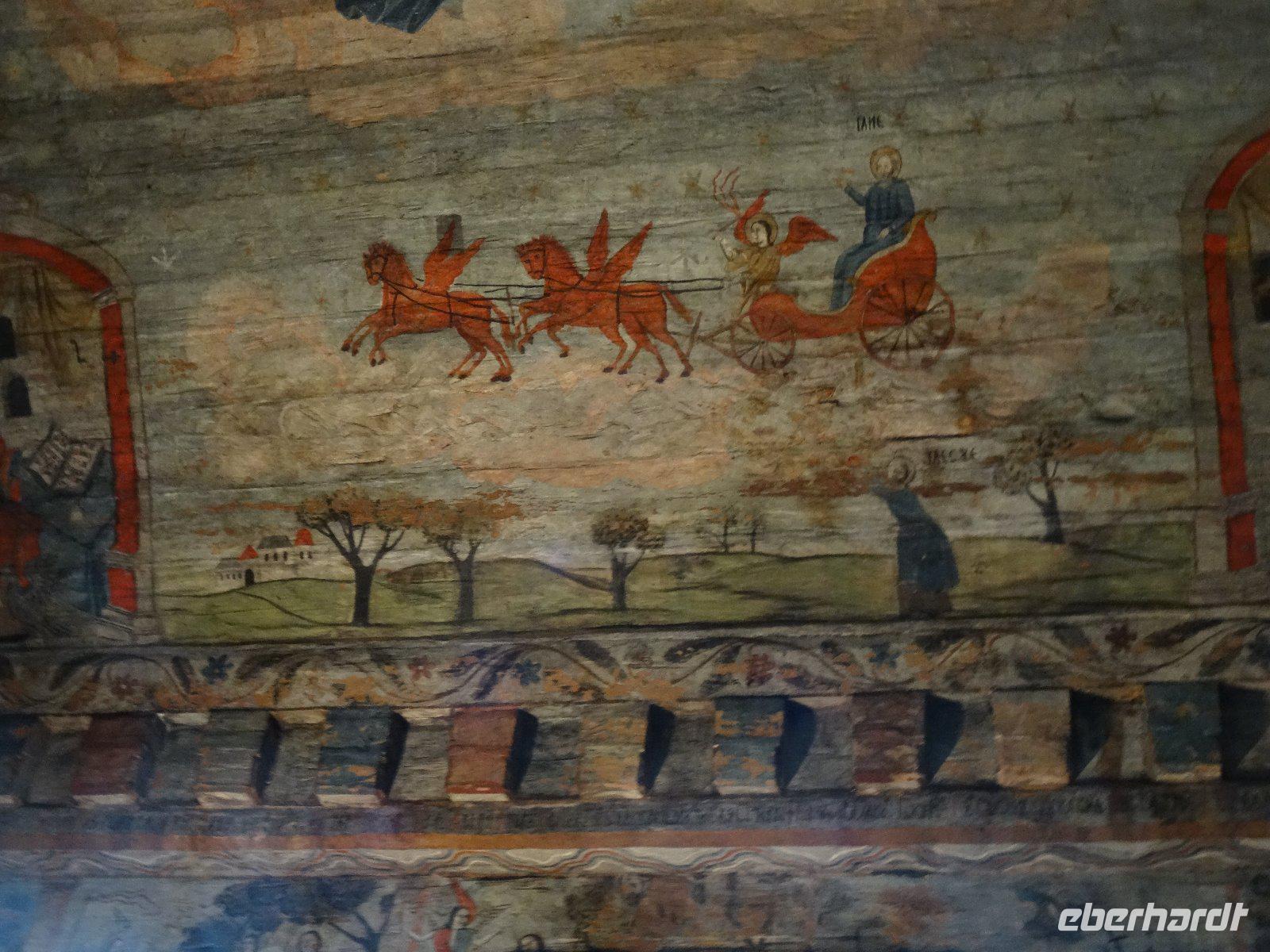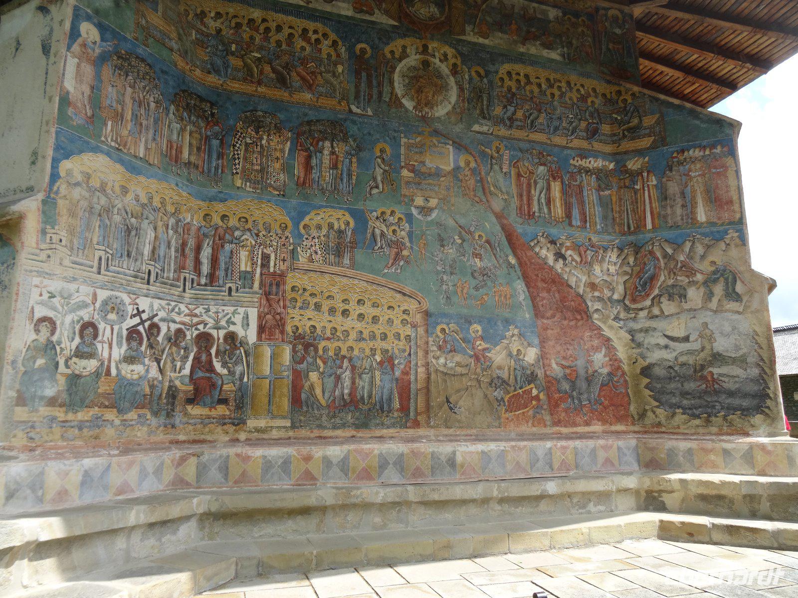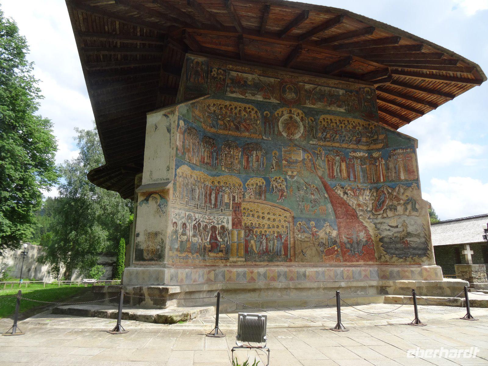 Das letzt Kloster in unserer Besuchsreihe ist Voronet. Es wurde 1488 von Stefan dem Großen errichtet und die Kirche ist dem heiligen Georg gewidmet. Die Malereien an und in der Kirche sind besonders leuchtend durch die Verwendung einer strahlend blauen Farbe. Besonders imposant ist die Darstellung des Jüngsten Gerichts, sehr anschaulich kämpfen Engel und Teufel um die Verstorbenen. Sehr anrührend dagegen ist die Darstellung des Paradieses mit Bäumen und Maria sowie Abraham, der die Menschen in seinem Schoß hält.