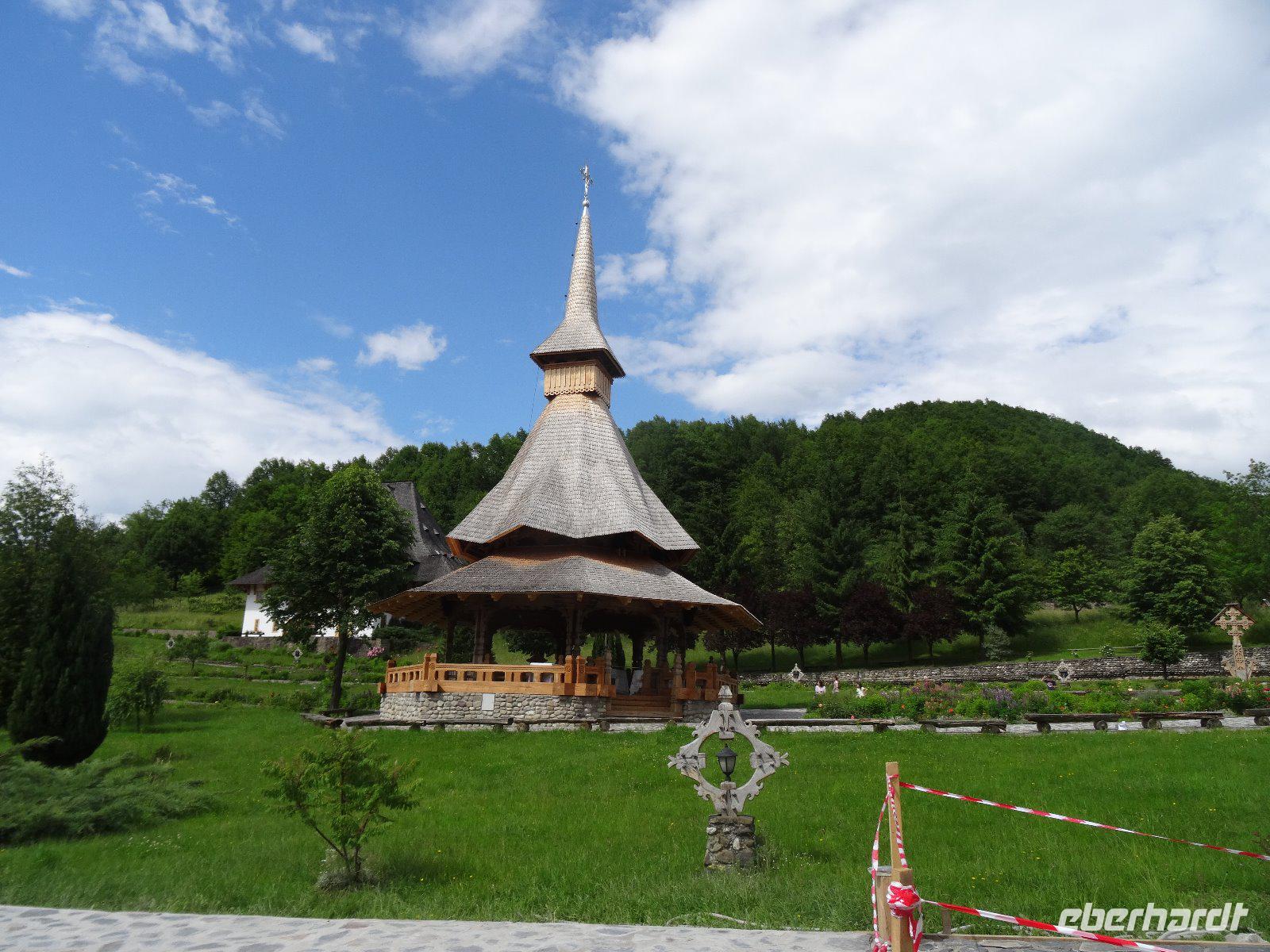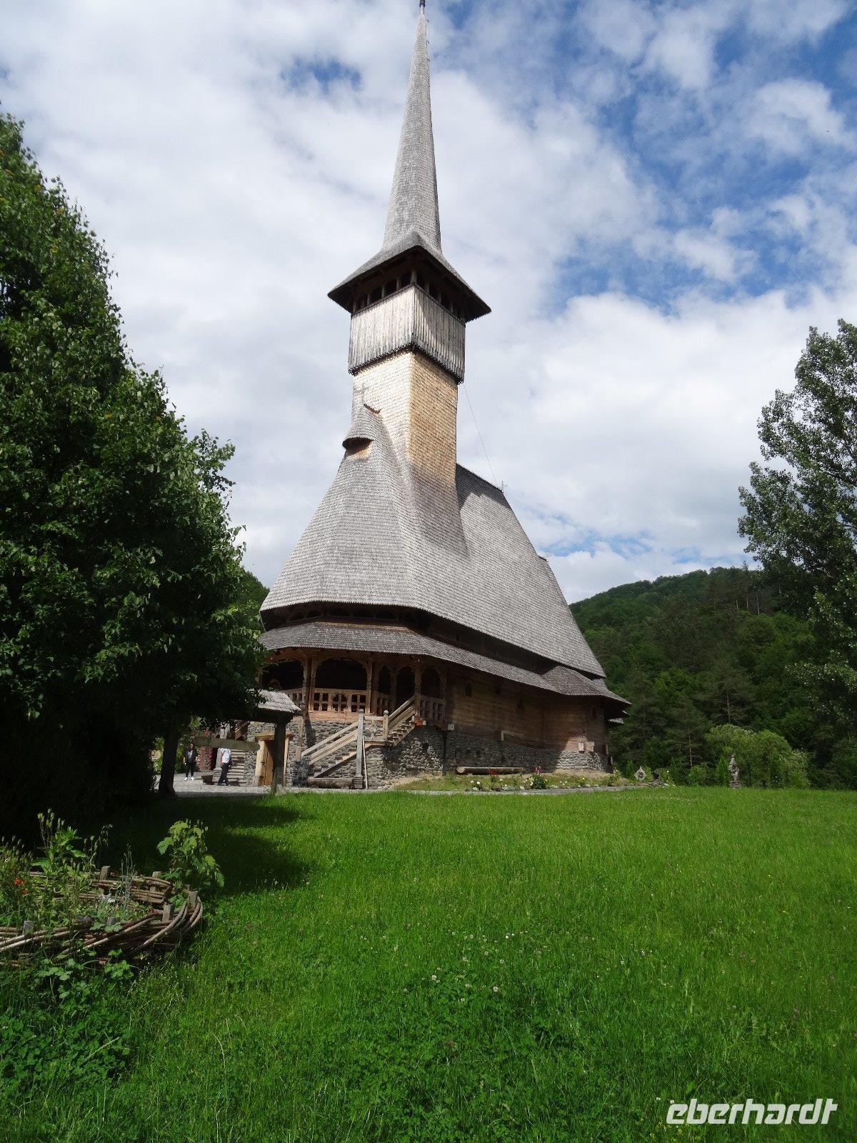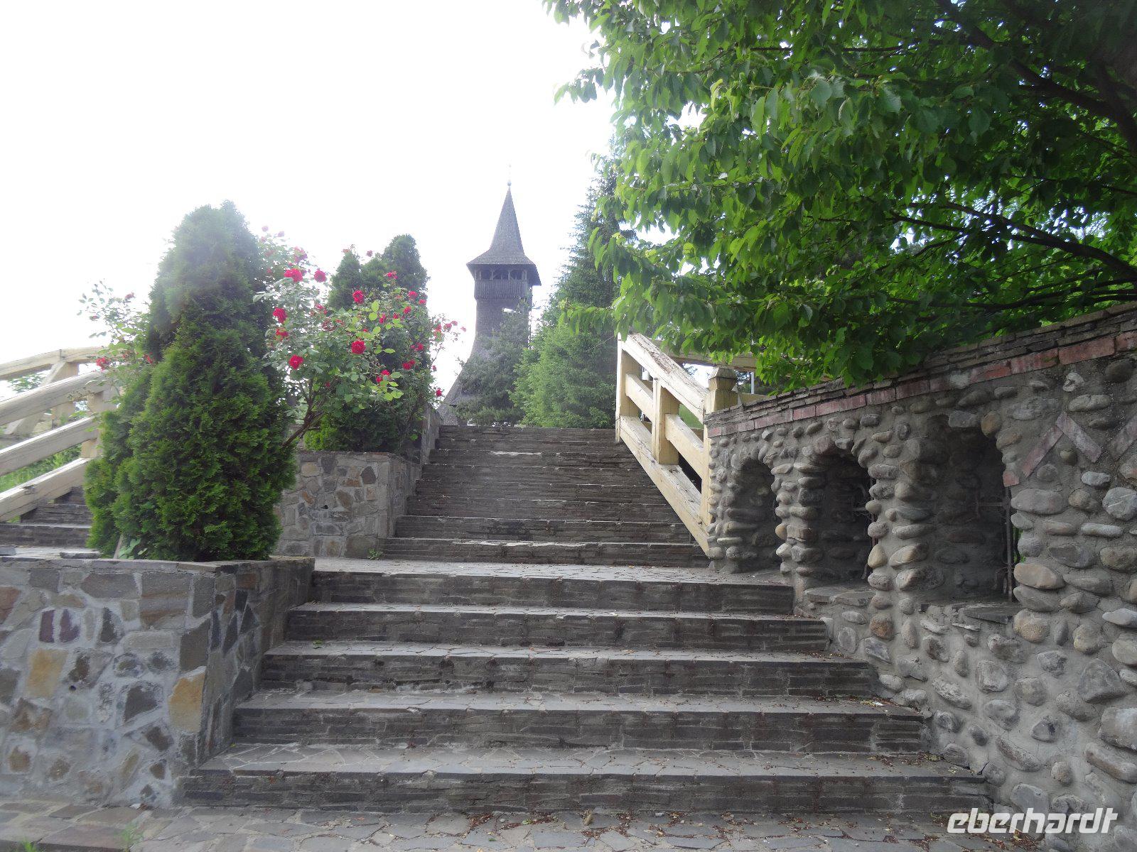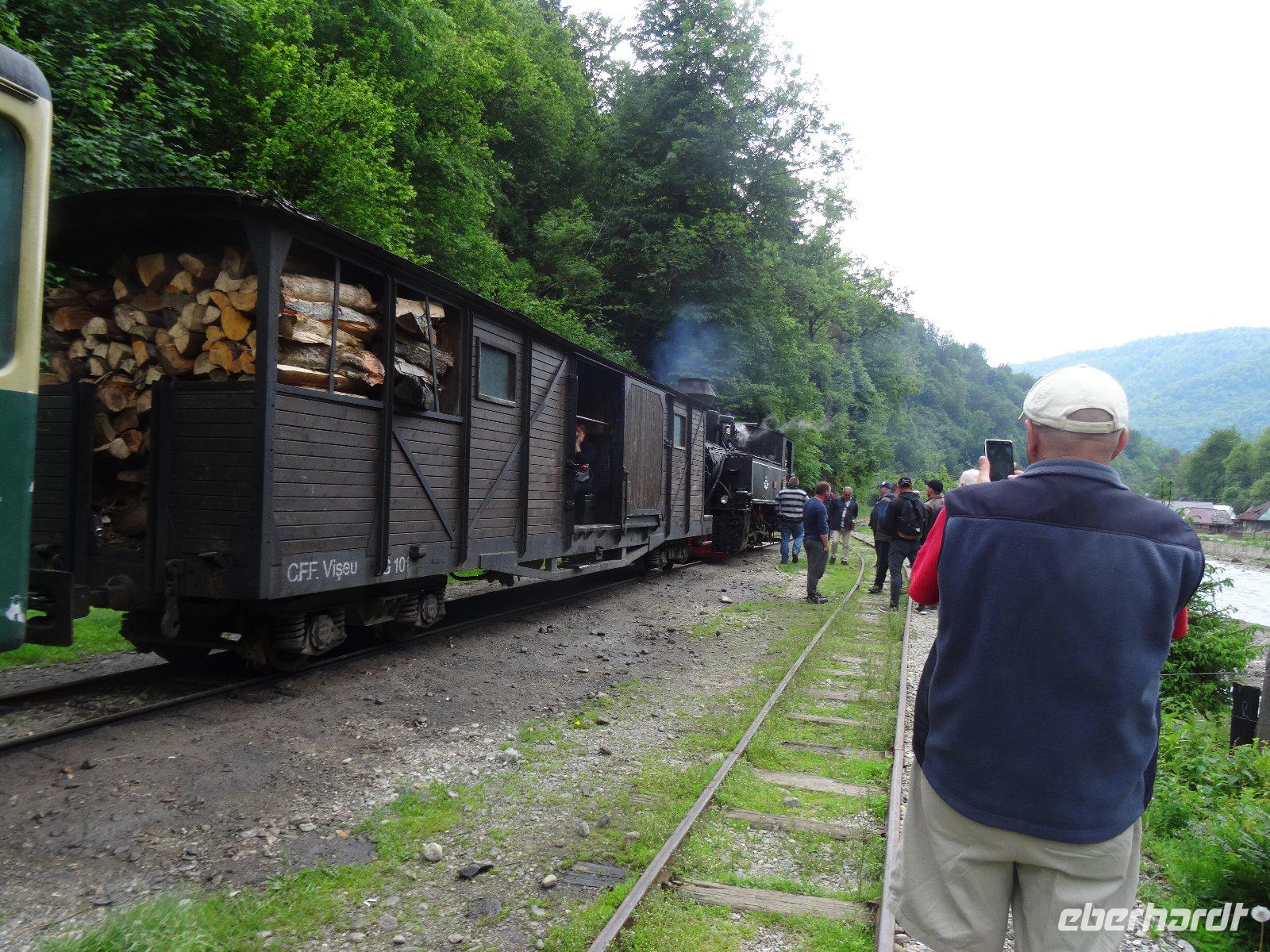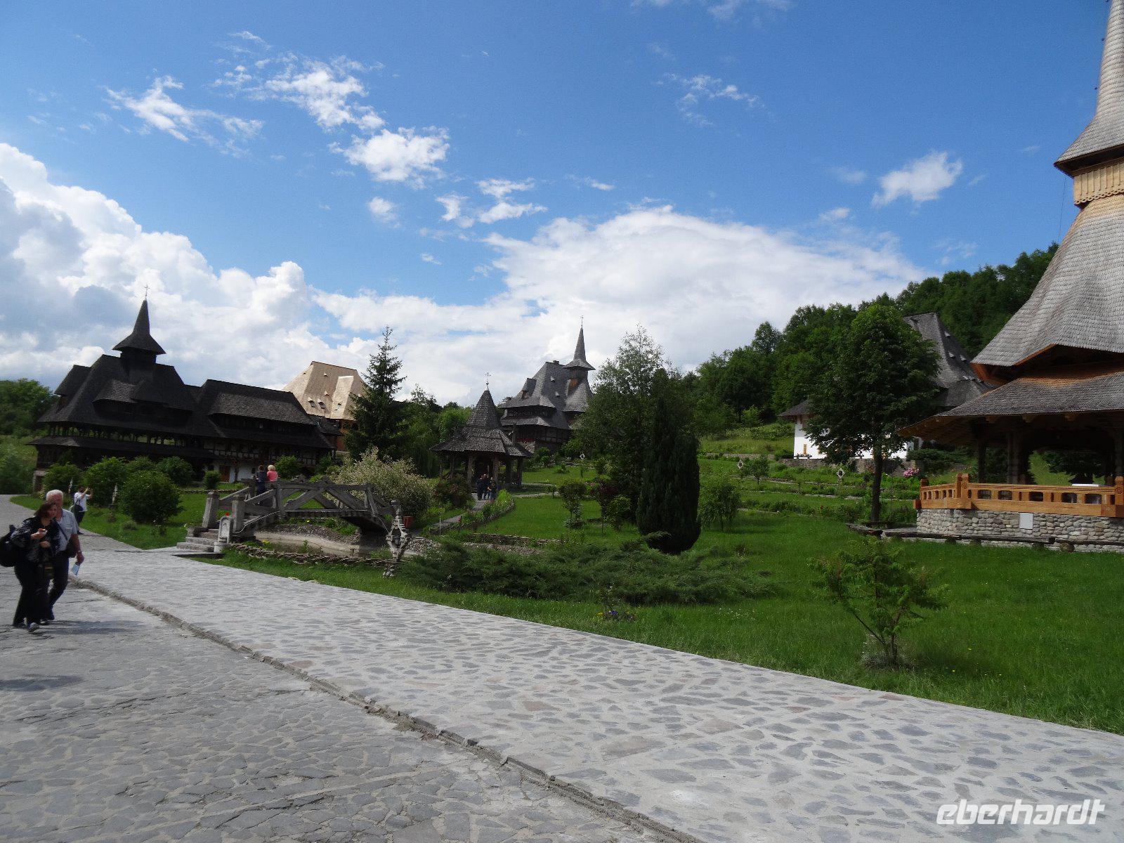 Pünktlich um 9:00 Uhr stehen wir auf dem Bahnhof in Viseu de Sus und besteigen unser Zugabteil. Ausgerüstet mit diversen Essensmarken geht die Fahrt los. Die Dampflokomotive gibt ihr Bestes und zieht uns schnaufend durch das Tal, immer am Fluss entlang. Auch heute noch werden neben Touristen auch Baumstämme zu Tal befördert, dies war ja der ursprüngliche Zweck der Waldbahn. Seit 1932 transportiert die Waldbahn das Holz nach Viseu de Sus. Wenngleich das Wetter ein wenig zum Nieselregen neigt, lassen wir uns die Laune nicht verderben, wir bewundern die schöne Landschaft, essen gut und trinken Tuica. Wohlbehalten und voller schöner Eindrücke sind wir gegen13:00 Uhr zurück in Viseu de Sus und fahren nun durch die Region Maramures nach Baia Mare. Dabei haben wir noch zwei schöne Haltepunkte: zum einen besuchen wir die Holzkirche in Rozavlea, 1760 erbaut und den Heiligen Erzengeln gewidmet. Innen ist sie reich bemalt mit Szenen aus der Bibel. Der zweite Höhepunkt ist das Kloster Barsana, eine alte Mönchsniederlassung, die jedoch nach der Säkularisierung aufgegeben wurde. 1993 wurden die Gebäude im Maramures-Stil aus Holz neu errichtet und geweiht und gegenwärtig leben hier 11 Nonnen und drei Schwestern. Das weitläufige Gelände bietet viel Raum für Kirchenfeste und Zusammenkünfte und im Museum kann man sich über die Geschichte der Region informieren. Wir genießen die Ruhe und Schönheit der Anlage und wären gern noch etwas geblieben, aber leider drängt die Zeit.