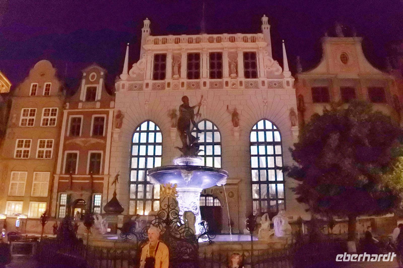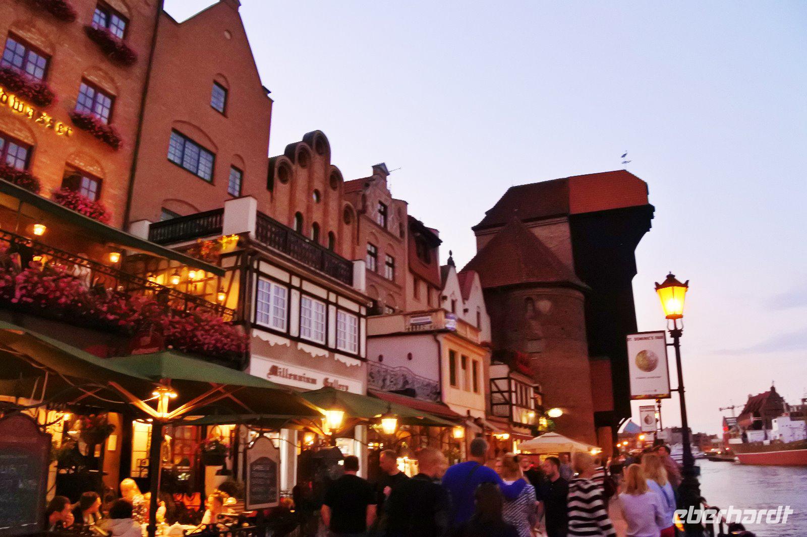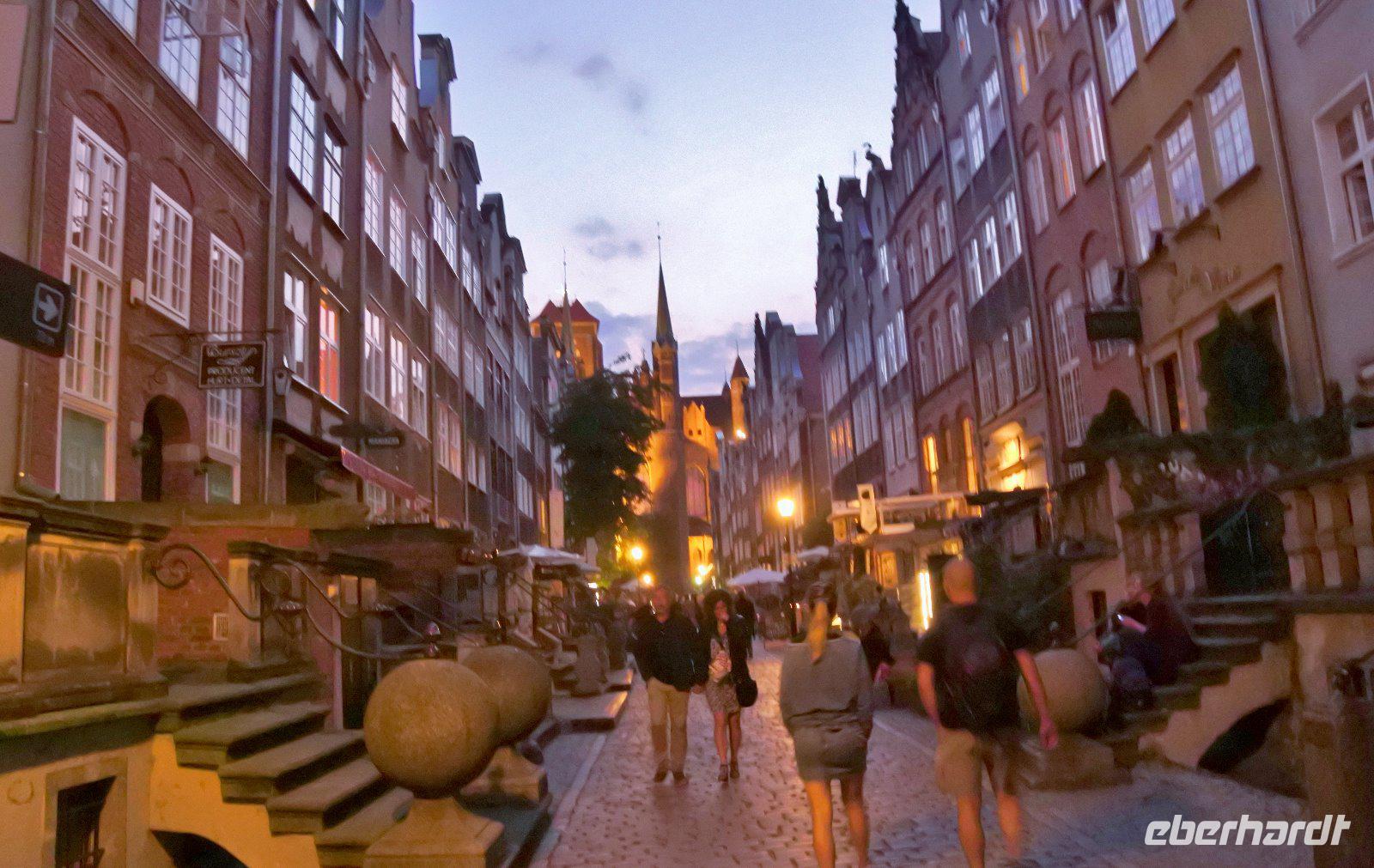 An Berlin und Stettin vorbei fuhren wir die Straße entlang der Ostseeküste entlang und legten unterwegs zwei Pausen an Raststätten bei Stettin und Stolpen ein. Bei den zweiten Pausen gab es als polnische Begrüßung einen echten polnischen Bison-Wodka. Gegen 18:15 Uhr kamen wir am Novotel am Rande der der Danziger Rechtstadt an und hatten um 19:00 Uhr ein gutes Abendessen-Buffet. Von 20:30 bis 22:00 Uhr ging unser Reiseleiter mit uns zunächst in eine Wechselstube wo wir Euros gegen polnische Zloty tauschten. Danach machte er mit uns einen Rundgang durch die gesamte Danziger Rechtsstadt. Dabei konnten wir alle Sehenswürdigkeiten bei romantischer Abendstimmung bewundern.