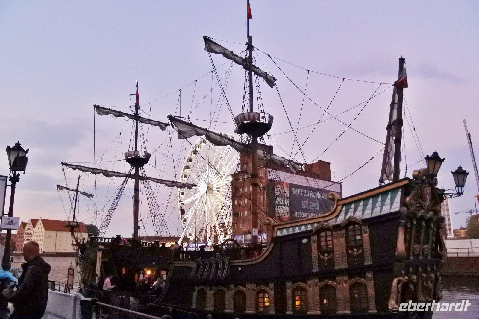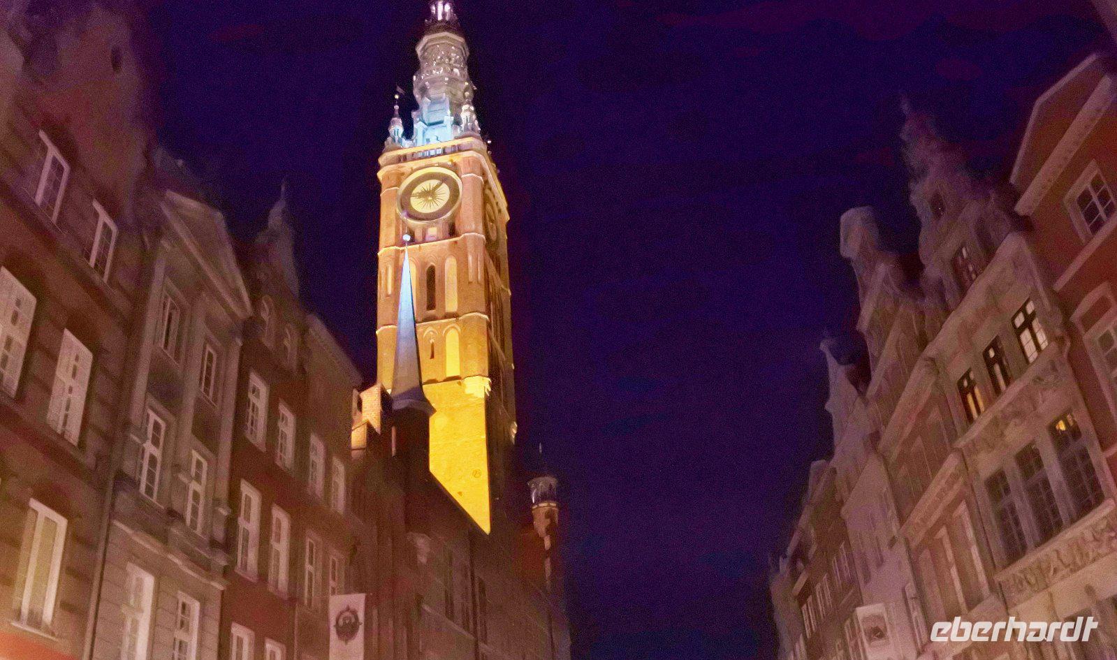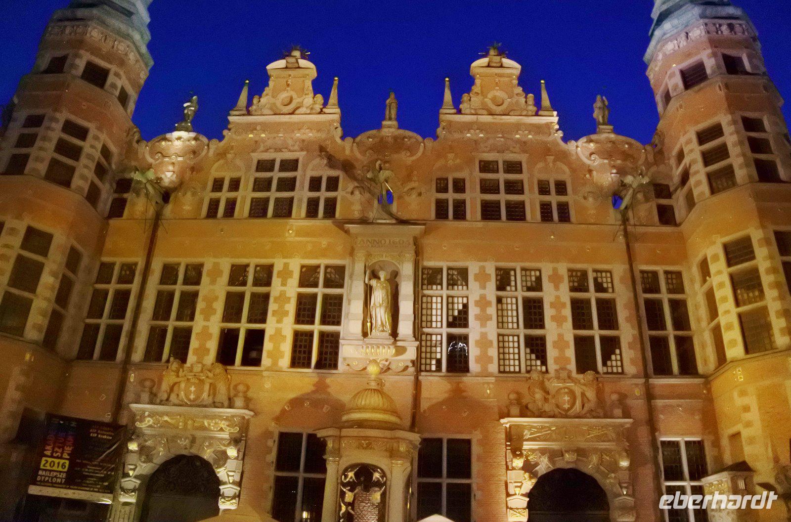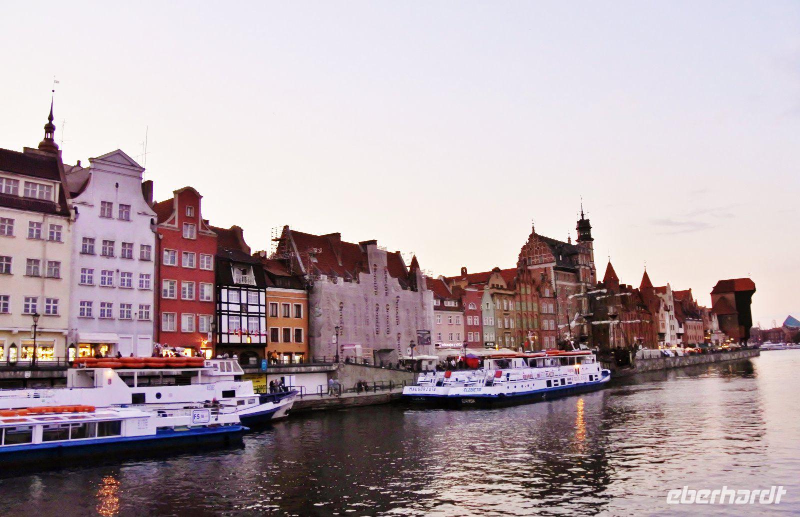 An Berlin und Stettin vorbei fuhren wir die Straße entlang der Ostseeküste entlang und legten unterwegs zwei Pausen an Raststätten bei Stettin und Stolpen ein. Bei den zweiten Pausen gab es als polnische Begrüßung einen echten polnischen Bison-Wodka. Gegen 18:15 Uhr kamen wir am Novotel am Rande der der Danziger Rechtstadt an und hatten um 19:00 Uhr ein gutes Abendessen-Buffet. Von 20:30 bis 22:00 Uhr ging unser Reiseleiter mit uns zunächst in eine Wechselstube wo wir Euros gegen polnische Zloty tauschten. Danach machte er mit uns einen Rundgang durch die gesamte Danziger Rechtsstadt. Dabei konnten wir alle Sehenswürdigkeiten bei romantischer Abendstimmung bewundern.