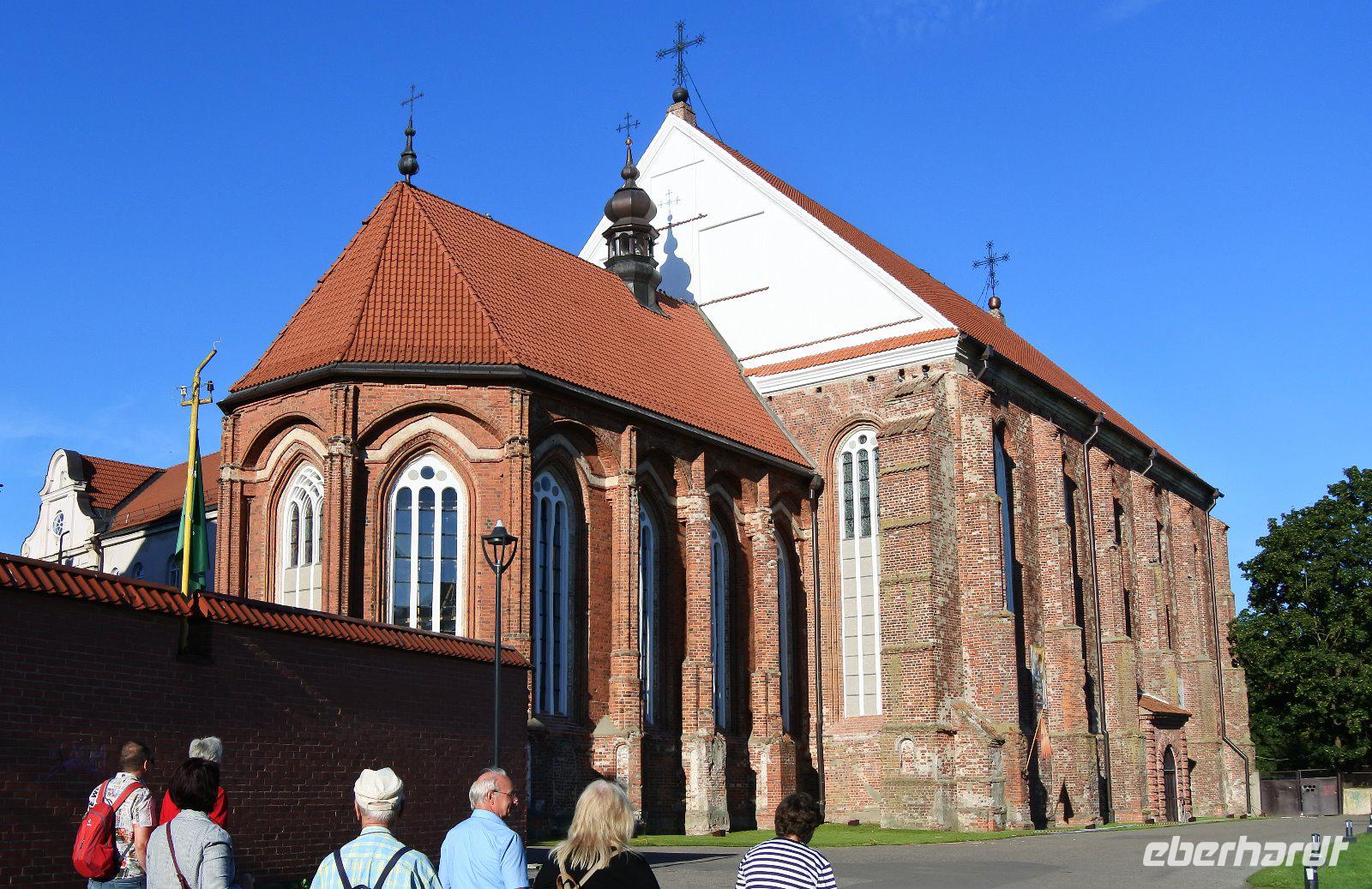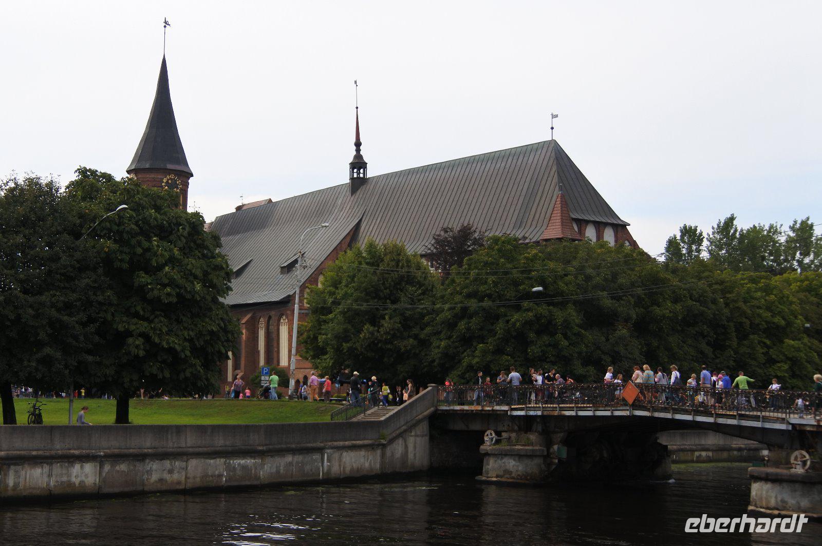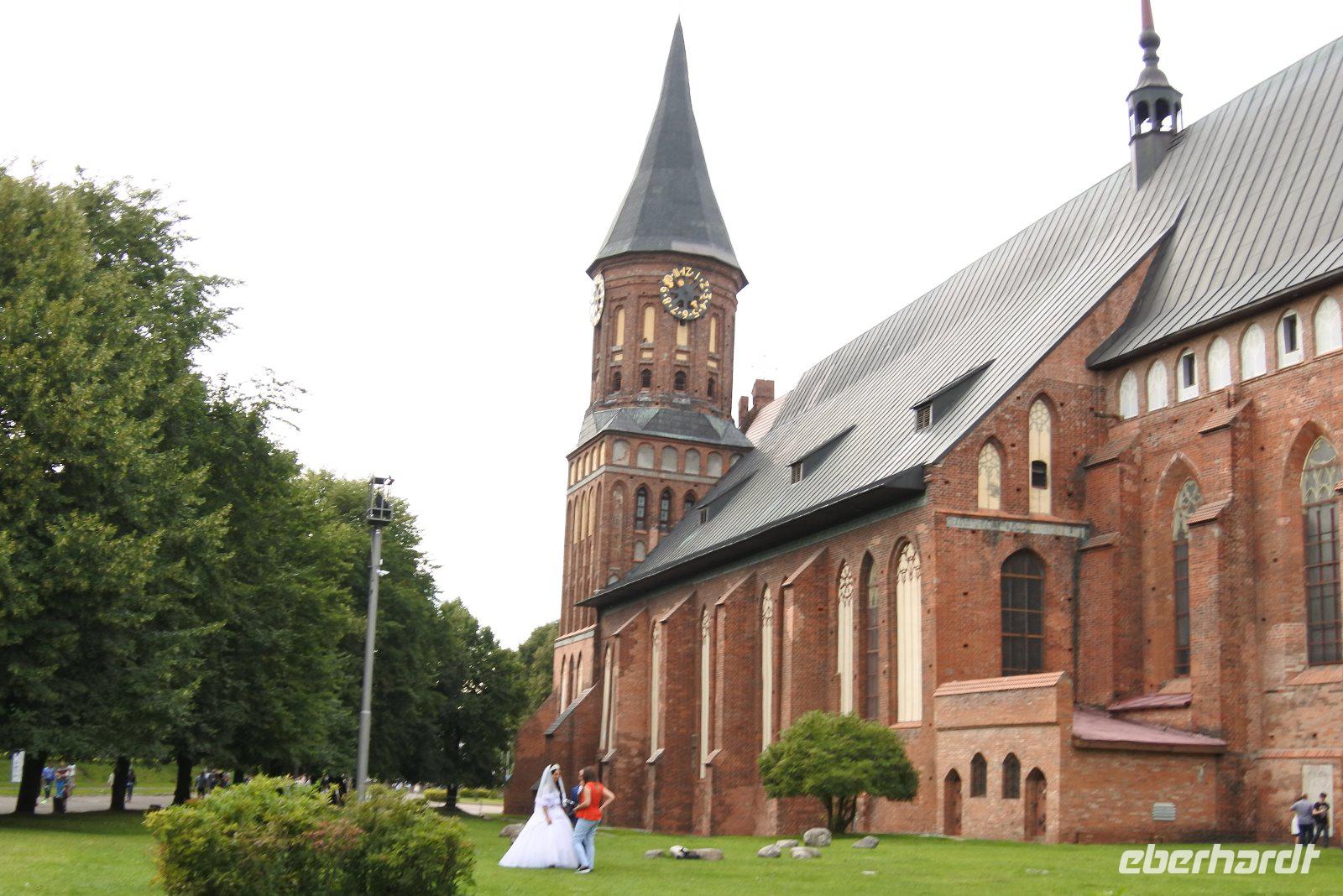 Um 07:00 Uhr gab es ein reichhaltiges und gutes Frühstück im Hotel und danach luden wir unsere Koffer in den Bus der neben dem Hotel stand. Um 08:00 Uhr fuhren wir mit dem Bus zum Hauptbahnhof wo der Bus parkte. Von dort unternahm unser Reiseleiter Gerd mit uns einen Bummel durch die Altstadt von Danzig mitseinen mittelalterlichen Kirchen und historischen Gebäuden. Danach fuhren wir mit dem Bus zum Solidarnosc Zentrum und zur Danziger Werft. Um 10:00 Uhr war dann Abfahrt zur polnisch/russischen Grenze bei Marmonowo. Gegen 11:10 Uhr kamen wir an der Grenze an und konnten nach den Grenzkontrollen um ca. 13:10 Uhr das Königsberger Gebiet befahren. Die örtliche Reiseleiterin Galina wartete an einer Tankstelle hinter der Grenze schon auf uns. Nach einer Kaffee Pause und betanken des Busses fuhren wir gegen 14:25 Uhr auf der ehemaligen Reichsstraße 1 Richtung Königsberg. Dort kamen wir um ca. 14:20 Uhr an und hatten zunächst ein Mittagessen in einem Restaurant in der Innenstadt bis 15:15 Uhr. Danach haben wir Euros gegen Rubel, in einer nahen gelegenen Wechselstube getauscht. Von 15:15 - 16:45 Uhr machten wir eine Stadtführung mit Galina durch die Innenstadt von Königsberg. Bei Aufenthalt auf dem Freiheitsplatz haben wir auch den großen orthodoxen weißen Dom mit seinen goldenen Kuppeln von innen besichtigt. Dann fuhren wir zur Dom Insel wo wir den Dom von innen und außen besichtigt und das Grab von Emanuele Kant besucht haben.