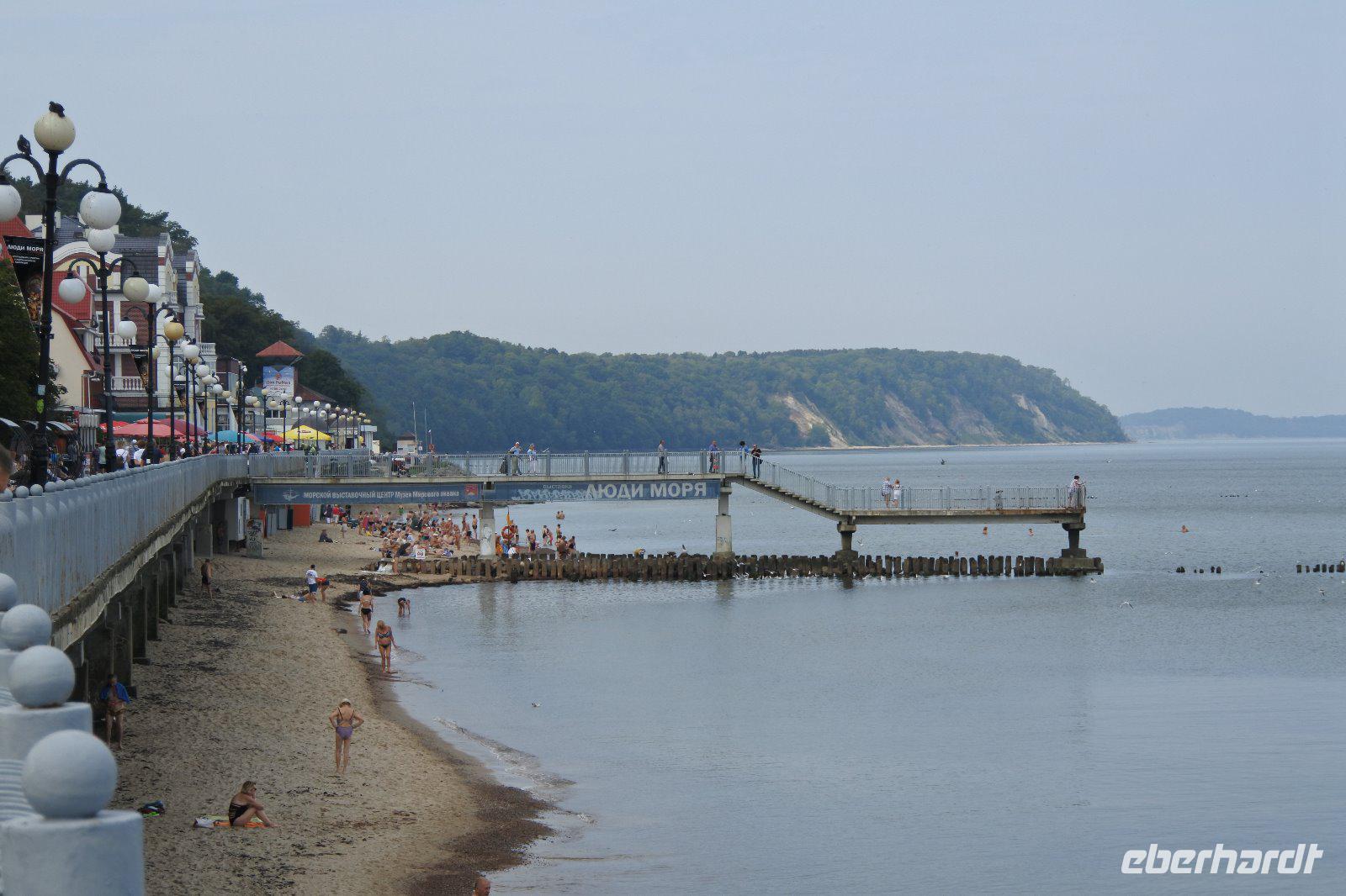 Um 08:00 Uhr gab es ein russisches Frühstücksbuffet. Von 10:00 - 12:30 Uhr machten wir eine Stadtführung mit Galina durch Rauschen. Vom Hotel aus ging es einen sehr schönen Waldweg entlang zu einem Villenviertel mit schön sanierten alten Häusern und einigen Kunstobjekten. Danach gingen wir zurück zur Hauptstraße, entlang der Einkaufsstraße zum Wasserturm und danach zur Uferpromenade. Entlang der Promenade machten wir einen Spaziergang zum Restaurant Seestern, wo um 12:30 Uhr ein Königsberger Klopse Essen hatten. Um 14:00 Uhr trafen wir uns alle wieder vor dem Restaurant und fuhren auf Einladung von Eberhardt TRAVEL mit der Seilbahn am Ende der Uferpromenade hoch zur Hauptstraße.Von 14:30 - 19:00 Uhr hatten Zeit zur freien Verfügung um am Strand bei schönem Wetter zu relaxen oder einen Spaziergang durch den bekannten russischen Ferienort zu machen. Um 19:00 Uhr gab es wieder Abendessen im Hotel