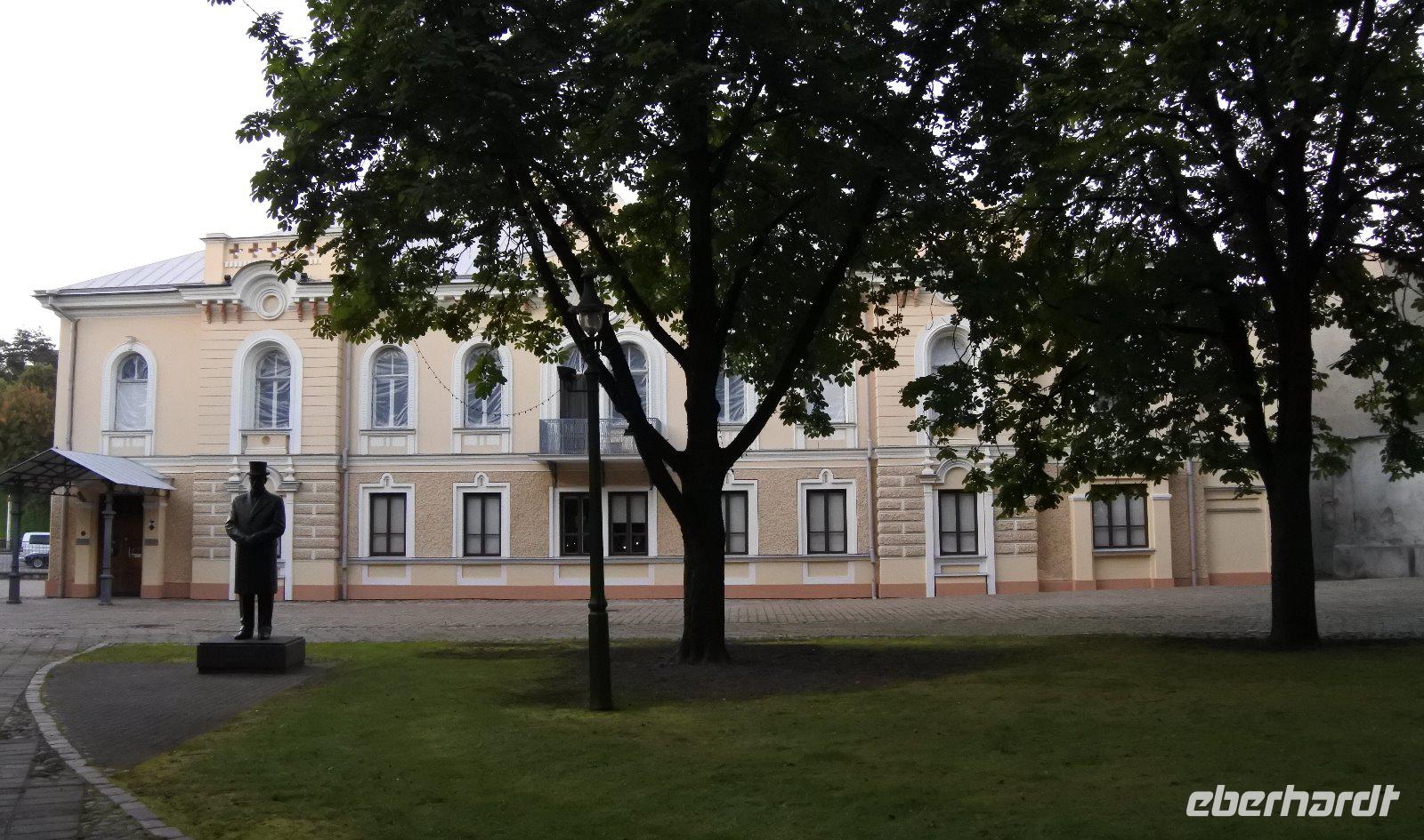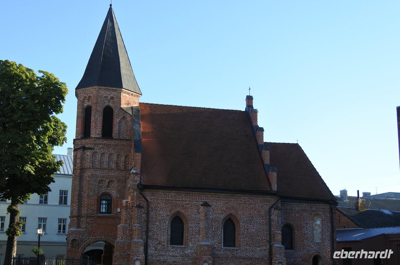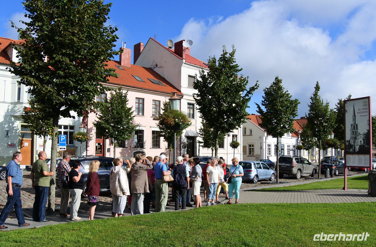 Nach dem Frühstück und dem Kofferladen fuhren wir durch den litauischen Teil der Kurischen Nehrung nach Klaipeda. Von einem Busparkplatz in der Nähe eines Museum-Segelschiffes aus, machten wir von 09:15 bis 10:00 Uhr eine Stadtrundgang mit Anita durch Klaipeda. Am Theaterplatz sangen wir vor vielen anderen Besuchern das Lied „Ännchen von Tharau" vor der Skulptur auf dem Theaterplatz. Danach fuhren wir gegen 11:15 Uhr nach Vente (Windenburger Eck) wo wir von 12:00 bis 12:50 Uhr einen schönen Aufenthalt an der Vogelwarte und dem alten Leuchtturm hatten. Von Vende ging die Fahrt nach Silute (Heydekrug). Von 14:15 - 15:30 Uhr hatten wir zunächst ein Mittagsessen im Hotel DEIMS. Danach besuchten wir von 15:45 - 16:15 Uhr die evangelische Kirche mit ihren eindrucksvollen, großen Wandgemälden. (Moderne Fresken) Diese wurden durch eine fachkundige Mitarbeiterin ausgiebig erklärt. Von Silute ging es gegen 16:15 Uhr über die Autobahn Richtung Kaunas. Nach einer 17:00 - 17:15 WC an einer Raststätte an der Autobahn 80 Km vor Kaunas kamen wir gegen 18:30 Uhr am Best Western Hotel in Kaunas an. Wegen einer großen internationalen Konferenz wurden die Zimmer in dem ursprünglich vorgesehen Park Inn Hotel von der Stadtverwaltung blockiert. Das Best Western Hotel ist ein landestypisch eingerichtetes Hotel mit einer eher rustikalen Atmosphäre. Für den kurzfristig durch die örtliche Agentur vorgenommen Hoteltausch, gab es als „Entschädigung" ein Freigetränk zum Abendessen und eine große Flasche Wodka für jeden Gast. Nach dem Abendessen um 19:30 Uhr machte die Reiseleiterin Anita mit uns einen Abend-Spaziergangdurch die Freiheit Allee einer Prachtstraße in Kaunas.