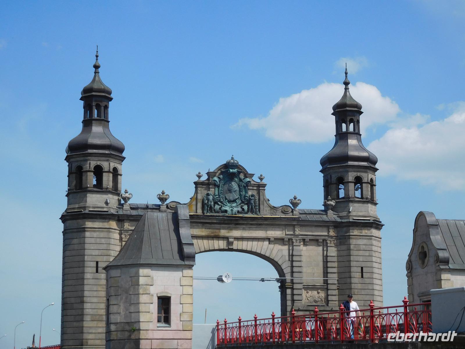 Zuerst ging es heute nach Labiau, einer alten Deutschordensgründung. Die Ordensburg ist eigentlich in ihrer Bausubstanz weitgehend erhalten und sowohl von außen, als auch im Hof begehbar, aber man sieht ihr die jahrzehntelange wirtschaftliche Nutzung in der Sowjetzeit an. Dabei wäre die Lage am Wasser nur idyllisch zu nennen, aber im Ort ist ansonsten nichts weiter. Ein paar Läden, ein Lenindenkmal und ein fliegender Händler mit einem Faß Kwas. Also weiter nach Tilsit, heute Grenzstadt zu Litauen. Unser Ausstieg war die nach Preußens Königin benannte Luisenbrücke und das Konterfei der Gattin Friedrich Wilhelm III. schmückt heute wieder den Brückenkopf. Man darf sogar fotografieren, nur auf die Brücke gelangen nur Grenzgänger mit Sonderprikas. Es ist wenig Verkehr und irgendwie fühlt man sich wie am Ende der Welt. Dabei gibt es auch auf russischer Seite litauisches Telefonnetz und damit EU-Tarif, was mancher nutzte, um schnell mal zu Haus anzurufen. Die Freizeit nutzten viele in der Fußgängerzone, wo man wirklich ganz nett bummeln kann. Dann ging es weiter nach Ragnit, wo die riesige Ruine der einst mächtigen Ordensburg leider nur von außen begehbar ist. Weil ein Ehepaar hier nach dem Haus ihrer Vorfahren suchen wollte, haben wir hier gleich die Mittagspause eingelegt. Die Leute fanden das Haus und alles lief bestens. Noch vor dem Abendessen gab es etwas Freizeit in Königsberg.