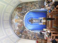 Nach dem Frühstück machten uns auf den Weg in die polnischen Masuren. An der inneren EU-Grenze gab es keinerlei Aufenthalte und so konnten wir im bekanntesten Urlaubsort Nikolaiken am Spiedingsee, dem größten Polens, eine längere Mittagspause einlegen. Einige besuchten die evangelische Kirche, deren Pläne von Schinkel sind- gebaut wurde sie erst ein Jahr nach seinem Tode. Anschließend war noch Zeit für einen Abstecher nach Sorquitten. Der Reiseleiter organisierte den Schlüssel für die gotische und reich ausgestattete Kirche und bot eine kleine Kirchführung. Eine hübsche Besonderheit ist die Figur Christi´ Himmelfahrt, bei der nur die Beine des Heilands plastisch aus einer auf die Kirchendecke gemalten Wolke ragen. Angekommen in Sensburg konnten wir sofort unsere Zimmer im Hotel am See beziehen. Dann erwartete uns auf einer Terrasse mit tollem Seeblick ein zünftiger Grillabend, in dessen Anschluß man noch länger beieinander saß. Der Reiseleiter hatte als Überraschung einen Akkordeonspieler bestellt, der deutsche und polnische Lieder und Evergreens zum Besten gab und damit für Stimmung sorgte.