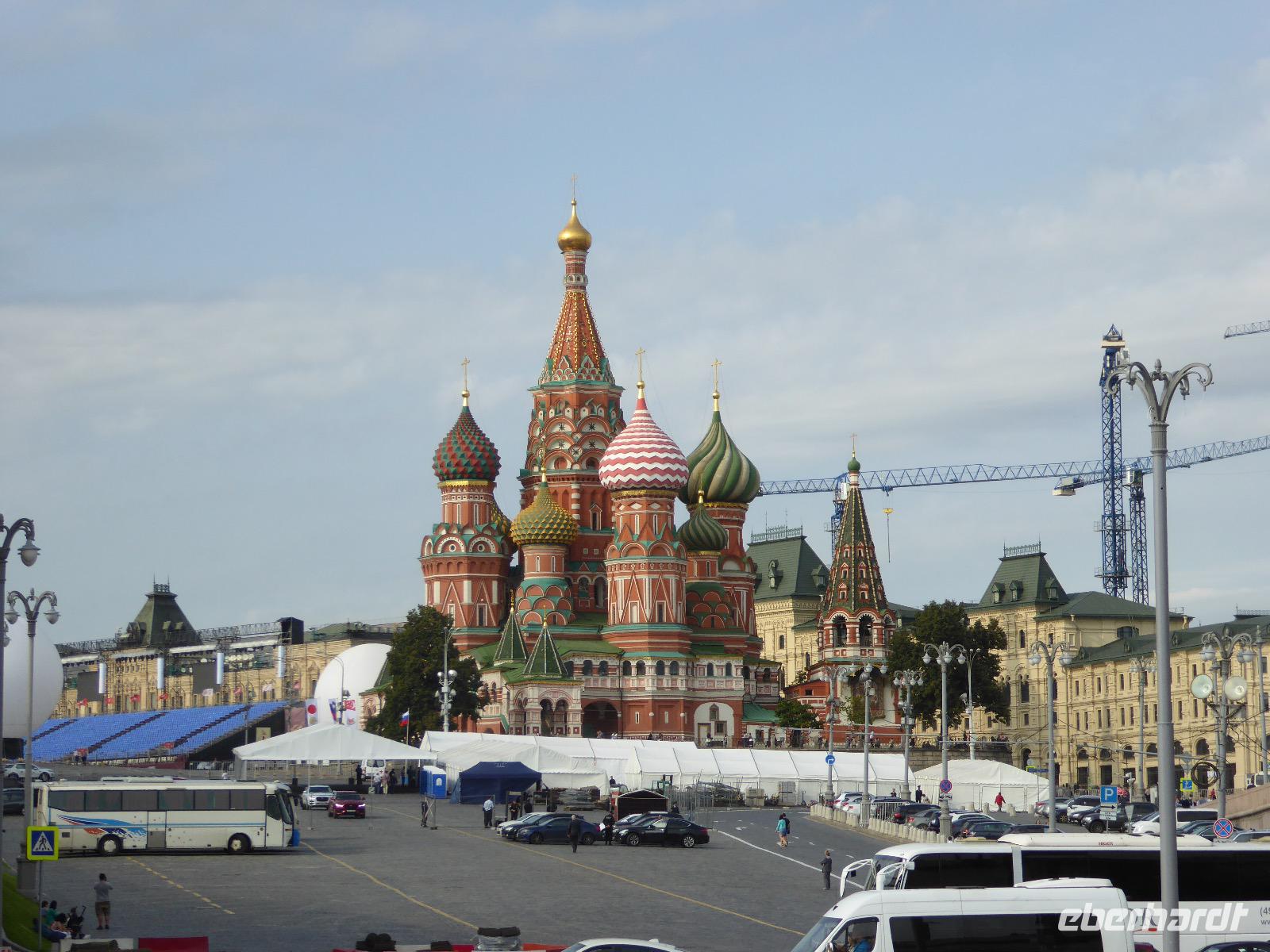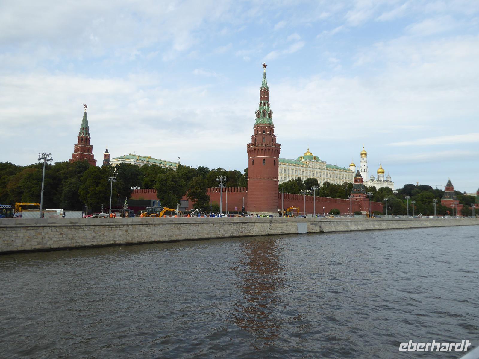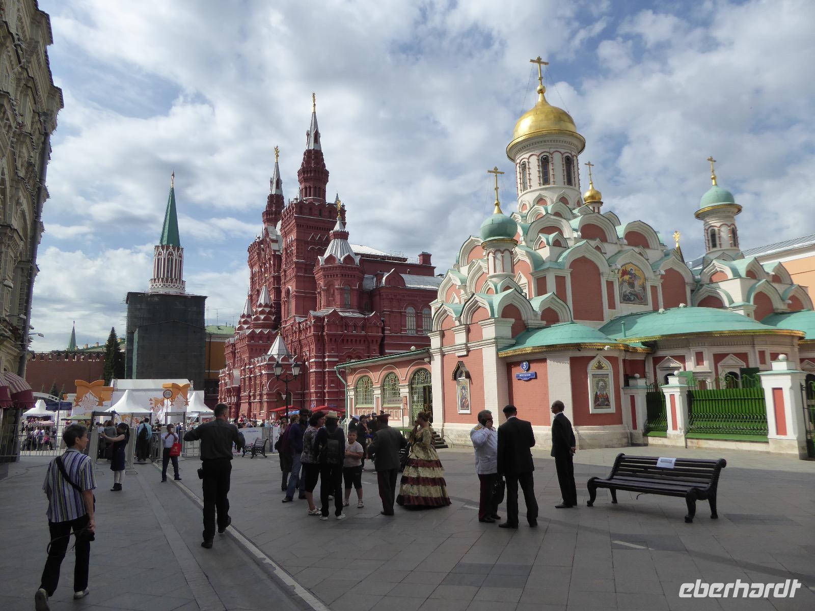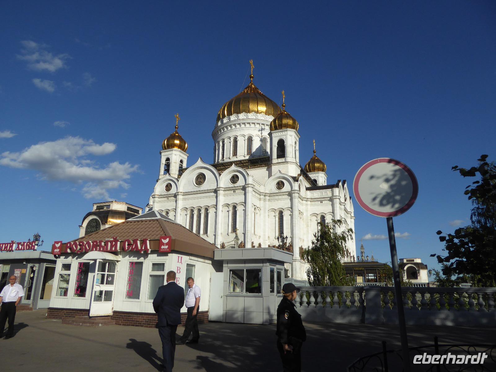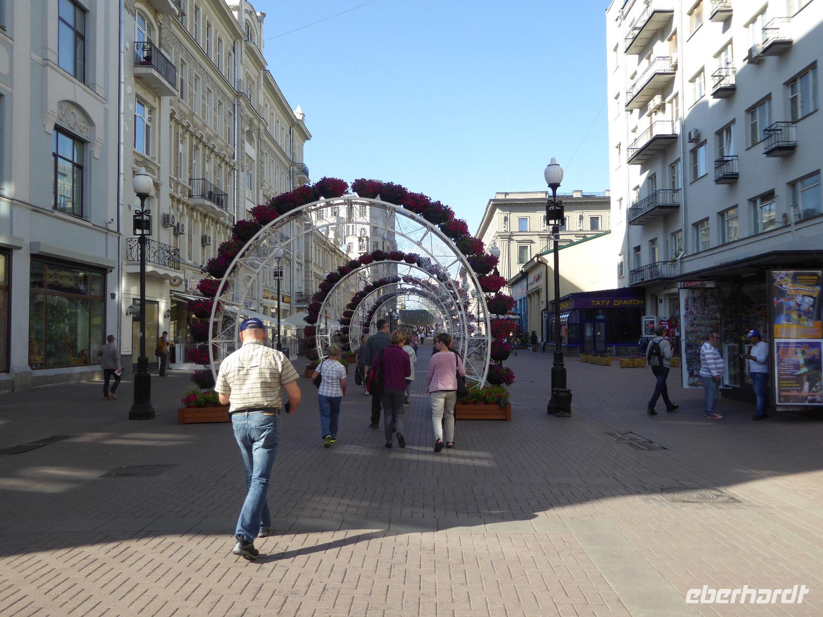 Der Tag beginnt mit einem gemütlichen Frühstück, gefolgt von einem Spaziergang zum Neuen Arbat. Wir erobern Moskau zu Fuß. Vorbei an hohen Wohnhäusern zwischen denen sich eine kleine Kirche mit grünen Zwiebelchen duckt, geht es bei schönstem Sonnenschein durch die Stadt. Hier eine bemalte Wand, dort ein blumengeschmückter Bogen, ein Souvenirgeschäft am anderen lockt uns, aber Valentina treibt uns an. Sie hat viel vor mit uns. Nun geht es in den Untergrund. Valentina hat die Fahrkarten gekauft und schleust uns durch die Schranke. Mit der Rolltreppe geht es steil Berg ab. Valentina ruft uns laut zu, wieviele Stationen wir fahren und wann wir wieder aussteigen müssen. Ein U-Bahnhof ist schöner als der andere. Ein Traum für jedes Fotografenherz. Irgendwann fahren wir wieder mit der Rolltreppe steil bergauf und sind in der Nähe vom Roten Platz. Wir spazieren durch das GUM, das allseits bekannte Kaufhaus Moskaus. Selbst die Toilette lädt zum Fotografieren ein. Der Rote Platz ist gesperrt. Es findet derzeit ein Musikfestival statt und große Tribühnen sind aufgebaut. So können wir Kreml und Basiliuskathedrale nur von Weitem bewundern. Valentina scheucht uns durch das Auferstehungstor Richtung Wachablösung, die wir auch pünktlich erreichen. Weiter geht es zum Pferdespringbrunnen am Alexandergarten und zum Mittagessen in einem ukrainischen Restaurant. Das Essen schmeckt hervorragend, wenn auch der schmucke Kellner nicht bereit ist, sich für unsere Fotoalben ablichten zu lassen. Am Nachmittag bewundern wir die Stadt noch einmal von der Wasserseite aus. Eine Schifffahrt auf der Moskwa rundet den Tag ab. Noch einmal wird der Tisch für uns reichlich gedeckt und dann fahren wir mit der Bahn zum Flughafen. So vermeiden wir es, in den Feierabendstau zu geraten und gemütlich ist es auch. Am Flughafen verabschieden wir uns von Valentina. Über Nacht fliegen wir nach Irkutsk. Baikalsee - wir kommen.