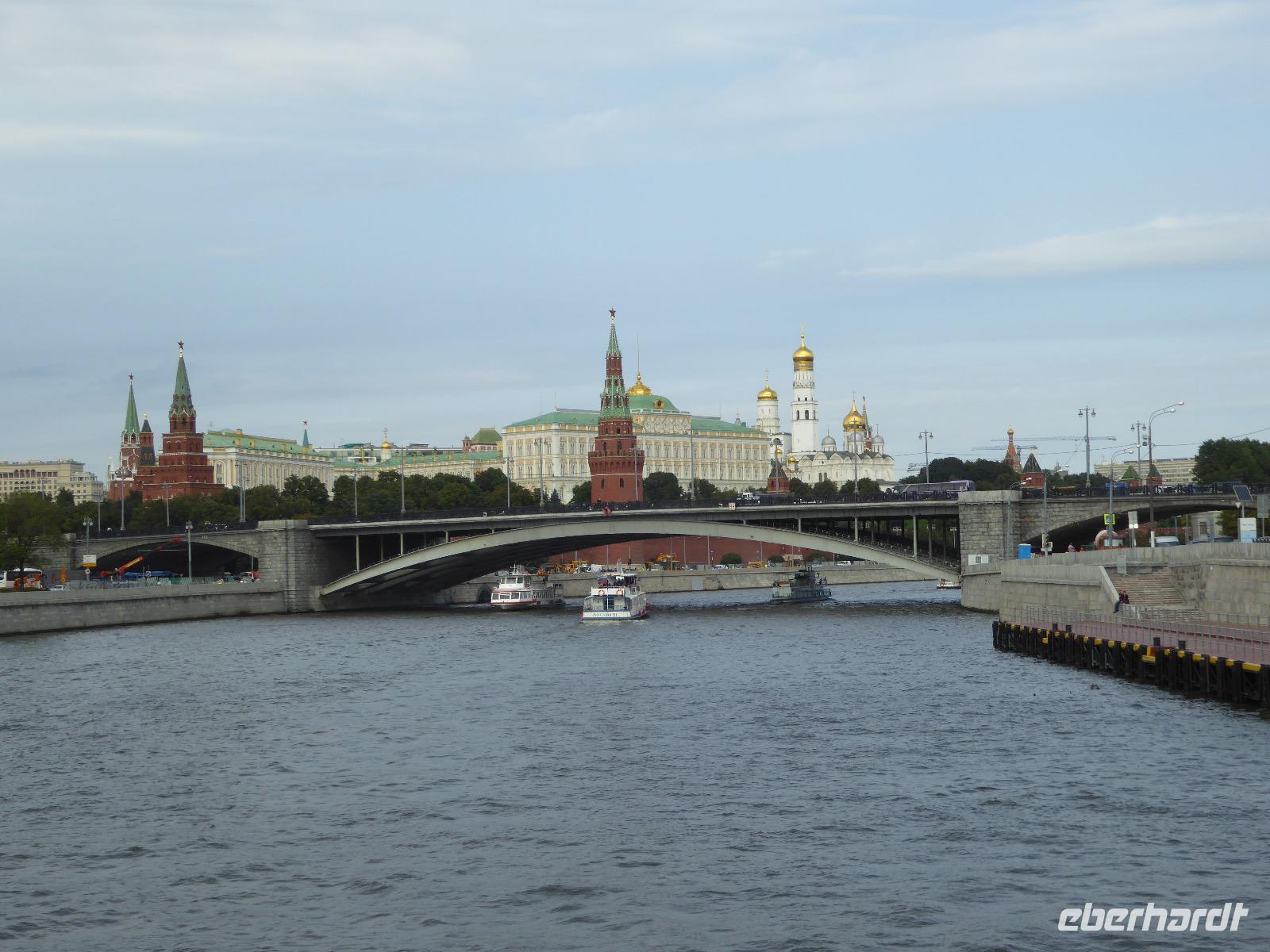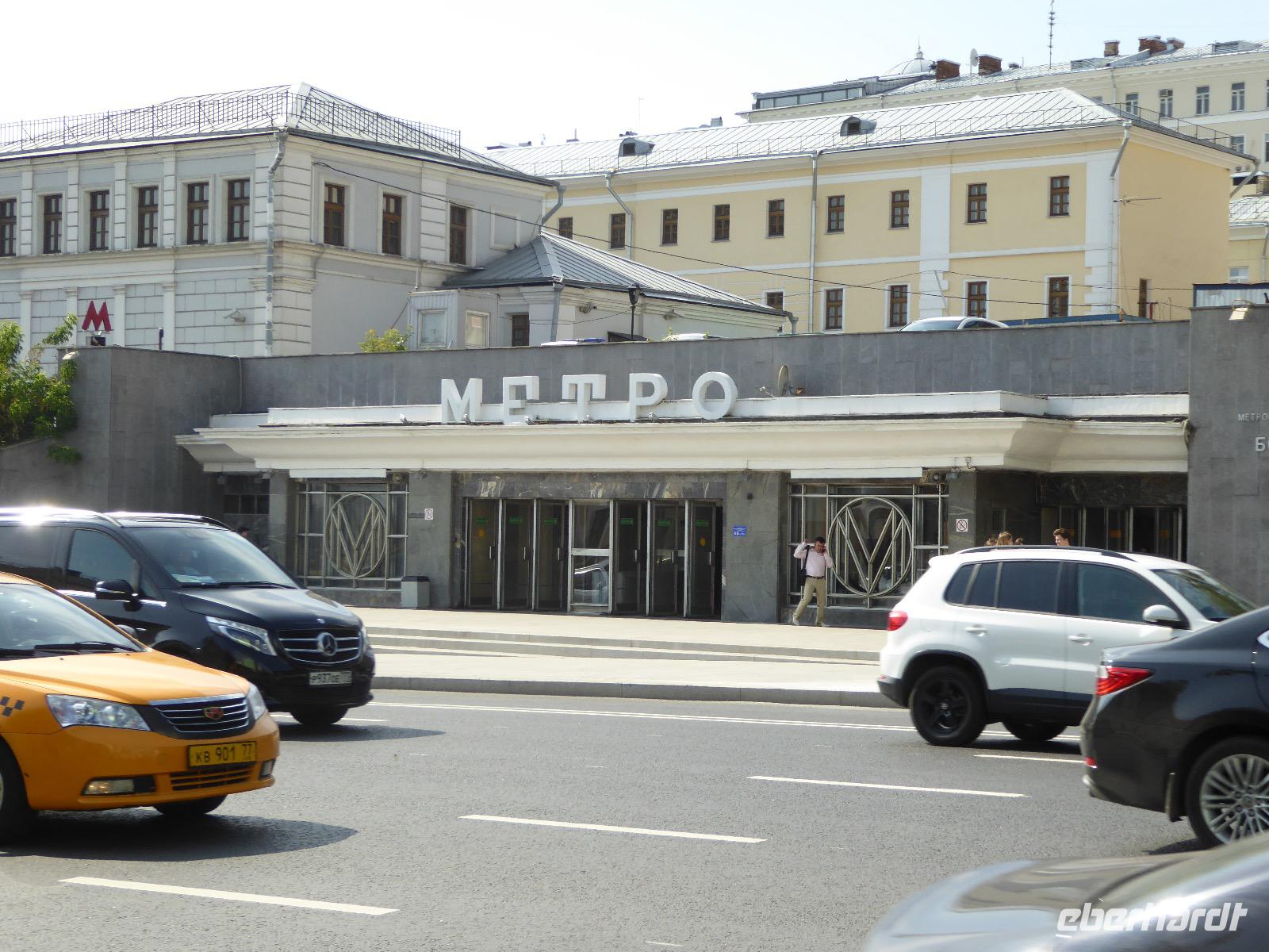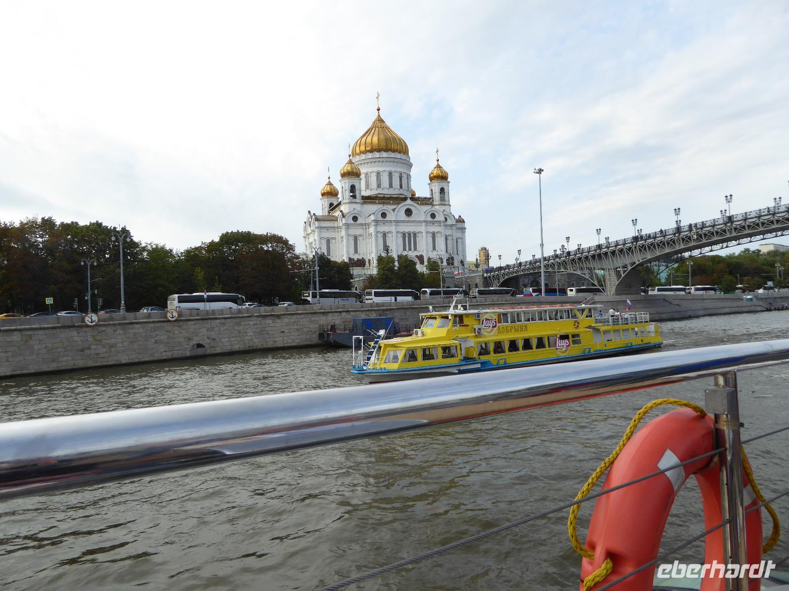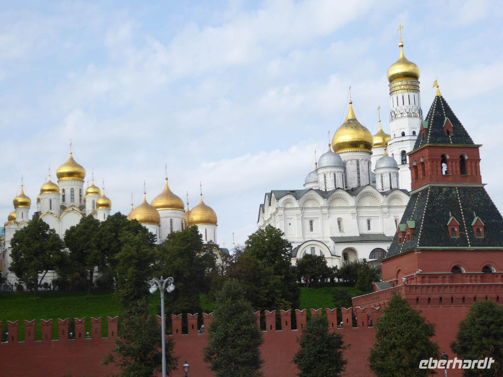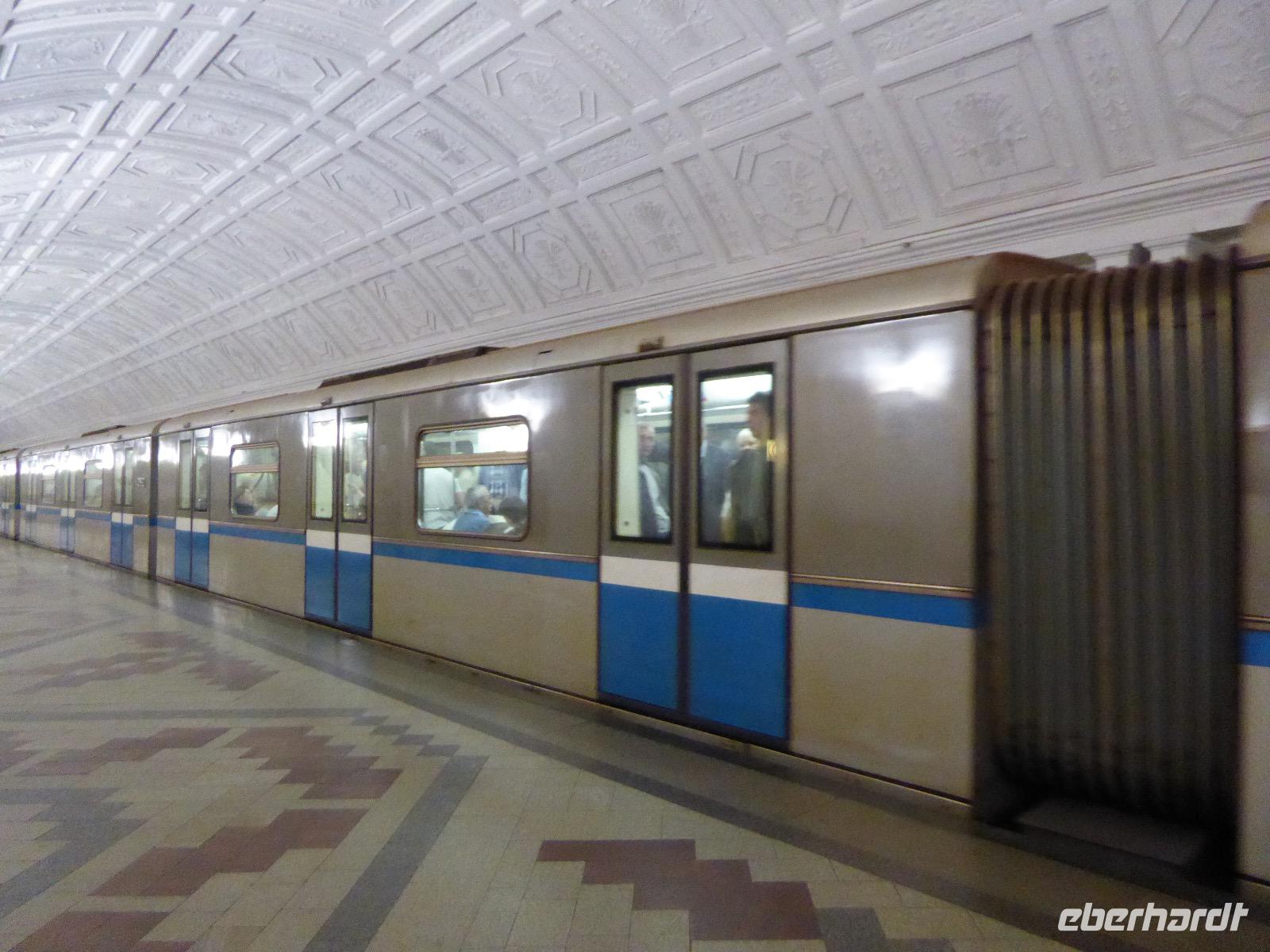 Der Tag beginnt mit einem gemütlichen Frühstück, gefolgt von einem Spaziergang zum Neuen Arbat. Wir erobern Moskau zu Fuß. Vorbei an hohen Wohnhäusern zwischen denen sich eine kleine Kirche mit grünen Zwiebelchen duckt, geht es bei schönstem Sonnenschein durch die Stadt. Hier eine bemalte Wand, dort ein blumengeschmückter Bogen, ein Souvenirgeschäft am anderen lockt uns, aber Valentina treibt uns an. Sie hat viel vor mit uns. Nun geht es in den Untergrund. Valentina hat die Fahrkarten gekauft und schleust uns durch die Schranke. Mit der Rolltreppe geht es steil Berg ab. Valentina ruft uns laut zu, wieviele Stationen wir fahren und wann wir wieder aussteigen müssen. Ein U-Bahnhof ist schöner als der andere. Ein Traum für jedes Fotografenherz. Irgendwann fahren wir wieder mit der Rolltreppe steil bergauf und sind in der Nähe vom Roten Platz. Wir spazieren durch das GUM, das allseits bekannte Kaufhaus Moskaus. Selbst die Toilette lädt zum Fotografieren ein. Der Rote Platz ist gesperrt. Es findet derzeit ein Musikfestival statt und große Tribühnen sind aufgebaut. So können wir Kreml und Basiliuskathedrale nur von Weitem bewundern. Valentina scheucht uns durch das Auferstehungstor Richtung Wachablösung, die wir auch pünktlich erreichen. Weiter geht es zum Pferdespringbrunnen am Alexandergarten und zum Mittagessen in einem ukrainischen Restaurant. Das Essen schmeckt hervorragend, wenn auch der schmucke Kellner nicht bereit ist, sich für unsere Fotoalben ablichten zu lassen. Am Nachmittag bewundern wir die Stadt noch einmal von der Wasserseite aus. Eine Schifffahrt auf der Moskwa rundet den Tag ab. Noch einmal wird der Tisch für uns reichlich gedeckt und dann fahren wir mit der Bahn zum Flughafen. So vermeiden wir es, in den Feierabendstau zu geraten und gemütlich ist es auch. Am Flughafen verabschieden wir uns von Valentina. Über Nacht fliegen wir nach Irkutsk. Baikalsee - wir kommen.