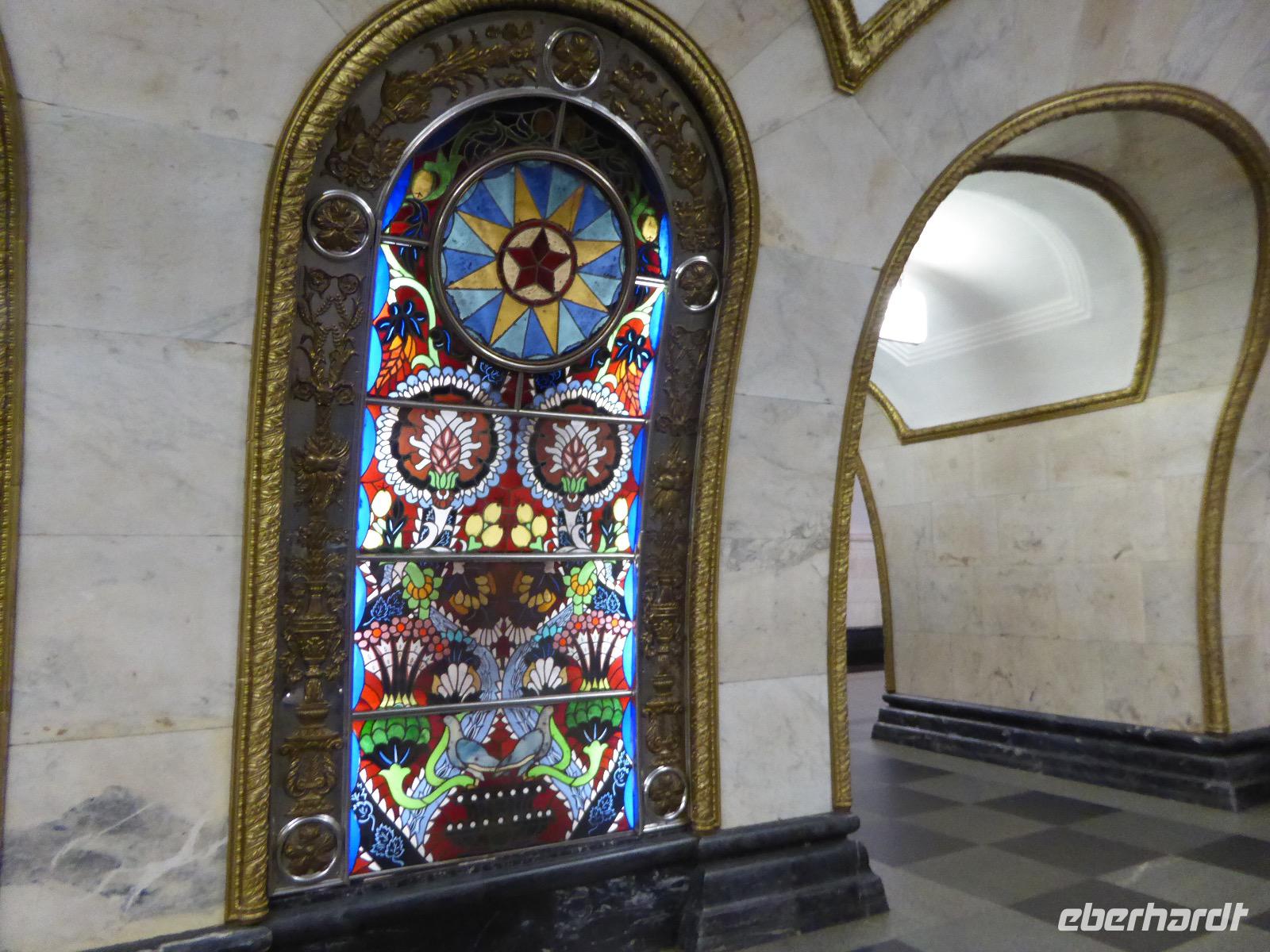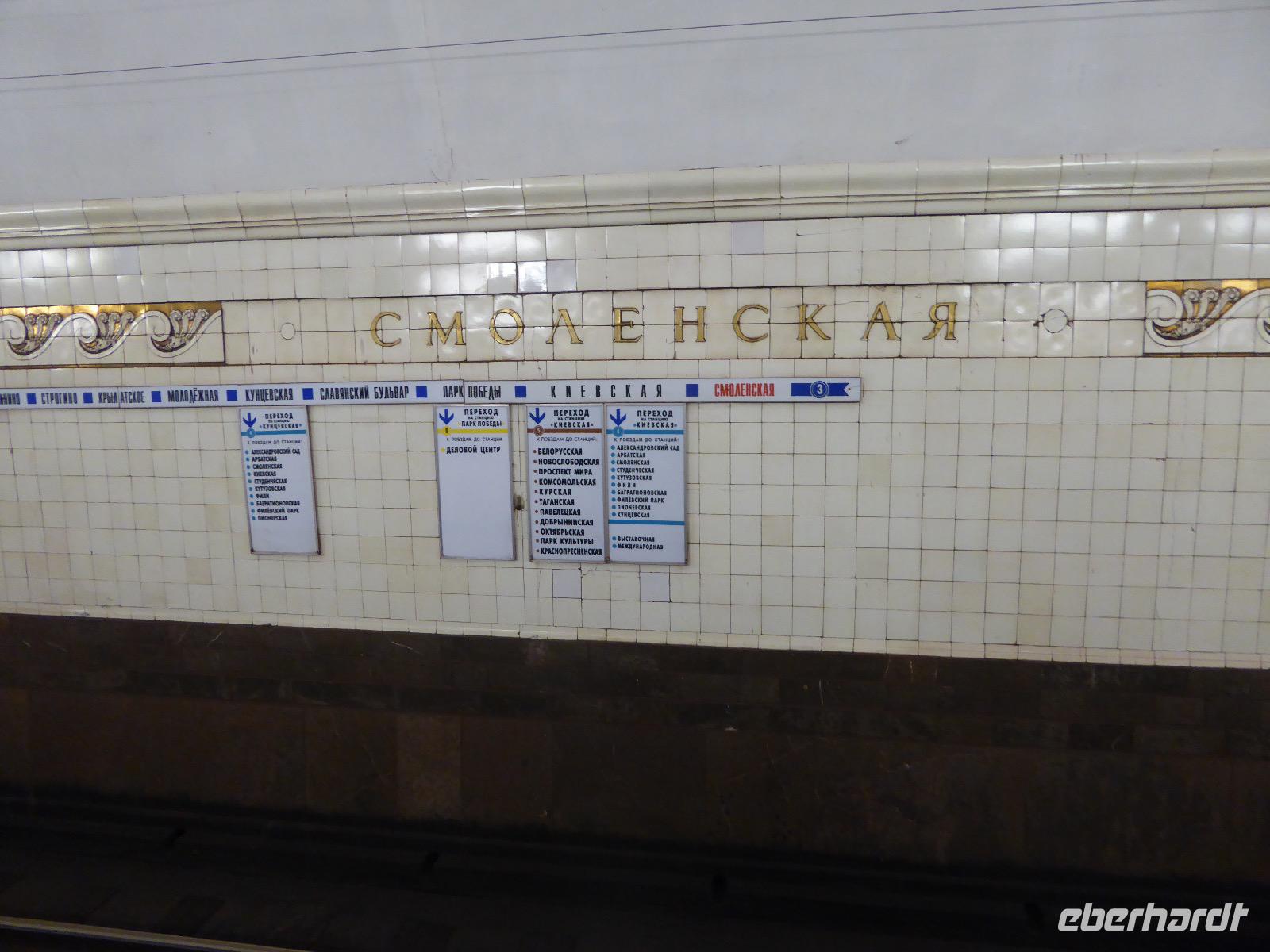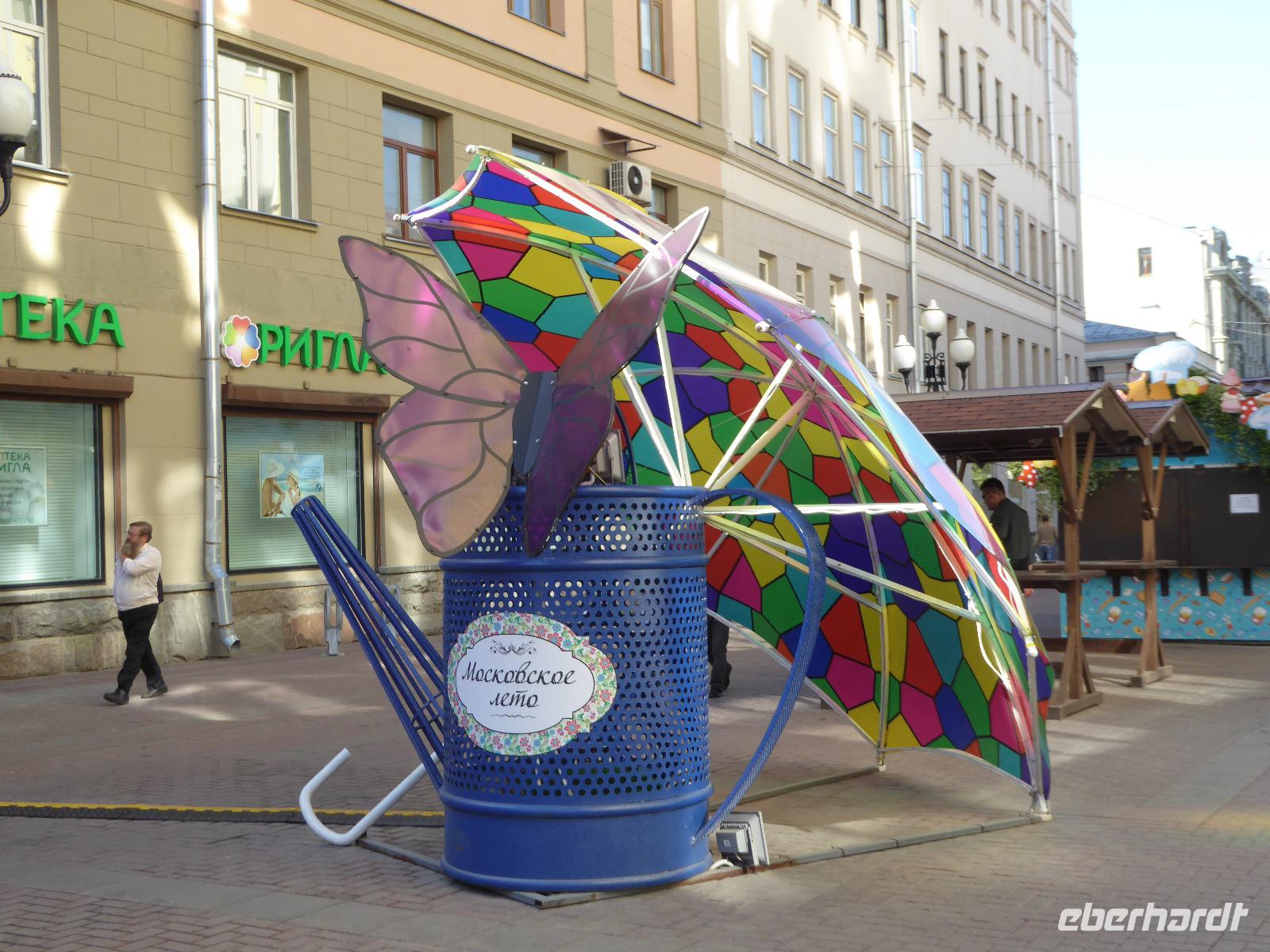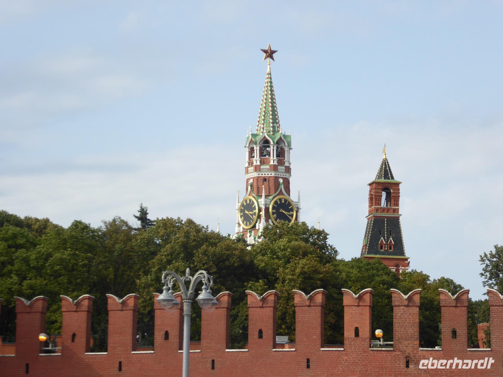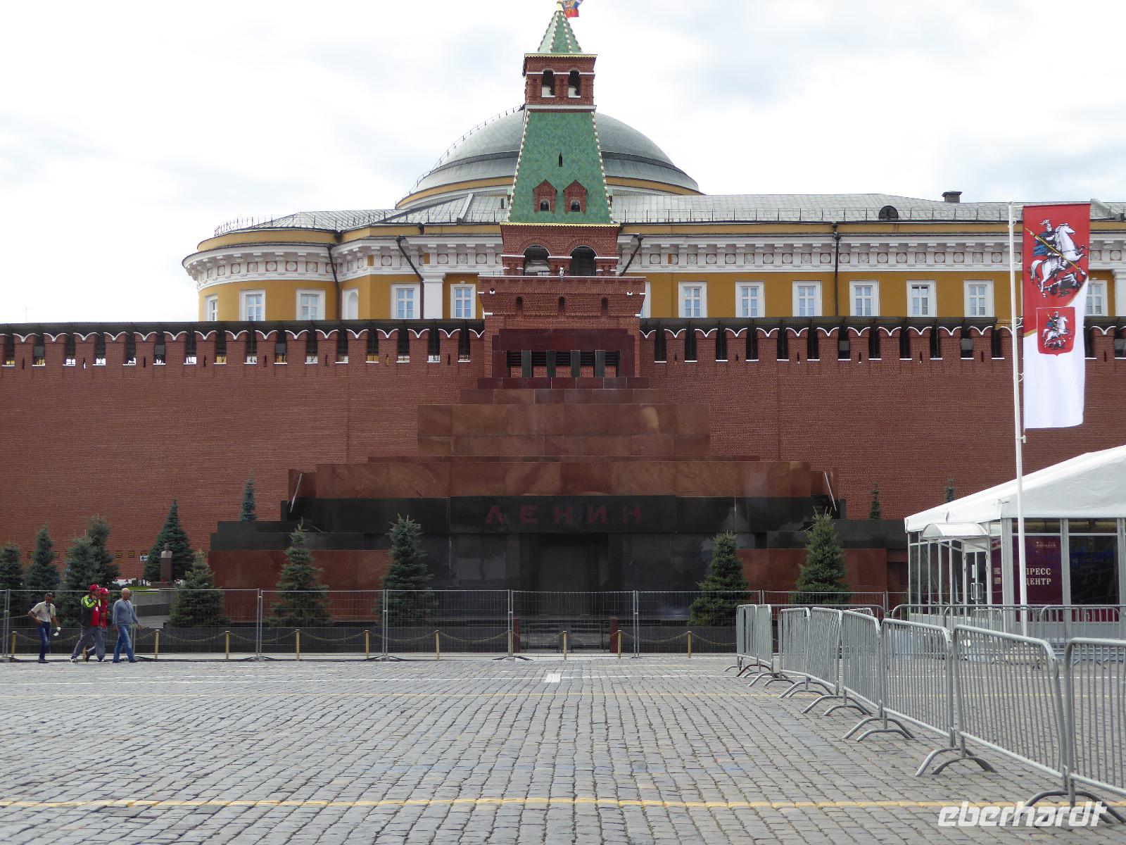 Der Tag beginnt mit einem gemütlichen Frühstück, gefolgt von einem Spaziergang zum Neuen Arbat. Wir erobern Moskau zu Fuß. Vorbei an hohen Wohnhäusern zwischen denen sich eine kleine Kirche mit grünen Zwiebelchen duckt, geht es bei schönstem Sonnenschein durch die Stadt. Hier eine bemalte Wand, dort ein blumengeschmückter Bogen, ein Souvenirgeschäft am anderen lockt uns, aber Valentina treibt uns an. Sie hat viel vor mit uns. Nun geht es in den Untergrund. Valentina hat die Fahrkarten gekauft und schleust uns durch die Schranke. Mit der Rolltreppe geht es steil Berg ab. Valentina ruft uns laut zu, wieviele Stationen wir fahren und wann wir wieder aussteigen müssen. Ein U-Bahnhof ist schöner als der andere. Ein Traum für jedes Fotografenherz. Irgendwann fahren wir wieder mit der Rolltreppe steil bergauf und sind in der Nähe vom Roten Platz. Wir spazieren durch das GUM, das allseits bekannte Kaufhaus Moskaus. Selbst die Toilette lädt zum Fotografieren ein. Der Rote Platz ist gesperrt. Es findet derzeit ein Musikfestival statt und große Tribühnen sind aufgebaut. So können wir Kreml und Basiliuskathedrale nur von Weitem bewundern. Valentina scheucht uns durch das Auferstehungstor Richtung Wachablösung, die wir auch pünktlich erreichen. Weiter geht es zum Pferdespringbrunnen am Alexandergarten und zum Mittagessen in einem ukrainischen Restaurant. Das Essen schmeckt hervorragend, wenn auch der schmucke Kellner nicht bereit ist, sich für unsere Fotoalben ablichten zu lassen. Am Nachmittag bewundern wir die Stadt noch einmal von der Wasserseite aus. Eine Schifffahrt auf der Moskwa rundet den Tag ab. Noch einmal wird der Tisch für uns reichlich gedeckt und dann fahren wir mit der Bahn zum Flughafen. So vermeiden wir es, in den Feierabendstau zu geraten und gemütlich ist es auch. Am Flughafen verabschieden wir uns von Valentina. Über Nacht fliegen wir nach Irkutsk. Baikalsee - wir kommen.