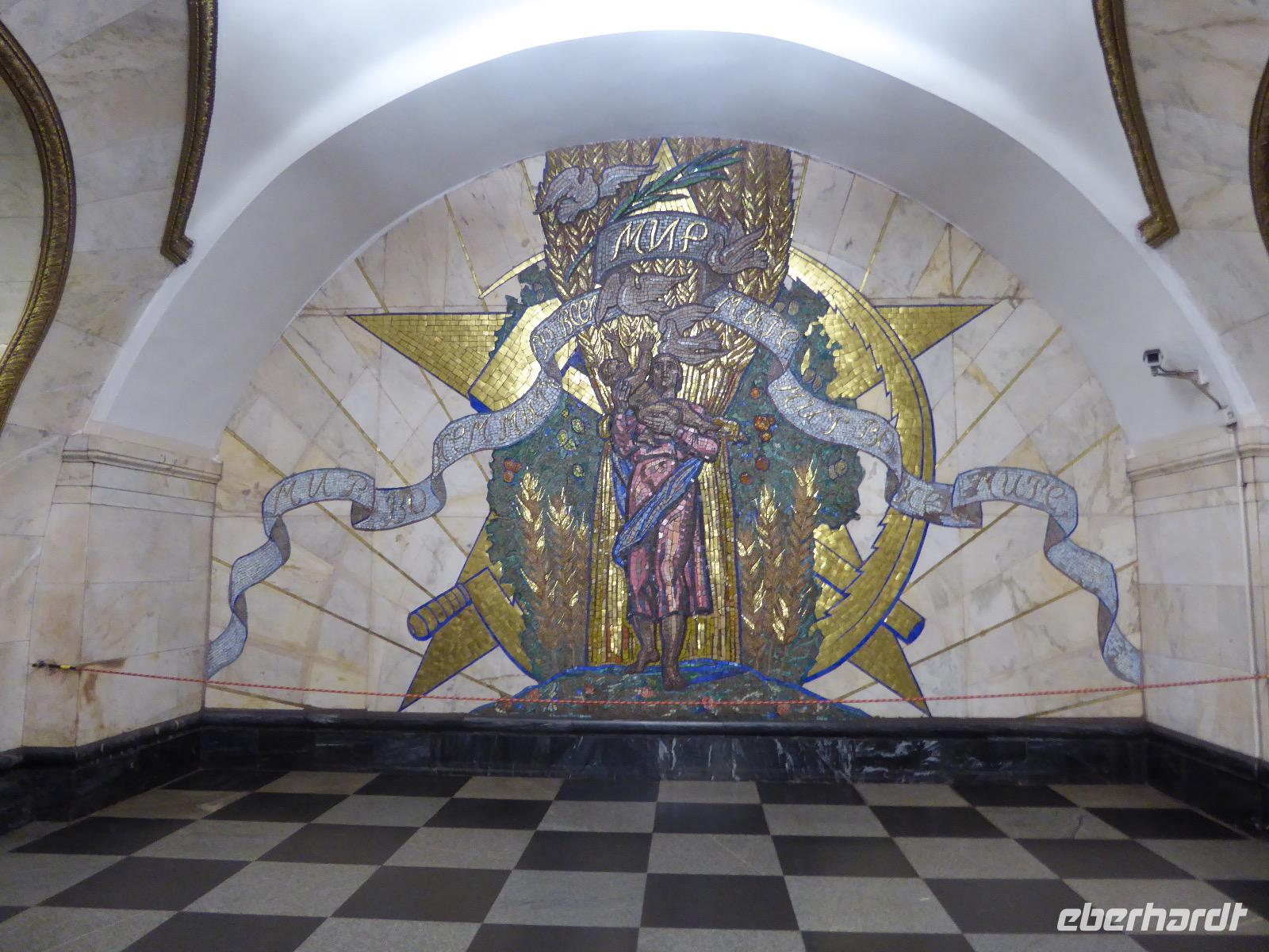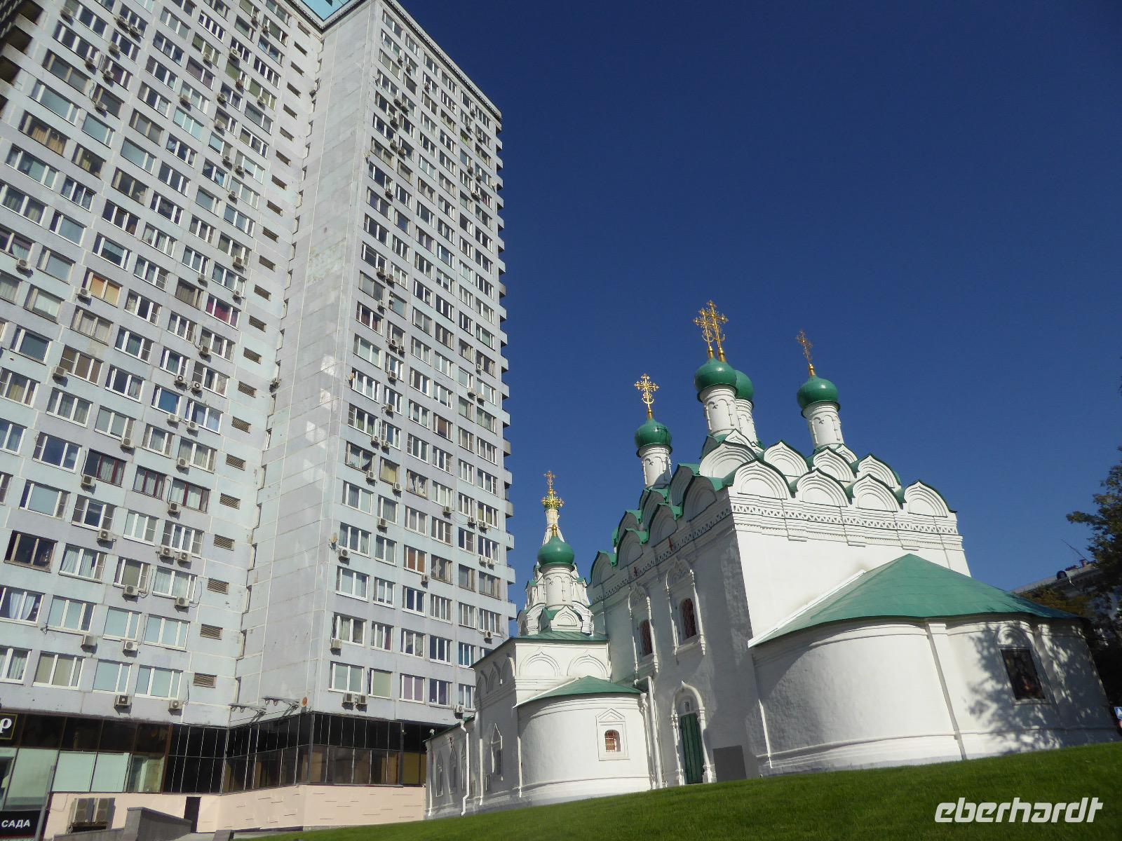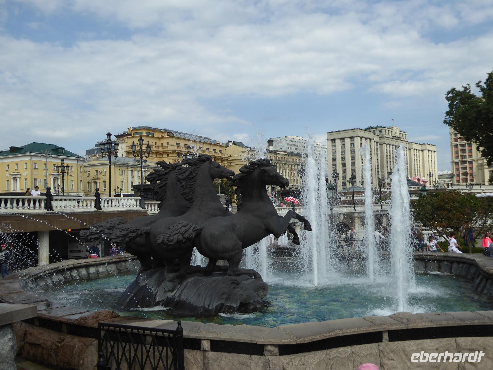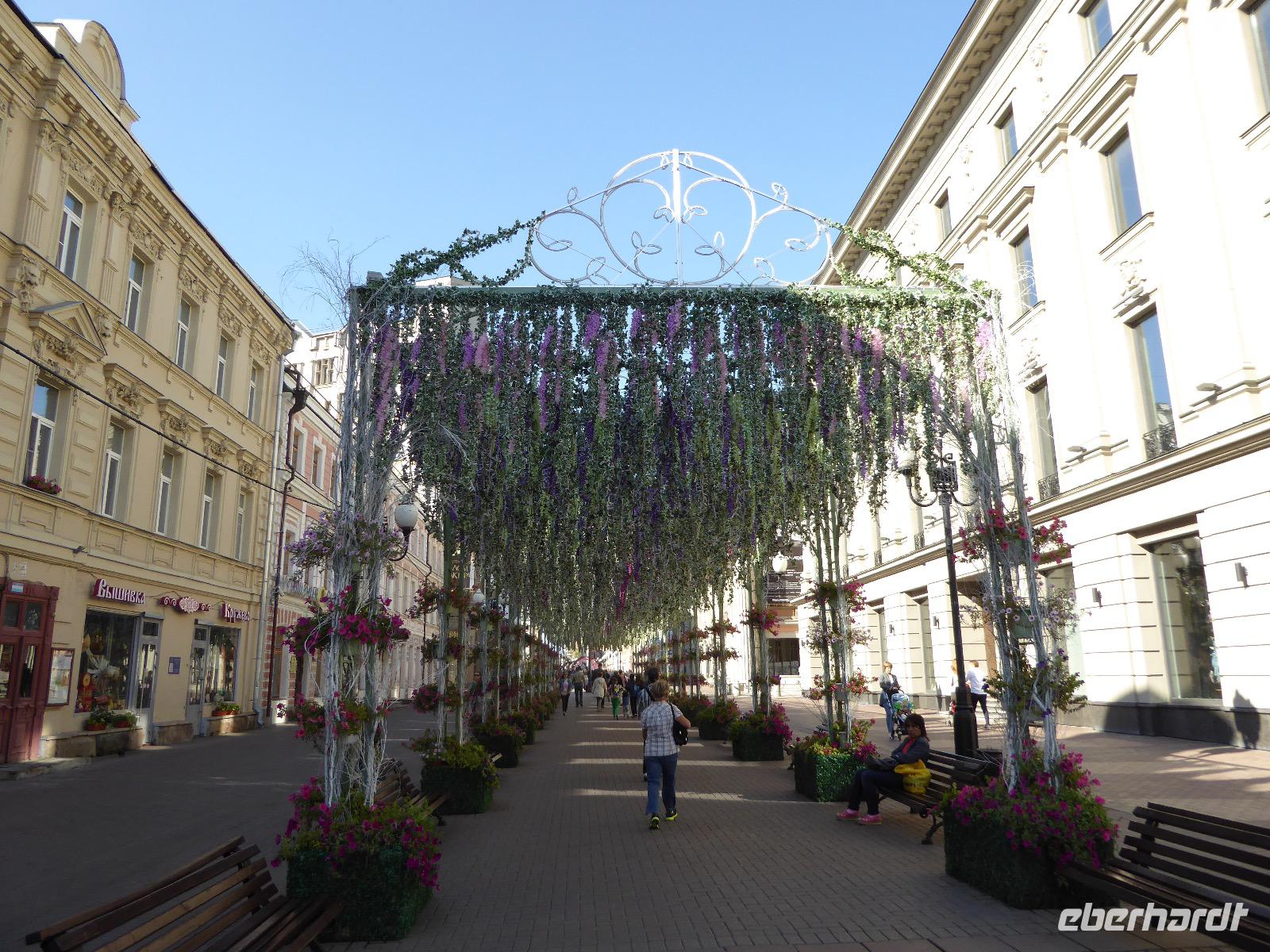 Der Tag beginnt mit einem gemütlichen Frühstück, gefolgt von einem Spaziergang zum Neuen Arbat. Wir erobern Moskau zu Fuß. Vorbei an hohen Wohnhäusern zwischen denen sich eine kleine Kirche mit grünen Zwiebelchen duckt, geht es bei schönstem Sonnenschein durch die Stadt. Hier eine bemalte Wand, dort ein blumengeschmückter Bogen, ein Souvenirgeschäft am anderen lockt uns, aber Valentina treibt uns an. Sie hat viel vor mit uns. Nun geht es in den Untergrund. Valentina hat die Fahrkarten gekauft und schleust uns durch die Schranke. Mit der Rolltreppe geht es steil Berg ab. Valentina ruft uns laut zu, wieviele Stationen wir fahren und wann wir wieder aussteigen müssen. Ein U-Bahnhof ist schöner als der andere. Ein Traum für jedes Fotografenherz. Irgendwann fahren wir wieder mit der Rolltreppe steil bergauf und sind in der Nähe vom Roten Platz. Wir spazieren durch das GUM, das allseits bekannte Kaufhaus Moskaus. Selbst die Toilette lädt zum Fotografieren ein. Der Rote Platz ist gesperrt. Es findet derzeit ein Musikfestival statt und große Tribühnen sind aufgebaut. So können wir Kreml und Basiliuskathedrale nur von Weitem bewundern. Valentina scheucht uns durch das Auferstehungstor Richtung Wachablösung, die wir auch pünktlich erreichen. Weiter geht es zum Pferdespringbrunnen am Alexandergarten und zum Mittagessen in einem ukrainischen Restaurant. Das Essen schmeckt hervorragend, wenn auch der schmucke Kellner nicht bereit ist, sich für unsere Fotoalben ablichten zu lassen. Am Nachmittag bewundern wir die Stadt noch einmal von der Wasserseite aus. Eine Schifffahrt auf der Moskwa rundet den Tag ab. Noch einmal wird der Tisch für uns reichlich gedeckt und dann fahren wir mit der Bahn zum Flughafen. So vermeiden wir es, in den Feierabendstau zu geraten und gemütlich ist es auch. Am Flughafen verabschieden wir uns von Valentina. Über Nacht fliegen wir nach Irkutsk. Baikalsee - wir kommen.