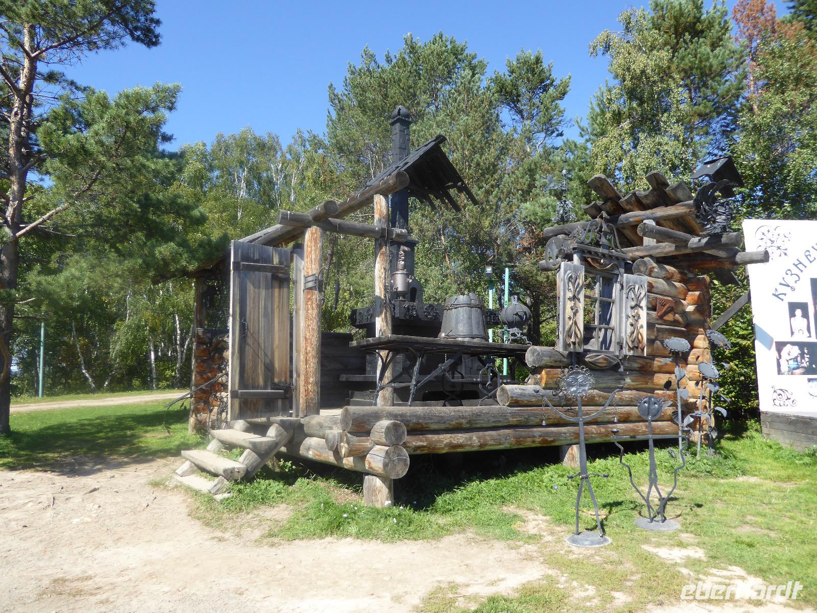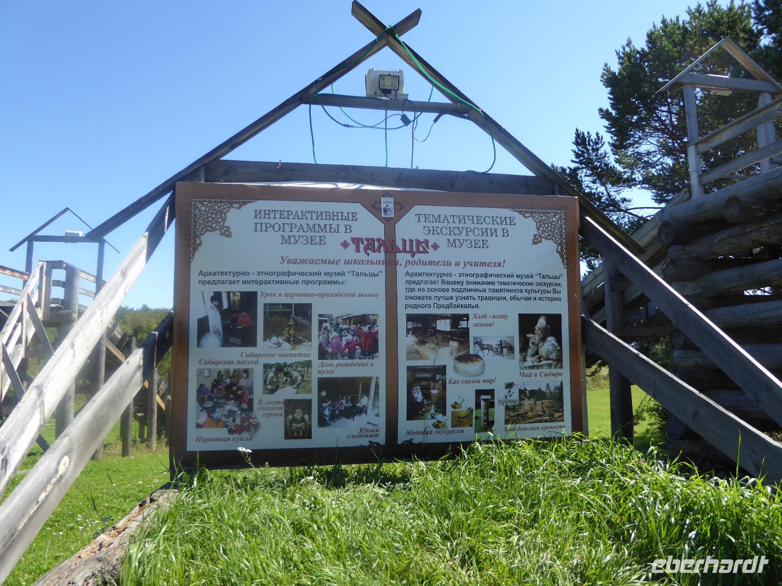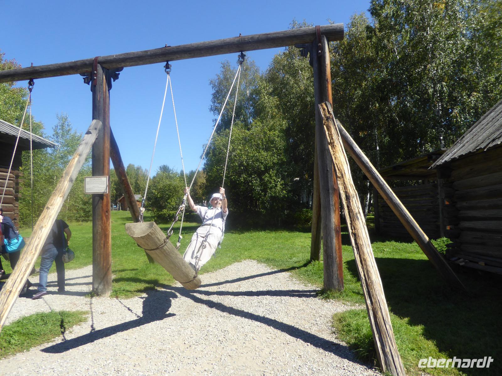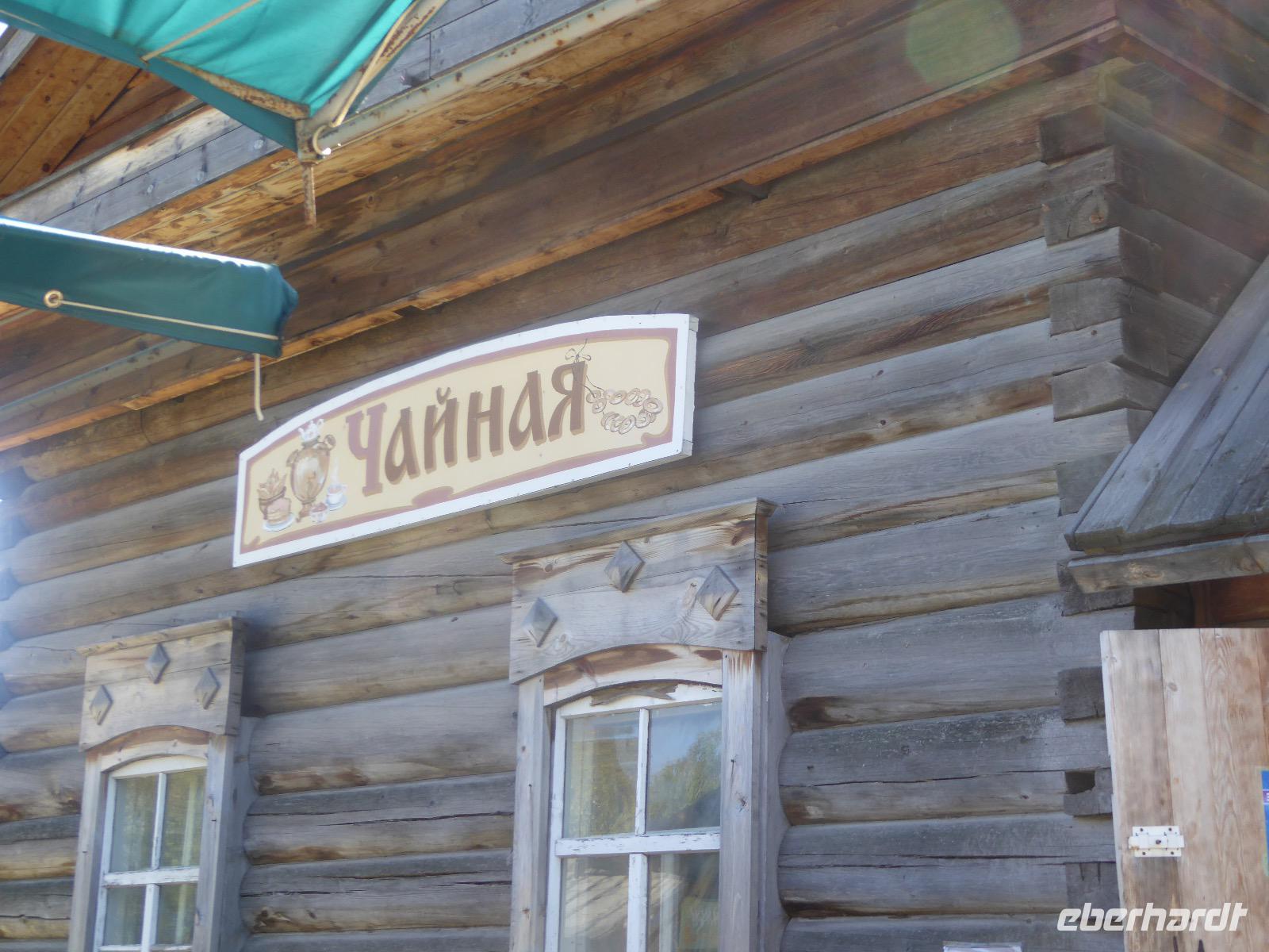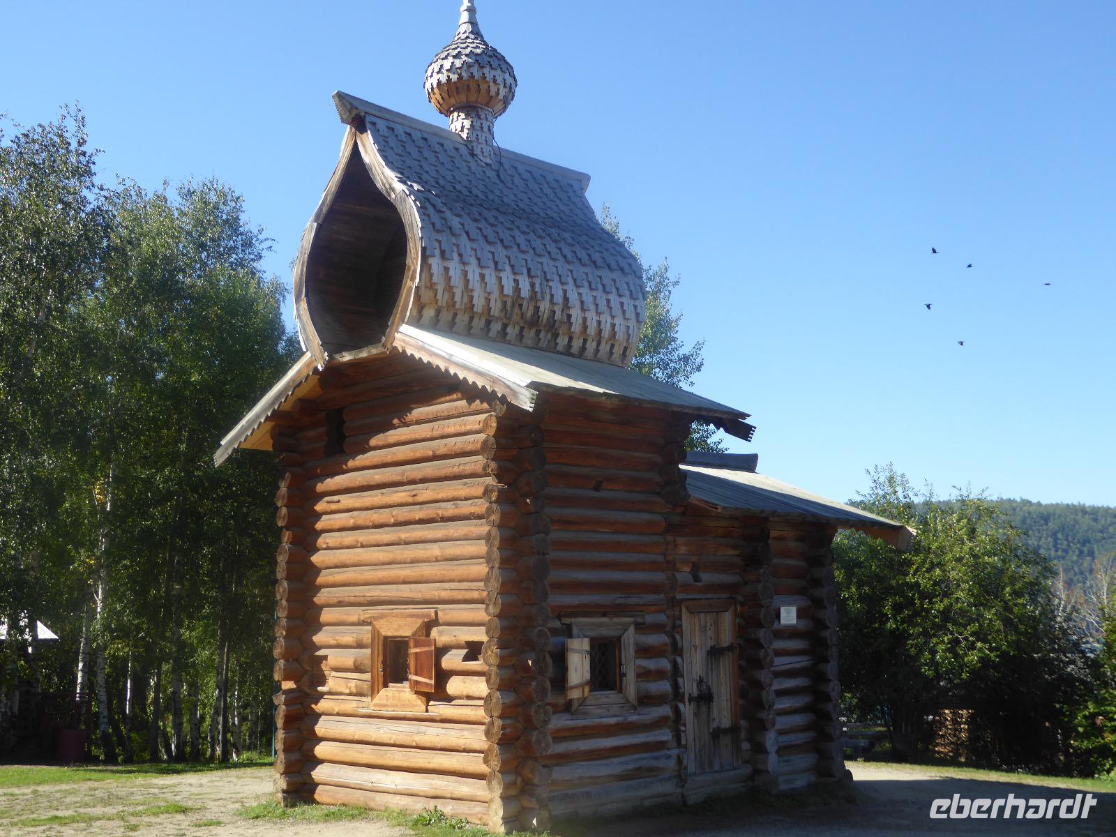 Am Vormittag besuchen wir als erstes die Swjato-Nikolski-Kirche. Kaufmann Xenofont Serebrjakow war im 19. Jahrhundert mit einem Schiff auf dem Baikalsee unterwegs als er in ein großes Unwetter geriet. Voller Inbrunst begann er zum Heiligen Nikolaus zu beten und diesen um seine Rettung anzuflehen. Das Wunder geschah. Der Kaufmann gelobte, zu Ehren des Heiligen Nikolaus eine Kirche zu errichten. Heute ist die Kirche wieder aus Holz, jedoch war sie viele Jahre aus Stein. Als der oberste Patriarch der russisch-orthodoxen Kirche Listwjanka besuchte, gab er den Gläubigen den Auftrag, die Kirche wieder mit Holz zu gestalten, denn so entspricht es den Traditionen der Russisch-Orthodoxen. Im Innern sind wunderschöne Ikonen des 18. Jahrhunderts zu sehen. Ein Mütterchen beäugt unsere Tanja argwöhnig, ob sie uns denn alles richtig erzähle. Kurzerhand übernimmt sie das selbst und fordert Tanja auf, eine weitere Geschichte zu erzählen. Diese handelt von Reliquien (in Form von sterblichen Überresten, die nach einem Brand in Irkutsk, in die Kirche von Listwjanka verbracht wurden. Sie zaubert aus einem hinteren Räumchen ein Foto hervor, auf dem deutlich zu sehen ist, wie der Geist des Verstorbenen über der Kirche schwebt (wissenschaftlich bewiesen natürlich). Wir bedanken uns bei Mütterchen Nina für die Erzählungen und verabschieden uns. Leider können wir ihre Einladung, in einer Stunde am Gottesdienst teilzunehmen, nicht annehmen. Uns erwartet das Freilichtmuseum Talzy. Hier besichtigen wir alte Bauernhäuser, die aus der gesamten Umgebung zusammengetragen wurden. In einem kleinen Museumsraum sind Kleidungsstücke (Ritterrüstungen), Waffen, Münzen und andere historische Gegenstände ausgestellt. Das Besondere aber, was wir erleben, sind zwei Männer, die uns mit großartigen Kosakenliedern erfreuen. Anschließend schauen wir weitere Gebäude von Innen und Außen an. Ziemlich klein sind die Häuschen, mit traditionellem Bett auf der Ofenbank und schönem Samowar. Dem Verwalter, der die Steuern eintrieb, ging es besser. Das können wir an der Ausstattung seines Hauses sehen. Vor dem Mittagessen bleibt Zeit, Souvenire einzukaufen. Mit uns kann man gute Geschäfte machen. Im Garten der Tschainaja - Teestube, sind wir zu einem Mittagessen mit russischen Spezialitäten eingeladen. Zur Vorspeise gibt es einen Weißkrautsalat mit Preiselbeeren und eine Pelmenisuppe. Das Hauptgericht ist ein gebackener Omul und zum Nachtisch gibt es Blini mit süßer Milchsoße. Als Getränke werden warmer Sanddornsaft (hmmm, ein Gedicht!) und Tee gereicht. Rundum gesättigt besichtigen wir den letzten Teil des Museums, die burjatische Abteilung. Diese befindet sich in einer Jurte, wo allerlei Zauberzeug käuflich erworben werden kann. Dazu gehören verschiedene Kräutertees, Metallschalen, deren Klang alle Weh-Wehchen heilen kann und vieles mehr. Außerdem kann man sich als burjatische Heldin verkleiden und sich in dieser Tracht fotografieren lassen. Wir haben unseren Spaß. Gleich um die Ecke haben wir ein anderes Kunstwerk entdeckt. Das Häuschen von Babajaga ist hier aus Metall erbaut. Wir nutzen die Gelegenheit, um unser Gruppenfoto zu schießen. Nun müssen wir aber weiter, denn wir wollen noch das Limnologische Museum besichtigen. Unser Fahrer Alexander ist so nett und setzt uns nicht auf dem Parkplatz ab, sondern fährt uns zu einem kleinen Trampelpfad, der steil, aber direkt zum Eingang führt. Im Baikal-Museum, einer Abteilung des Limnologischen Museums, erzählt uns Tanja, wie der Baikalsee geologisch entstanden ist. Außerdem gibt es Aquarien, in denen alle Lebewesen des Baikalsee zu sehen sind. Besonders putzig sind die Baikalrobben, die unermüdlich ihre Runden drehen. Von artgerechter Haltung hat man hier wahrscheinlich noch nichts gehört, trotzdem macht es uns Vergnügen, den Robben zuzuschauen. Unser letztes Abenteuer für heute ist die Fahrt mit dem Sessellift auf einen Aussichtspunkt, von dem wir eine hervorragende Sicht über den Baikalsee haben. Während wir nach oben rauschen, kommen uns auf der anderen Seite Chinesen entgegen. Irgendwann fangen wir an, sie mit Ni Hau zu grüßen und können dann gar nicht mehr aufhören. Was für ein Spaß! Für beide Seiten. Danke, Tanja, das war eine gute Idee. Das Abendessen nehmen wir in einem Restaurant in der Nähe des Hotels ein. Es gibt nur drei Gänge und keinen Omul. Nein, satt geworden sind wir trotzdem. Als Geschenk bekommen wir jeder einen Zedernzapfen, den man auseinanderrupfen muss, um an die leckeren Kerne zu kommen. Unser voller Bauch schreit nach einem Abendspaziergang. Außerdem wollen wir Wodka für die Lieben daheim einkaufen. Wie wäre es also mit einem Spaziergang zum Magasin Kopeka? Gesagt getan. An allen Regalen im Magasin stehen Schilder mit der Aufschrift - nicht zu verkaufen -. Wir lachen, ein Laden, in dem man nichts kaufen darf? Des Rätsels Lösung heißt: Schulanfang. Am 1. September darf kein Alkohol verkauft werden. Schade. Also gehen wir zurück ins Hotel, verabschieden uns, von denen, die schlafen gehen und nehmen noch ein Bierchen, heute für 190 Rubel und gezapft. Gute Nacht.
