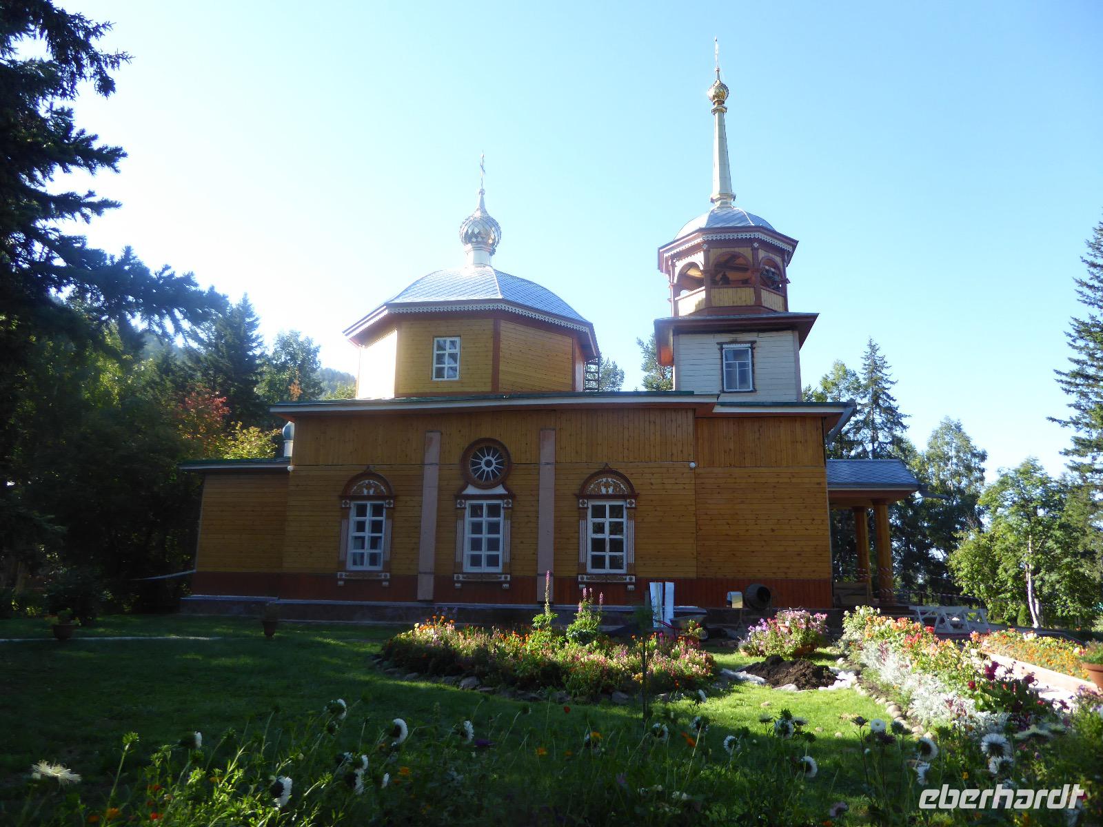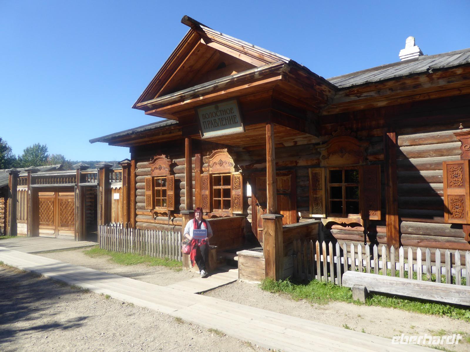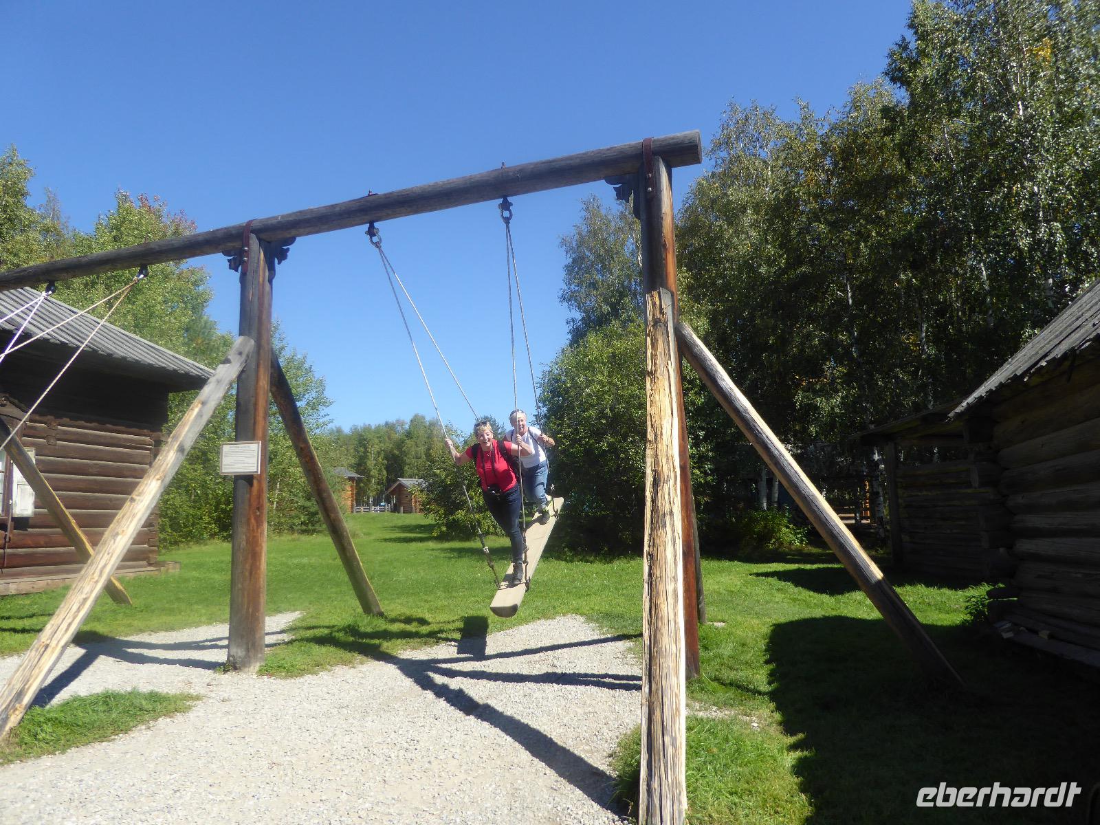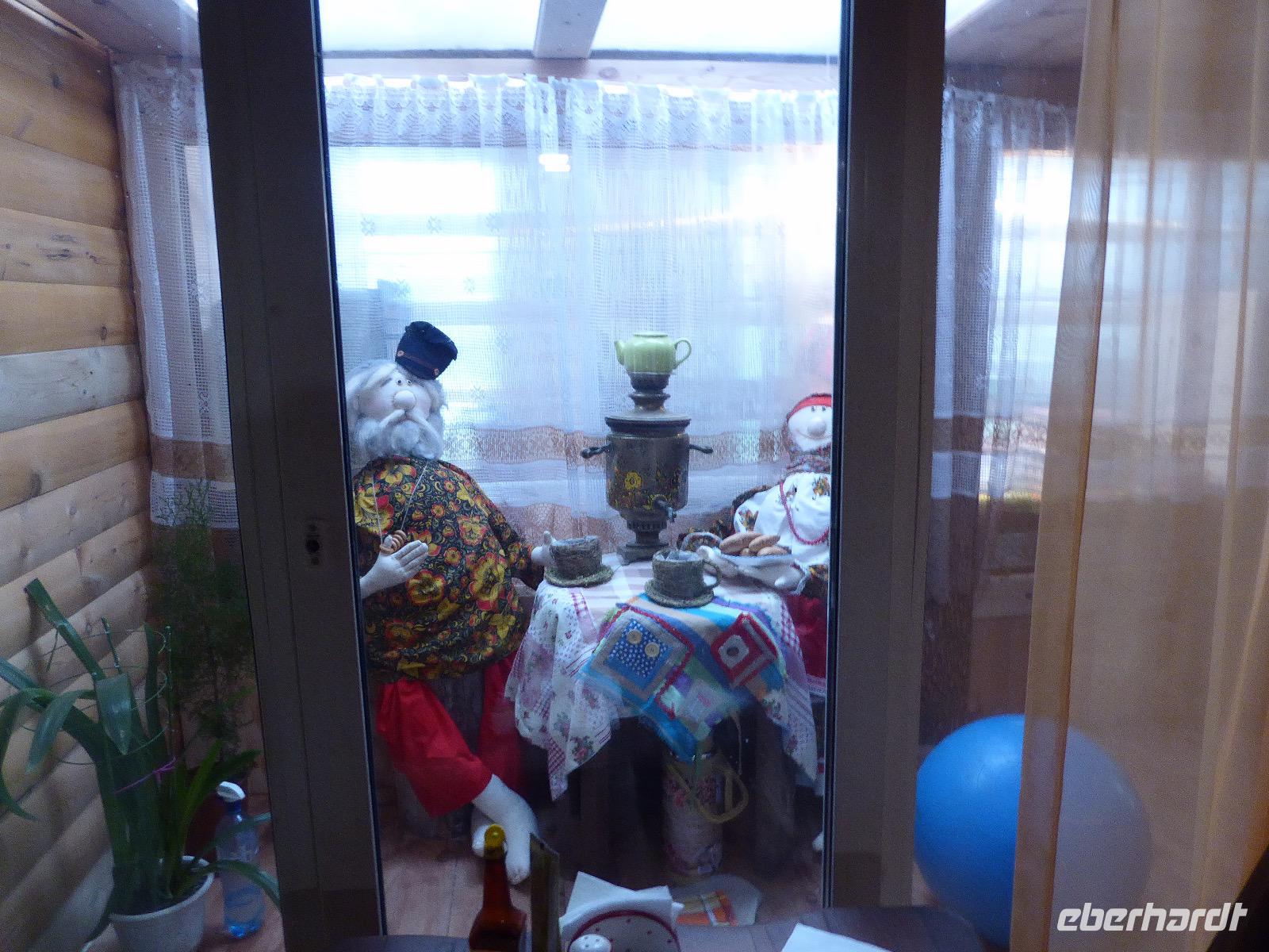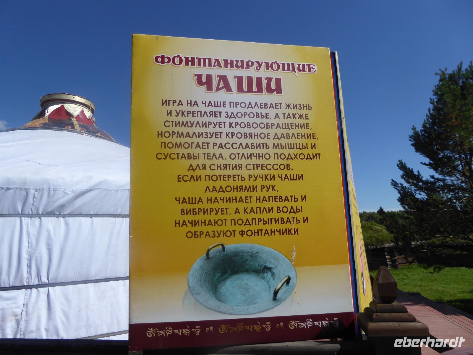 Am Vormittag besuchen wir als erstes die Swjato-Nikolski-Kirche. Kaufmann Xenofont Serebrjakow war im 19. Jahrhundert mit einem Schiff auf dem Baikalsee unterwegs als er in ein großes Unwetter geriet. Voller Inbrunst begann er zum Heiligen Nikolaus zu beten und diesen um seine Rettung anzuflehen. Das Wunder geschah. Der Kaufmann gelobte, zu Ehren des Heiligen Nikolaus eine Kirche zu errichten. Heute ist die Kirche wieder aus Holz, jedoch war sie viele Jahre aus Stein. Als der oberste Patriarch der russisch-orthodoxen Kirche Listwjanka besuchte, gab er den Gläubigen den Auftrag, die Kirche wieder mit Holz zu gestalten, denn so entspricht es den Traditionen der Russisch-Orthodoxen. Im Innern sind wunderschöne Ikonen des 18. Jahrhunderts zu sehen. Ein Mütterchen beäugt unsere Tanja argwöhnig, ob sie uns denn alles richtig erzähle. Kurzerhand übernimmt sie das selbst und fordert Tanja auf, eine weitere Geschichte zu erzählen. Diese handelt von Reliquien (in Form von sterblichen Überresten, die nach einem Brand in Irkutsk, in die Kirche von Listwjanka verbracht wurden. Sie zaubert aus einem hinteren Räumchen ein Foto hervor, auf dem deutlich zu sehen ist, wie der Geist des Verstorbenen über der Kirche schwebt (wissenschaftlich bewiesen natürlich). Wir bedanken uns bei Mütterchen Nina für die Erzählungen und verabschieden uns. Leider können wir ihre Einladung, in einer Stunde am Gottesdienst teilzunehmen, nicht annehmen. Uns erwartet das Freilichtmuseum Talzy. Hier besichtigen wir alte Bauernhäuser, die aus der gesamten Umgebung zusammengetragen wurden. In einem kleinen Museumsraum sind Kleidungsstücke (Ritterrüstungen), Waffen, Münzen und andere historische Gegenstände ausgestellt. Das Besondere aber, was wir erleben, sind zwei Männer, die uns mit großartigen Kosakenliedern erfreuen. Anschließend schauen wir weitere Gebäude von Innen und Außen an. Ziemlich klein sind die Häuschen, mit traditionellem Bett auf der Ofenbank und schönem Samowar. Dem Verwalter, der die Steuern eintrieb, ging es besser. Das können wir an der Ausstattung seines Hauses sehen. Vor dem Mittagessen bleibt Zeit, Souvenire einzukaufen. Mit uns kann man gute Geschäfte machen. Im Garten der Tschainaja - Teestube, sind wir zu einem Mittagessen mit russischen Spezialitäten eingeladen. Zur Vorspeise gibt es einen Weißkrautsalat mit Preiselbeeren und eine Pelmenisuppe. Das Hauptgericht ist ein gebackener Omul und zum Nachtisch gibt es Blini mit süßer Milchsoße. Als Getränke werden warmer Sanddornsaft (hmmm, ein Gedicht!) und Tee gereicht. Rundum gesättigt besichtigen wir den letzten Teil des Museums, die burjatische Abteilung. Diese befindet sich in einer Jurte, wo allerlei Zauberzeug käuflich erworben werden kann. Dazu gehören verschiedene Kräutertees, Metallschalen, deren Klang alle Weh-Wehchen heilen kann und vieles mehr. Außerdem kann man sich als burjatische Heldin verkleiden und sich in dieser Tracht fotografieren lassen. Wir haben unseren Spaß. Gleich um die Ecke haben wir ein anderes Kunstwerk entdeckt. Das Häuschen von Babajaga ist hier aus Metall erbaut. Wir nutzen die Gelegenheit, um unser Gruppenfoto zu schießen. Nun müssen wir aber weiter, denn wir wollen noch das Limnologische Museum besichtigen. Unser Fahrer Alexander ist so nett und setzt uns nicht auf dem Parkplatz ab, sondern fährt uns zu einem kleinen Trampelpfad, der steil, aber direkt zum Eingang führt. Im Baikal-Museum, einer Abteilung des Limnologischen Museums, erzählt uns Tanja, wie der Baikalsee geologisch entstanden ist. Außerdem gibt es Aquarien, in denen alle Lebewesen des Baikalsee zu sehen sind. Besonders putzig sind die Baikalrobben, die unermüdlich ihre Runden drehen. Von artgerechter Haltung hat man hier wahrscheinlich noch nichts gehört, trotzdem macht es uns Vergnügen, den Robben zuzuschauen. Unser letztes Abenteuer für heute ist die Fahrt mit dem Sessellift auf einen Aussichtspunkt, von dem wir eine hervorragende Sicht über den Baikalsee haben. Während wir nach oben rauschen, kommen uns auf der anderen Seite Chinesen entgegen. Irgendwann fangen wir an, sie mit Ni Hau zu grüßen und können dann gar nicht mehr aufhören. Was für ein Spaß! Für beide Seiten. Danke, Tanja, das war eine gute Idee. Das Abendessen nehmen wir in einem Restaurant in der Nähe des Hotels ein. Es gibt nur drei Gänge und keinen Omul. Nein, satt geworden sind wir trotzdem. Als Geschenk bekommen wir jeder einen Zedernzapfen, den man auseinanderrupfen muss, um an die leckeren Kerne zu kommen. Unser voller Bauch schreit nach einem Abendspaziergang. Außerdem wollen wir Wodka für die Lieben daheim einkaufen. Wie wäre es also mit einem Spaziergang zum Magasin Kopeka? Gesagt getan. An allen Regalen im Magasin stehen Schilder mit der Aufschrift - nicht zu verkaufen -. Wir lachen, ein Laden, in dem man nichts kaufen darf? Des Rätsels Lösung heißt: Schulanfang. Am 1. September darf kein Alkohol verkauft werden. Schade. Also gehen wir zurück ins Hotel, verabschieden uns, von denen, die schlafen gehen und nehmen noch ein Bierchen, heute für 190 Rubel und gezapft. Gute Nacht.