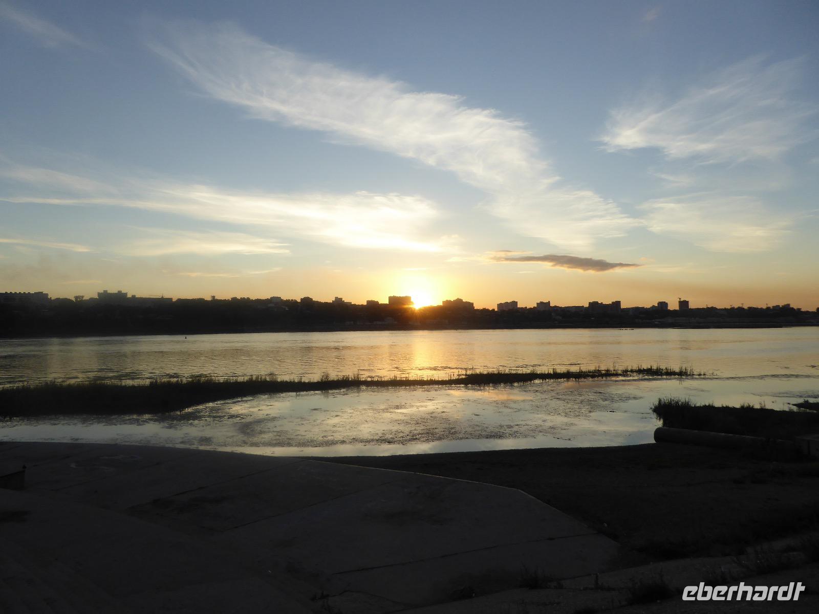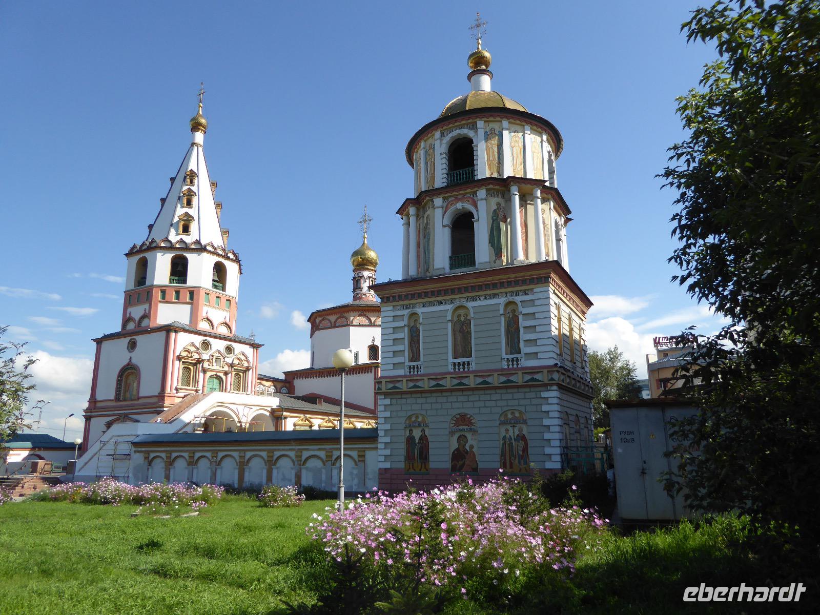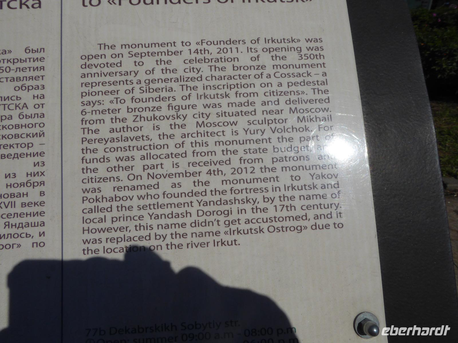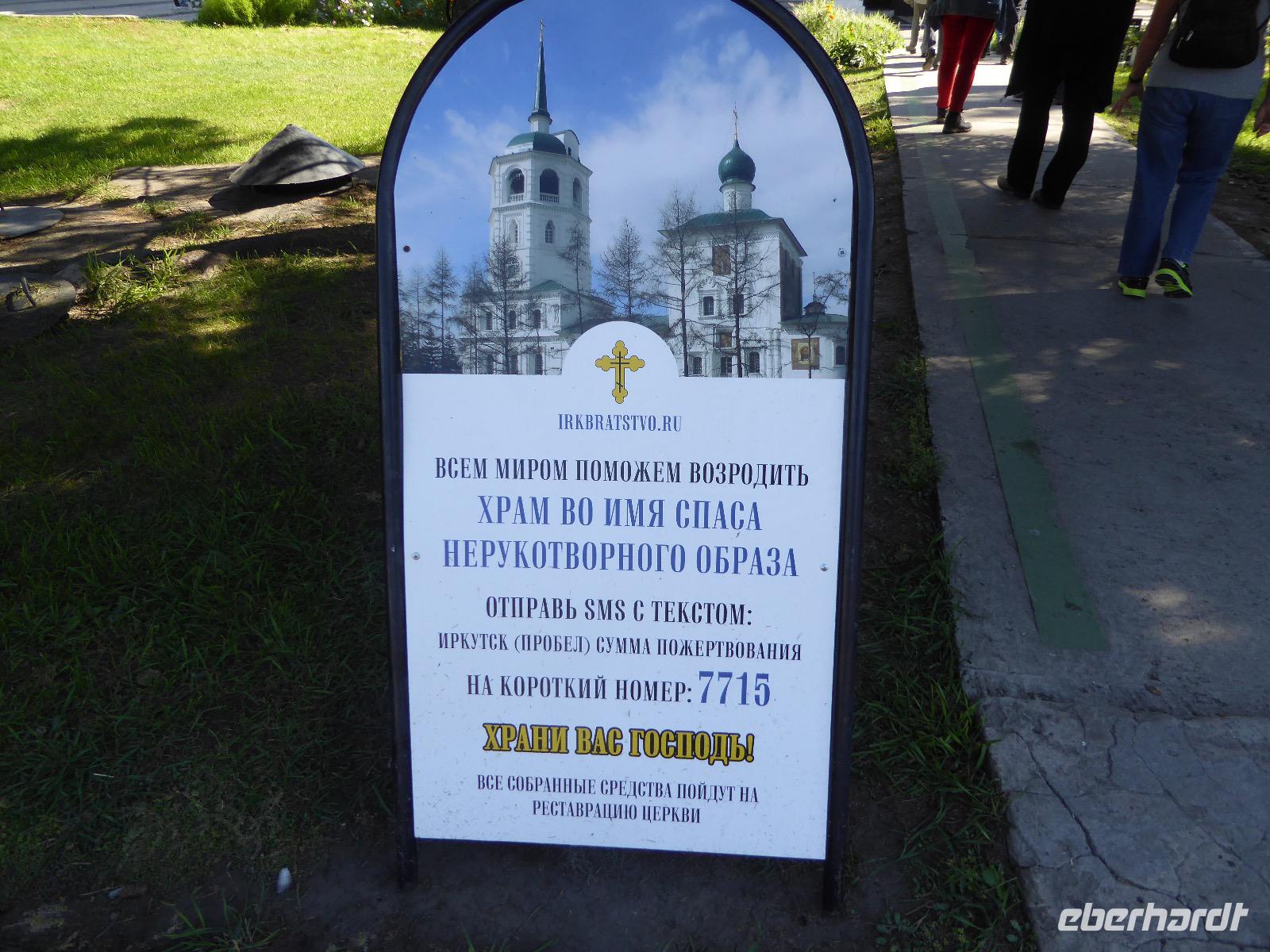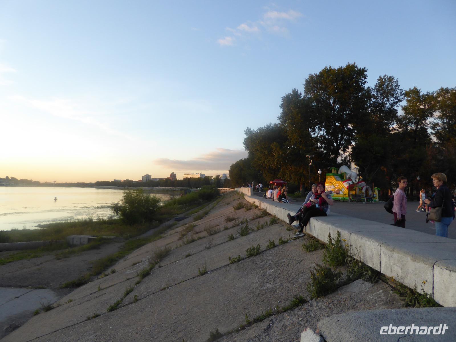 Frühmorgens kommen wir in Irkutsk an. Nach 5 Stunden plus 10 Minuten Flug etwas müde. Tanja erwartet uns bereits am Ausgang. Sie ist unternehmungslustig und freut sich auf einen schönen Tag mit uns. Gemeinsam holen wir das Gepäck (Achtung! Abschnitt aufheben!) und verstauen es im Gepäckbus. Wir Gäste quetschen uns in einen zweiten Bus, der ist so klein, trotzdem sind zwei Plätze frei. Zunächst bringen wir das Gepäck ins Hotel. Da wir kein Frühstück hatten, bringt uns Tanja zunächst in ein überraschend modernes Kaffee. Wer ahnt denn schon, dass es geschlagene zwei Stunden dauert, bis der letzte sinen Kaffee hat? Mit unserem Bus fahren wir nun durch Irkutsk. Erste Station: das Ewige Feuer. In 21 Städten Russlands brennt das Ewige Feuer, das an die Gefallenen des 2. Weltkriegs erinnert. Hier wurde es am 9. Mai 1975 entfacht. An besonderen Tagen halten irkutsker Schüler hier eine Ehrenwache. Auf den Granitplatten liegen (immer) frische Blumen. Wir besuchen die Erlöserkirche, die 1672 zum ersten Mal an diesem Platz errichtet wurde. Während der Sowjetzeit war die Kirche geschlossen, aber das Gebäude blieb erhalten. Von 1970 bis 1980 wurde die Kirche restauriert. Anschließend besuchen wir die polnische Kirche. Der Name kommt daher, dass polnische Verbannte die Kirche von ihren Spenden errichten ließen. In Polen gilt dies Kirche als polnisches Kulturerbe. Am Denkmal für den Kosakenführer Jakow Pochabow berichtet uns Tanja von der Geschichte Irkutsks. Das Land, auf dem sich die heutige Stadt befindet, wurde 1661 von eben genanntem Kosakenführer entdeckt und besiedelt. Etwa einhundert Jahre später enststand die erste Straße nach Moskau. Über diese wurde der Handel mit den Schätzen Sibiriens und Chinas abgewickelt, wodurch sich die Stadt elementar veränderte. Die nach Irkutsk verbannten Politischen trugen dazu bei, dass sich die Stadt zu einem kulturellen und wissenschaftlichen Zentrum entwickelte. Von der Geschichte der Stadt erfahren wir dann noch einiges bei einer ausgiebigen Führung durch das Heimatmuseum. Den Abend verbringen wir mit einem romantischen Spaziergang bei Sonnenuntergang an der Angara. Hier lassen wir uns auch das leckere russische Eis schmecken.