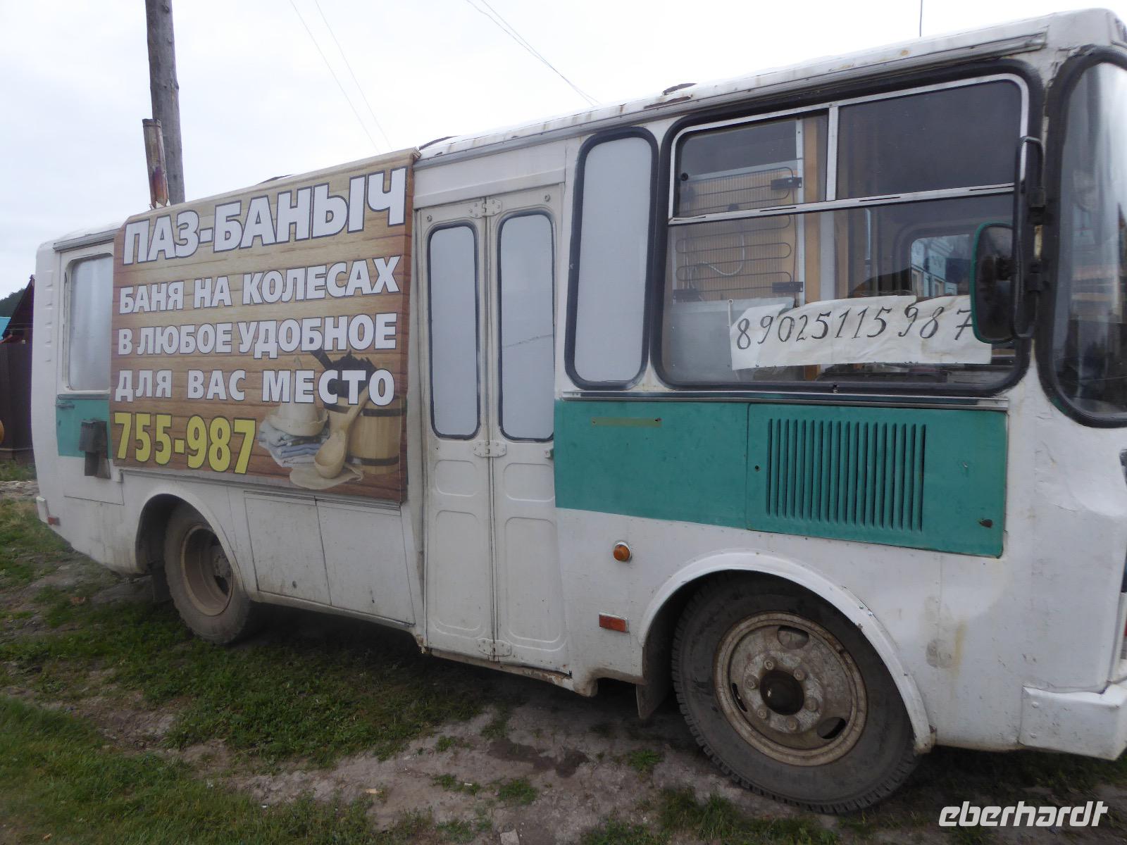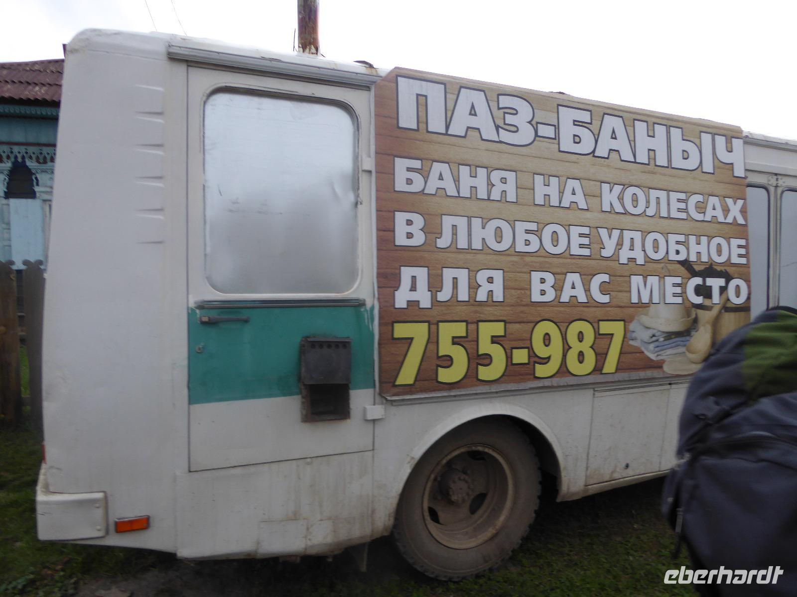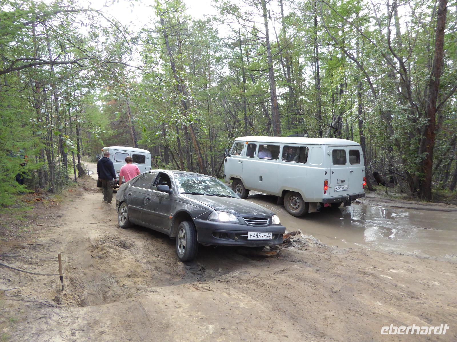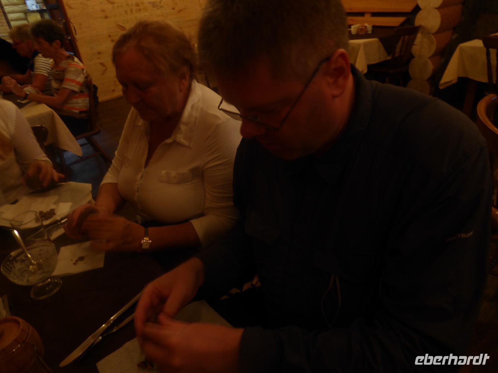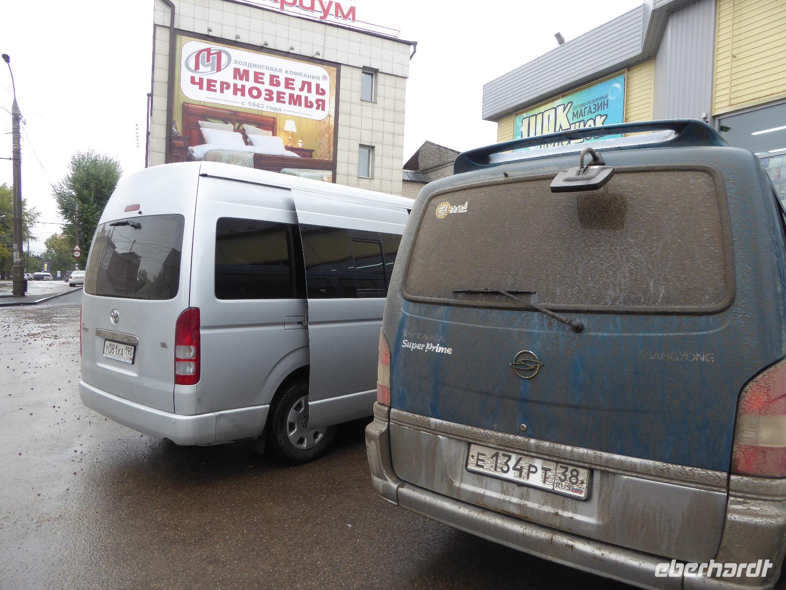 Noch einmal die leckeren Blinis, hmm. Alexander und Sergej verladen die Koffer. Heute verlassen wir Olchon. Am Fährhafen russische Verhältnisse. Eine Fähre ist kaputt. Die Autos stehen in langer Reihe an der anderen Fähre an. Tanja schlägt vor, dass wir als Fußgänger mit der nächsten (in einer halben Stunde) Fähre fahren und auf der anderen Seite auf die Autos warten. Dort sind die Souvenirläden besser bestückt. Gesagt getan. Bis Alexander und Sergej kommen, mischen wir die Souvenirgeschäfte auf. Kalender und ein Buch über die Insel Olchon sind bald ausverkauft. Um den Weg nach Irkutsk nicht langweilig werden zu lassen, steht der Besuch weiterer Felszeichnungen auf dem Programm. Doch zuerst gibt es Mittagessen im Restaurant Jurta. In Plastikschüsseln werden Salat, Soljanka und Posy serviert. Der Besuch des WCs entwickelt sich zu einem Abenteuer, da der entsprechende Schlüssel entweder weg ist und verzweifelt gesucht wird oder abgebrochen im Schloss hängen geblieben ist oder die Türen einfach nicht aufgehen wollen. Aber auch diese Hürde wird gemeistert und wir setzen unseren Rückweg fort. Kurz vor drei biegen wir von der asphaltierten Straße ab. Nur ein paar Meter weiter bleibt Alexander mit seinem Bus in einer Schlammpfütze stecken. Wir Sergej-Mitfahrer steigen aus und beobachten, wie er verzweifelt hin und her fährt und versucht, aus der Misere herauszukommen. Na hoffentlich wird da drin keinem schlecht. Es nutzt alles nichts. Auch Alexanders Fahrgäste müssen aussteigen. Nur drei sollen ganz hinten als Gewicht sitzen bleiben. Langsam macht sich Unmut breit. Müssen wir wirklich noch wandern? Können wir nicht weiterfahren. Tanja ist auch schon unruhig. Die Zeit rennt. Ich frage rum und die Meinung ist geteilt. Die einen wollen nach Irkutsk, die anderen (die wandern würden) verhalten sich neutral. Also entscheiden wir mit der Vernunft. Als es Sergej endlich gelungen ist, Alexanders Bus aus dem Matsch zu ziehen, fahren wir nach Irkutsk. Am Abend kommen wir im Hotel Imperia an. Was für ein Luxus. Bäder und Duschen! Nicht lange bleibt Zeit zum Ausruhen, denn unser Abendessen im russischen Ambiente wartet. Tanja hält eine kleine Abschiedsrede und spendiert Wodka, wir bedanken uns und haben auch für Tanja noch Überraschungsgeschenke dabei. Nach dem Essen spazieren wir durch das beleuchtete Irkutsk und begeben uns zu unserer letzten Nachtruhe auf russischem Boden.